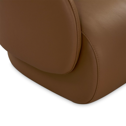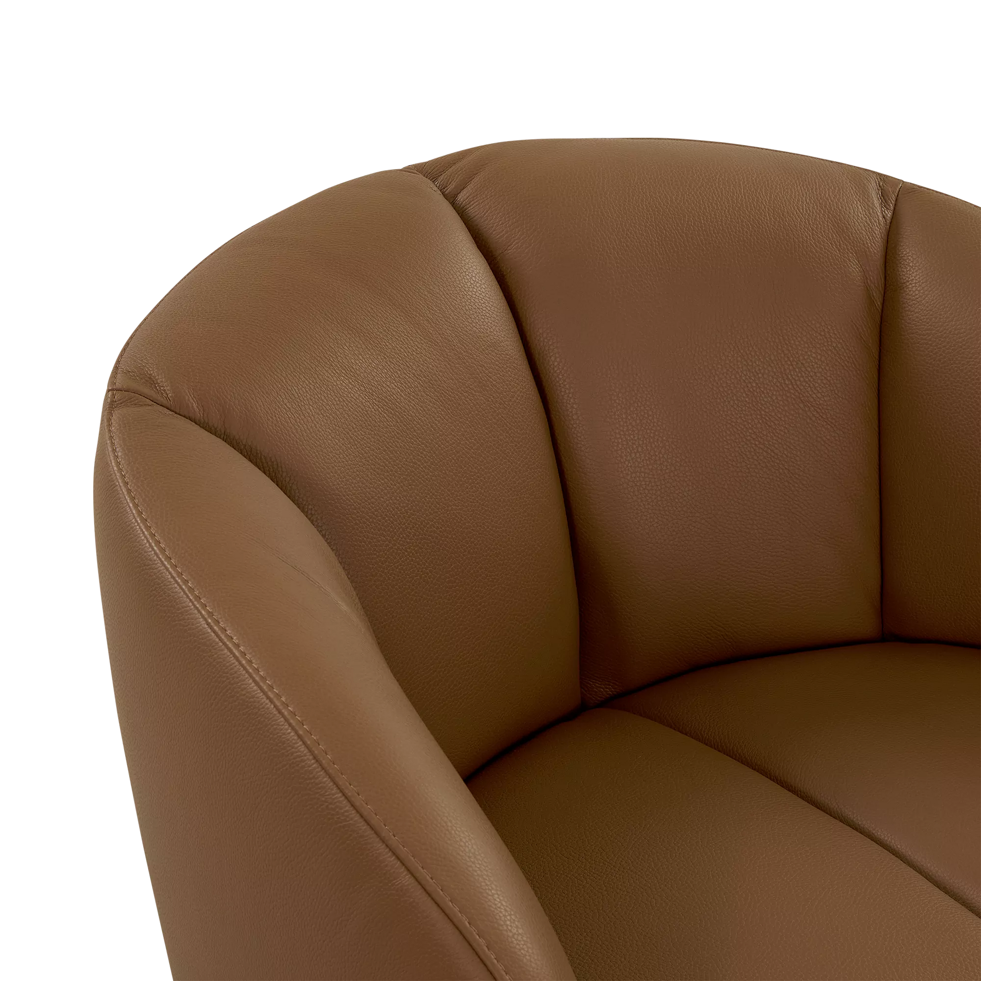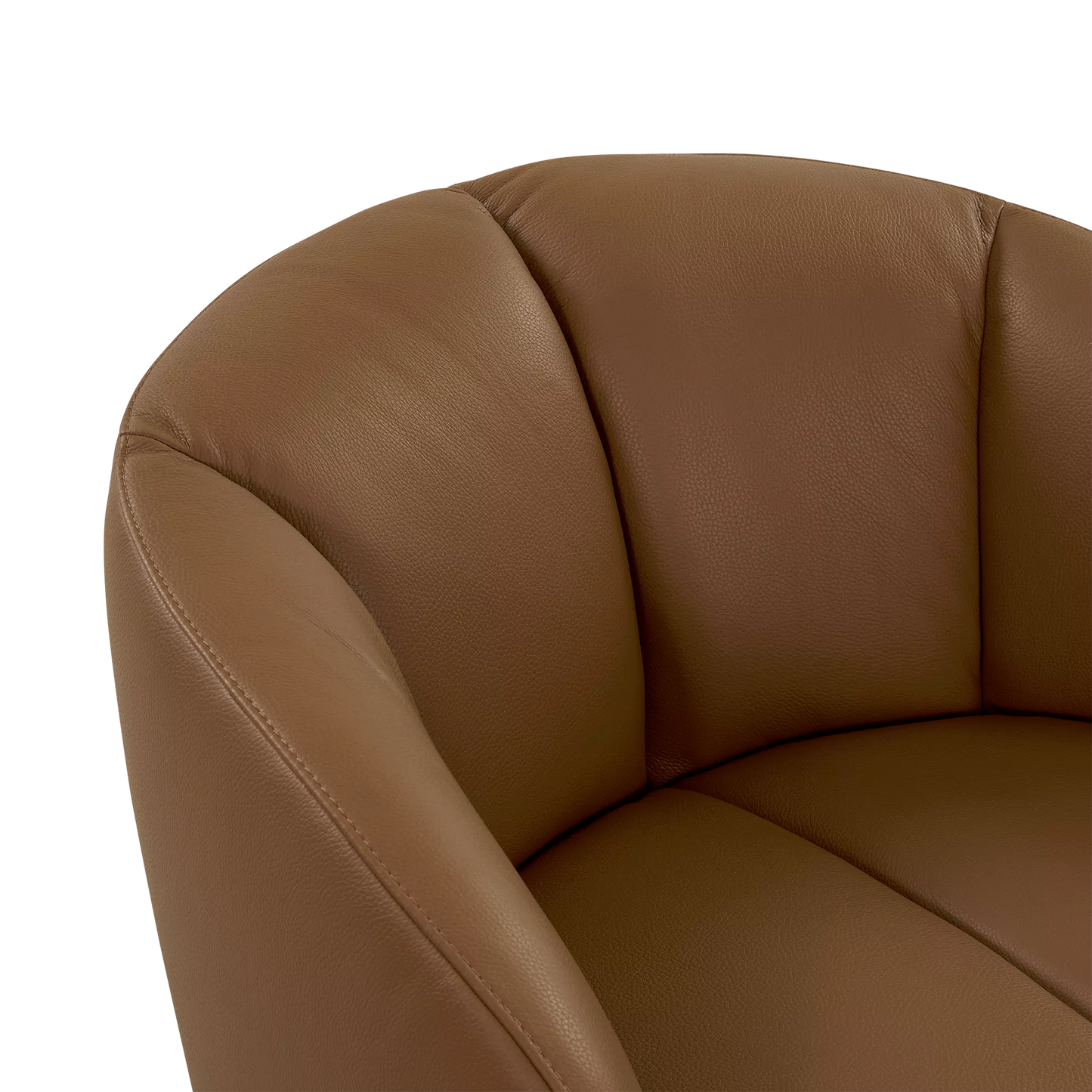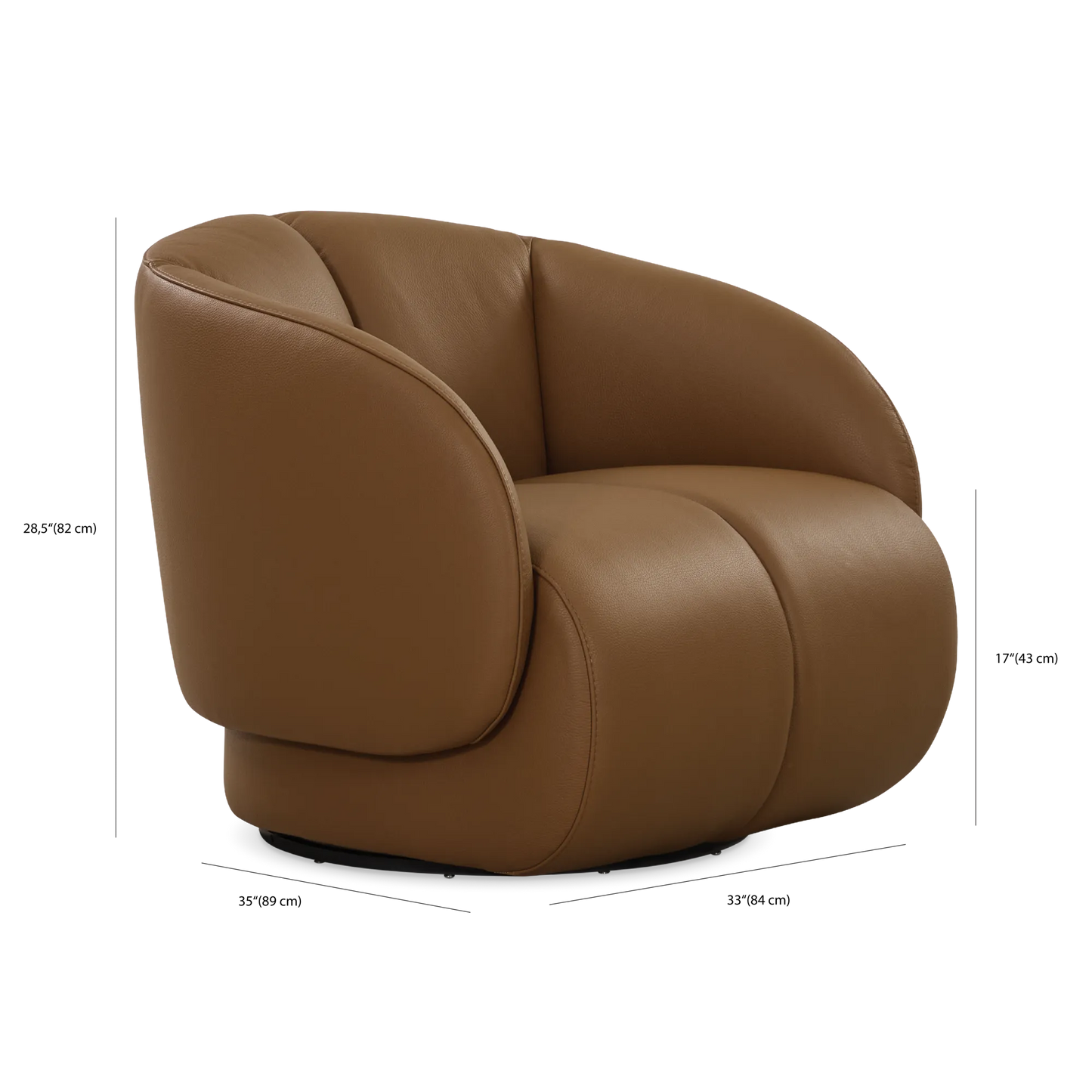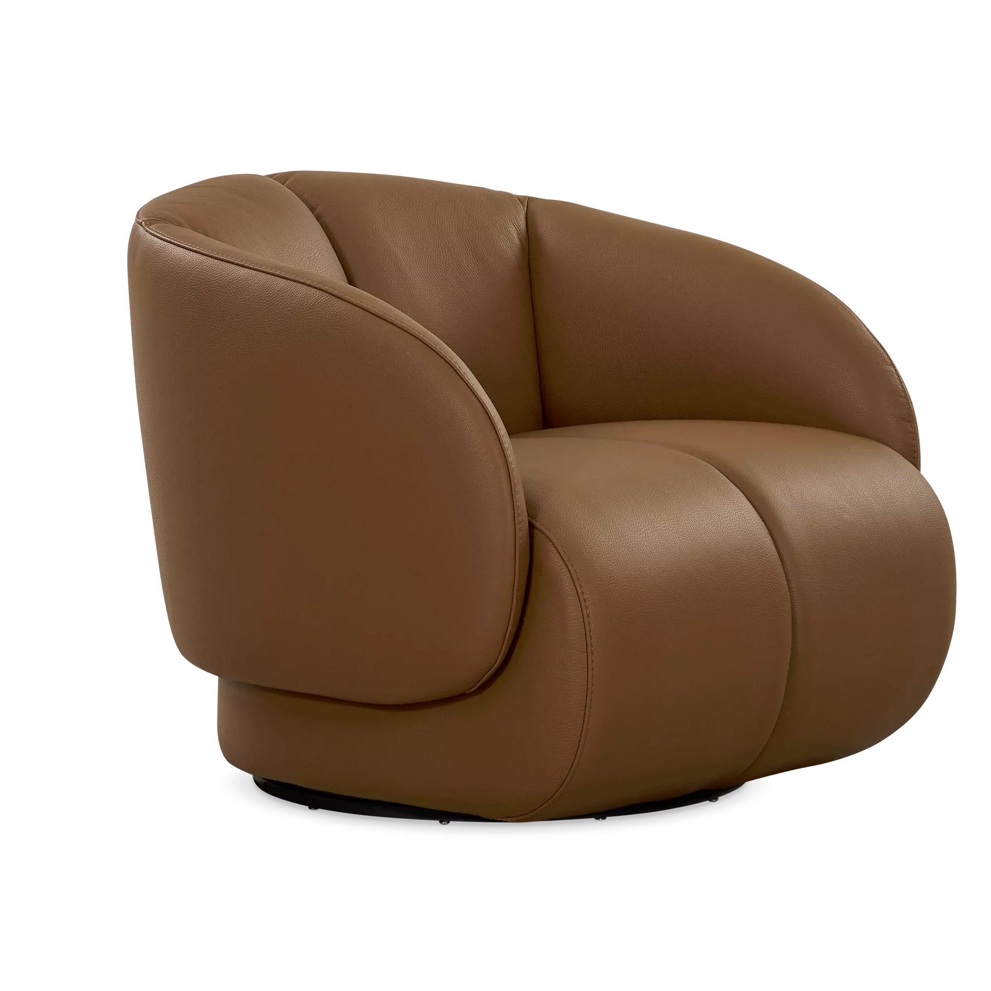 The Halo swivel chair it at once sculptural and inviting. Its continuous silhouette curves gracefully, enveloping the body in plush comfort and modern ease. Upholstered in sumptuous leather, it will bring a luxurious touch to any living space with its rich finish and refined tufting. A 360-degree swivel base enhances its dynamic presence, making it as functional as it is captivating. An artful addition that’s ready to anchor any living room or reading nook.