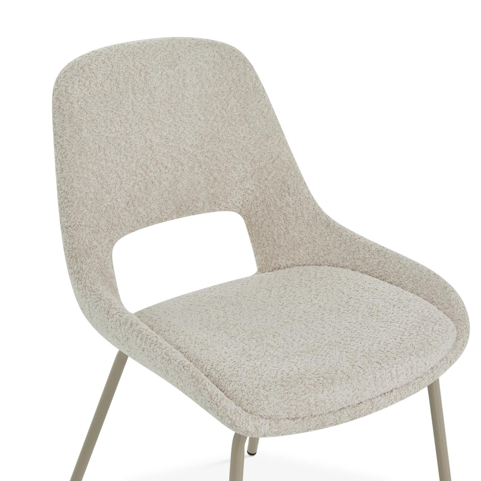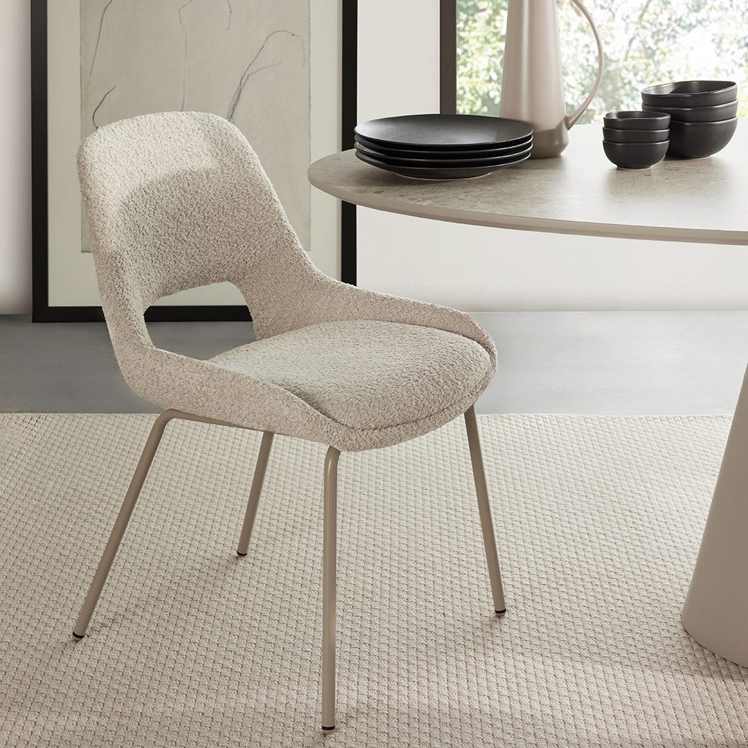 Hamar has no shortage of comfort or style. Enjoy leisurely meals comfortably perched on the plush seat of this entirely-Scandi-inspired dining chair. Its angled legs, available in metal or natural oak, contrasts beautifully with its bouclé fabric upholstery.