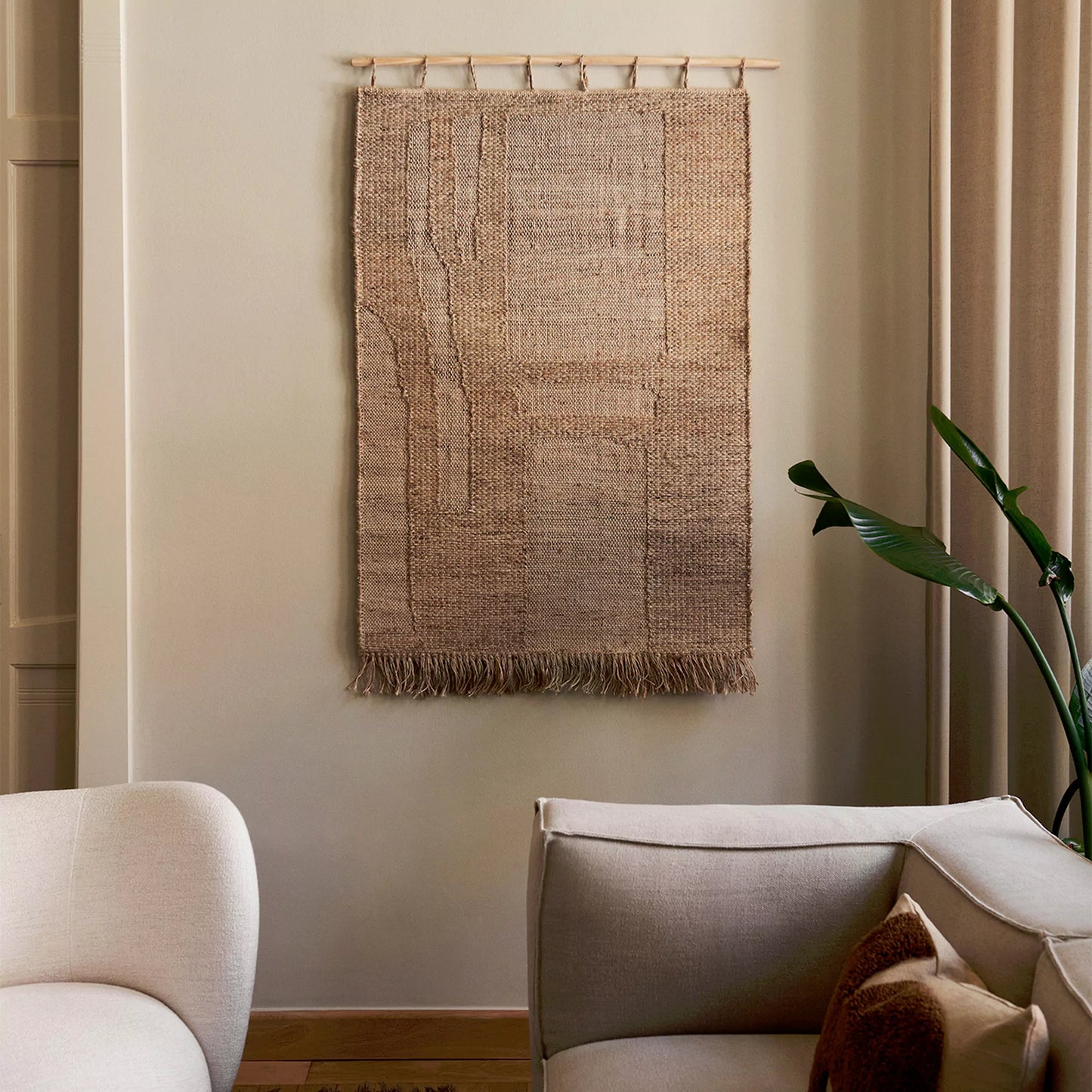The Harvest wall rug brings organic warmth to your walls. Its abstract pattern, loose fringes and natural jute express a confident, handcrafted spirit. Suspended from a wooden rod, it blends effortlessly into your décor.