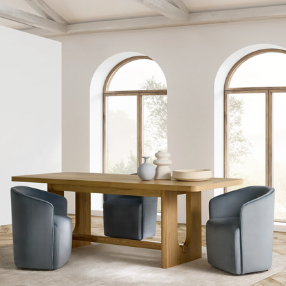 The Hedy chair, upholstered in velvet and featuring an open back, blends elegance with lightness. Its refined silhouette evokes a small armchair while keeping a modern feel. It pairs easily with wood, marble, or contemporary dining tables.