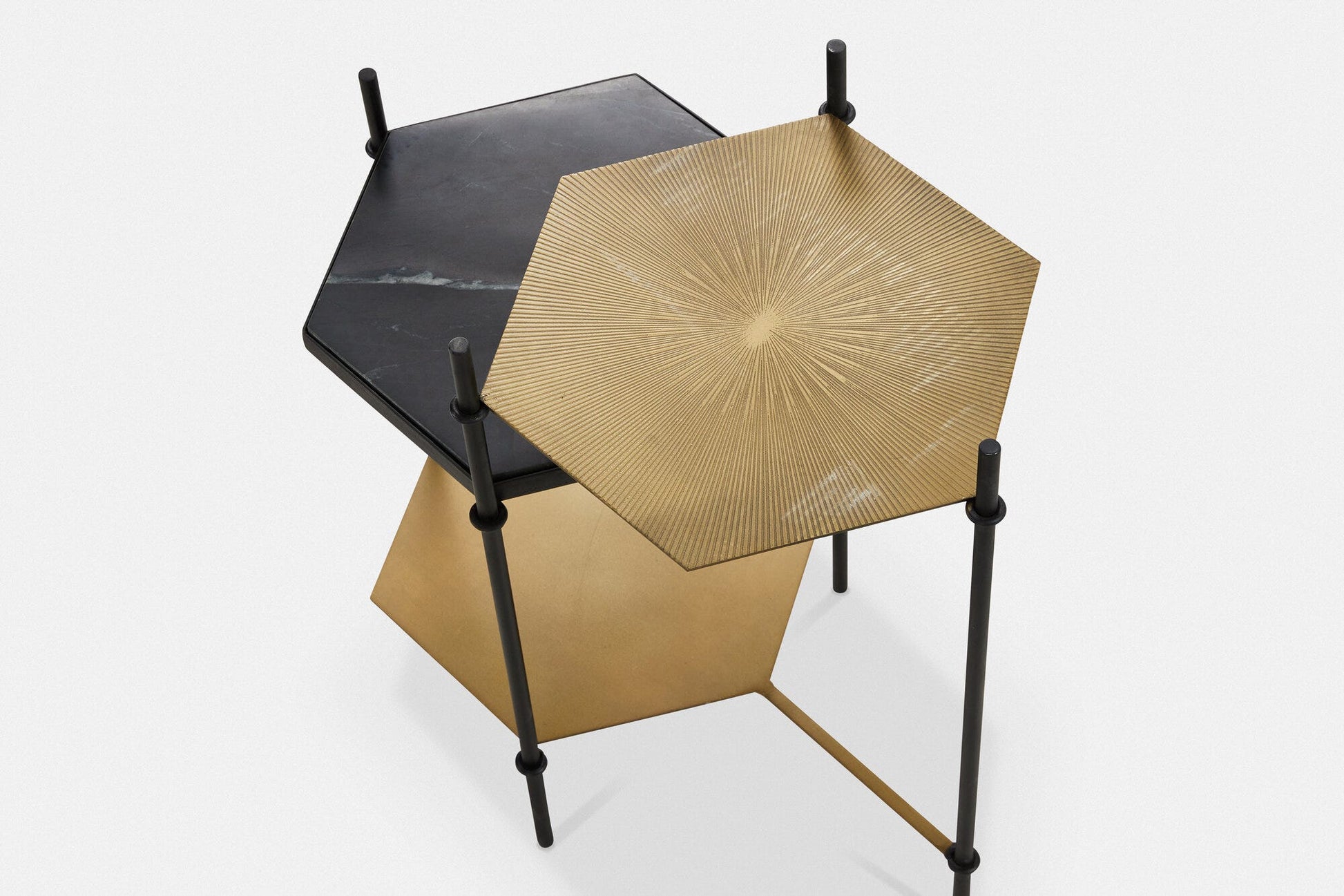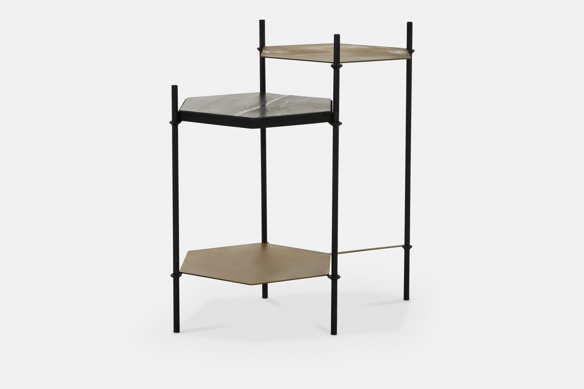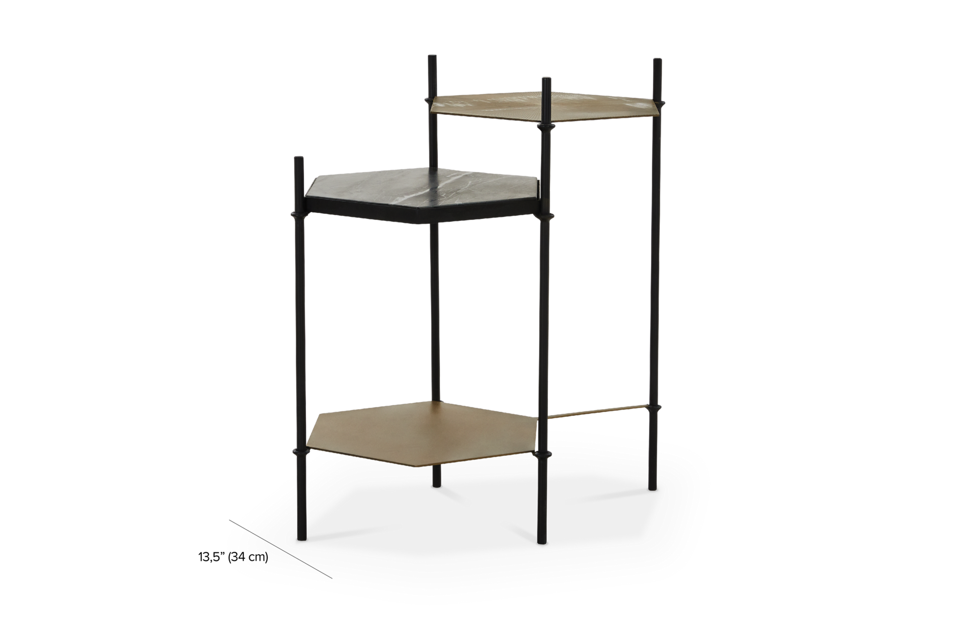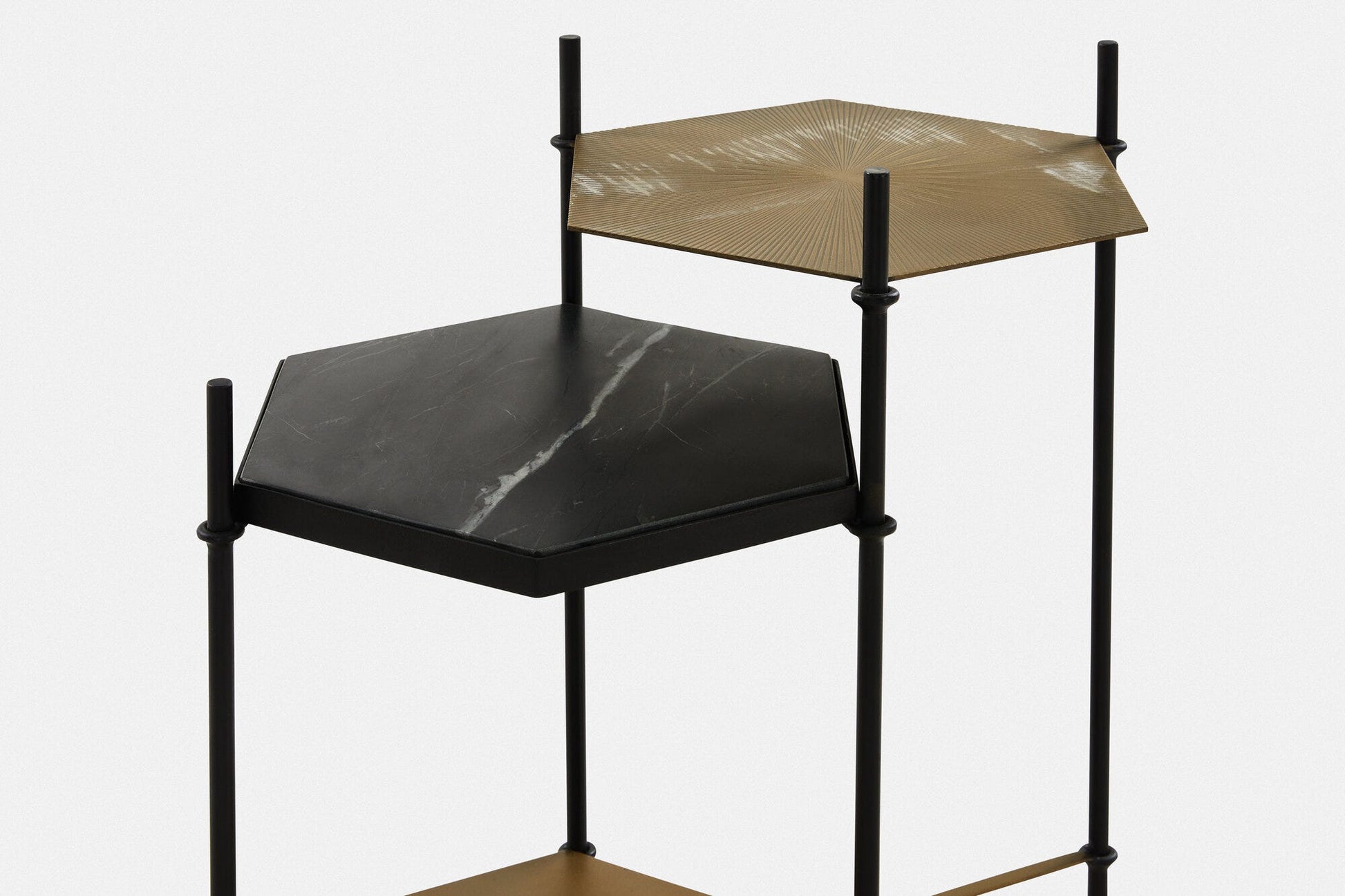The Hexall side table features three hexagonal surfaces crafted from antique brass and black marble set in a tubular iron frame. Handmade with refined craftsmanship by skilled artisans, each piece has unique imperfections that make it truly one-of-a-kind.