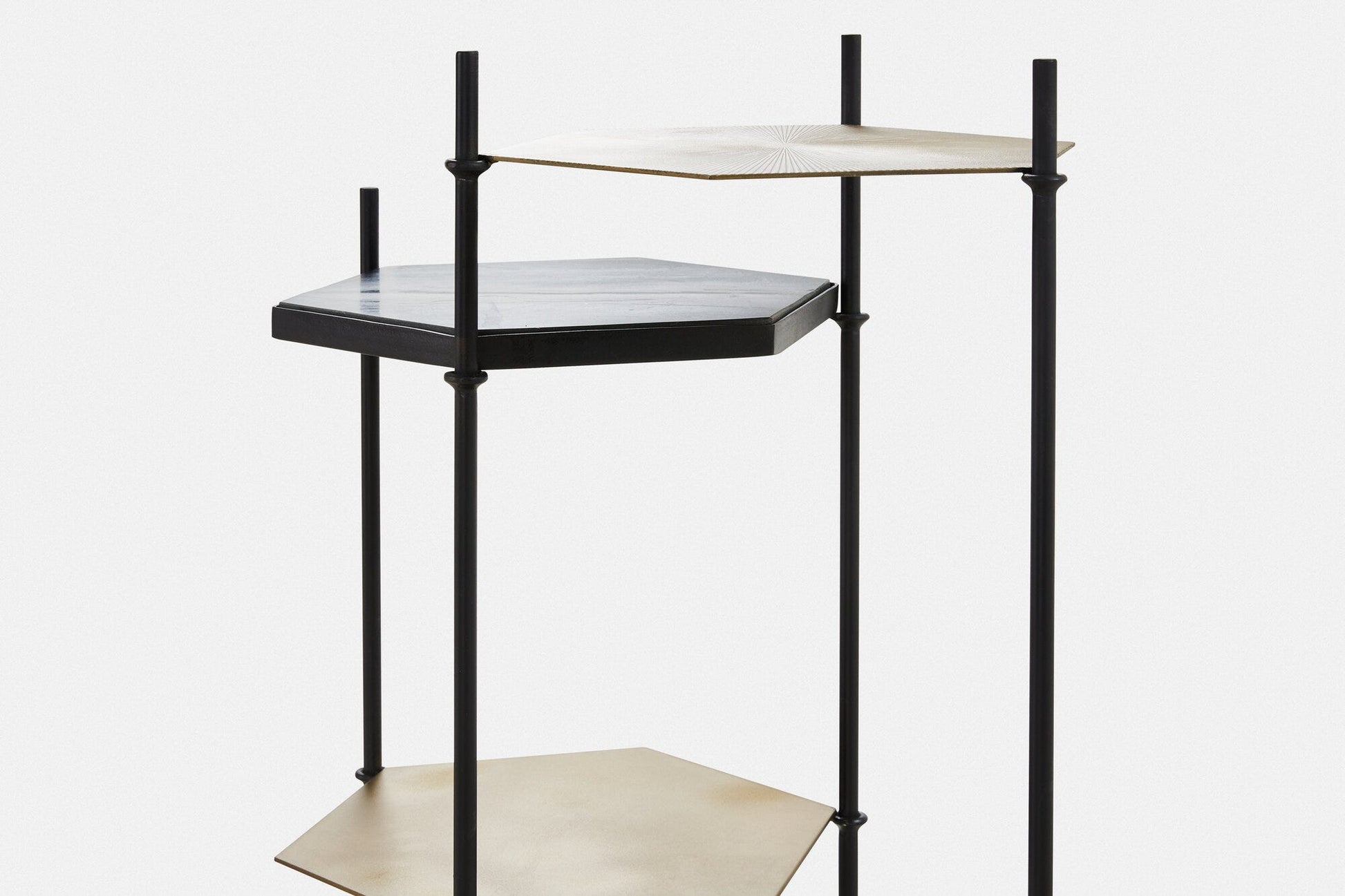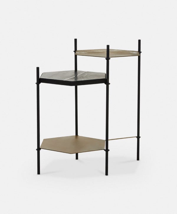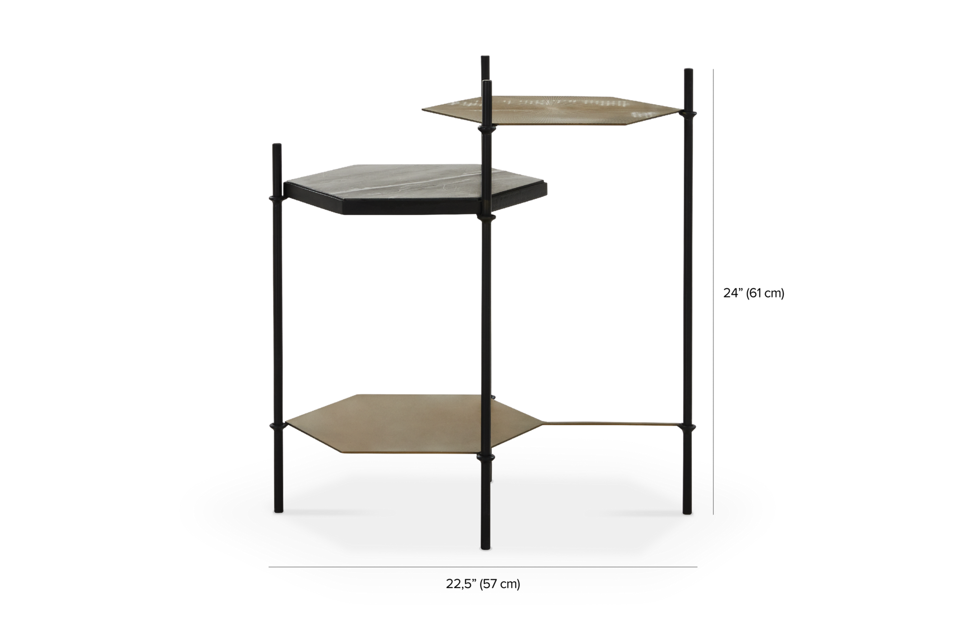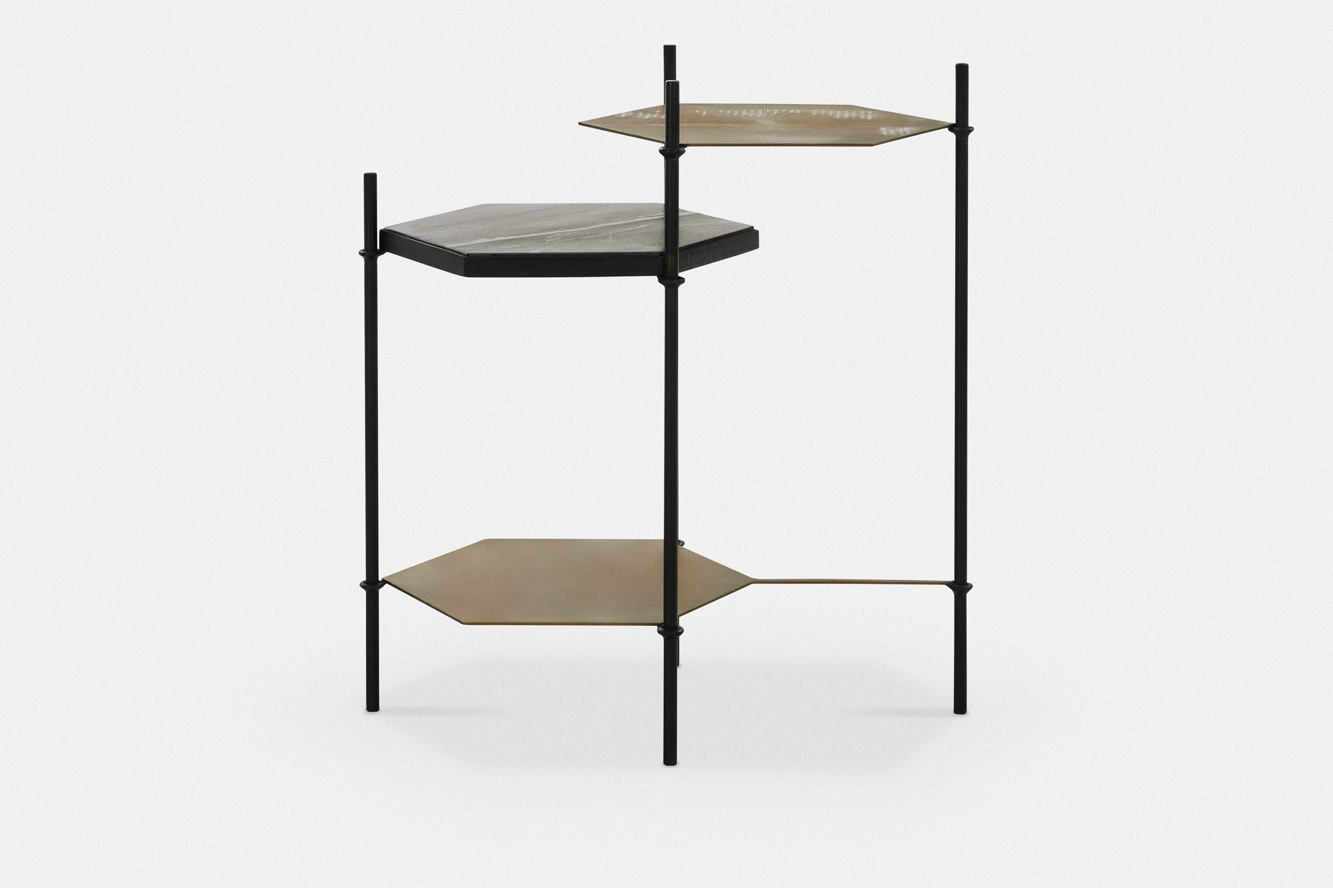 The Hexall side table features three hexagonal surfaces crafted from antique brass and black marble set in a tubular iron frame. Handmade with refined craftsmanship by skilled artisans, each piece has unique imperfections that make it truly one-of-a-kind.