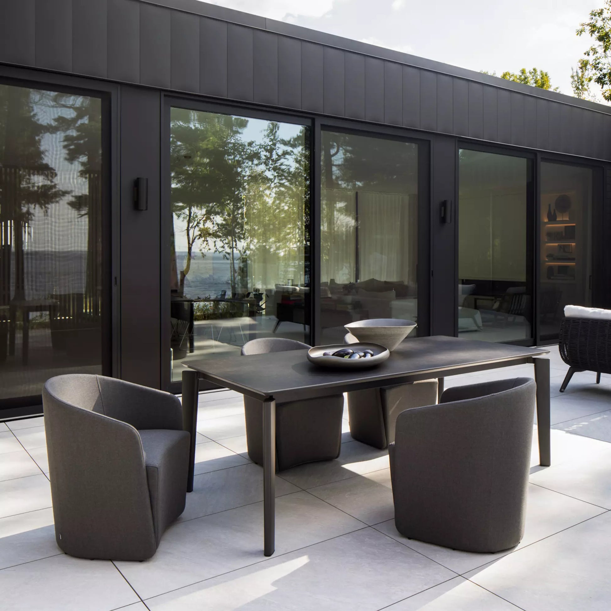 Ivy is part semi-tube, part cube. This modern dining chair has the air of a living room seat thanks to its enveloping forms, soft padding and all-over Sunbrella fabric upholstery. Better still, its aluminum frame and quick-drying foam fill are designed to withstand Mother Nature’s every whim.