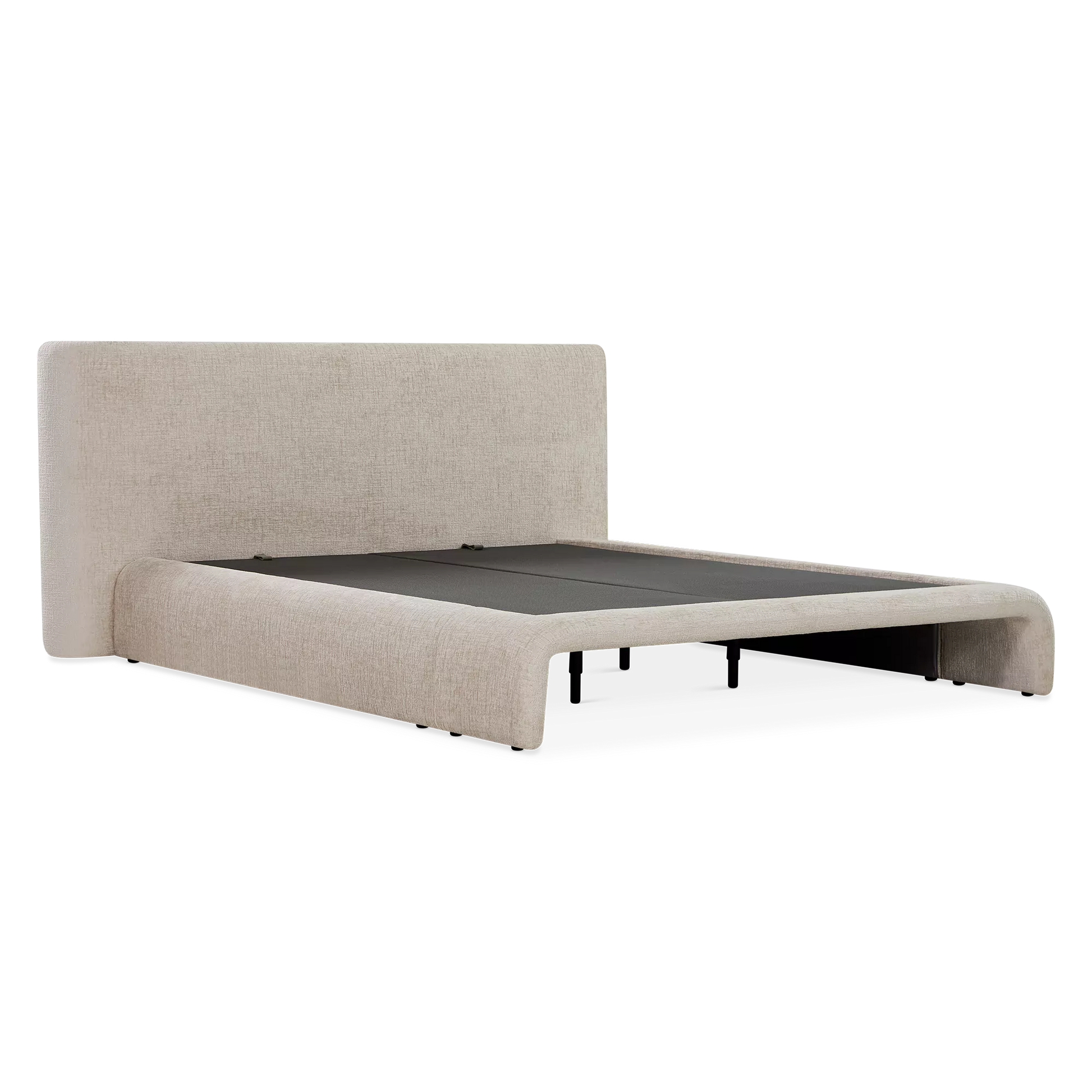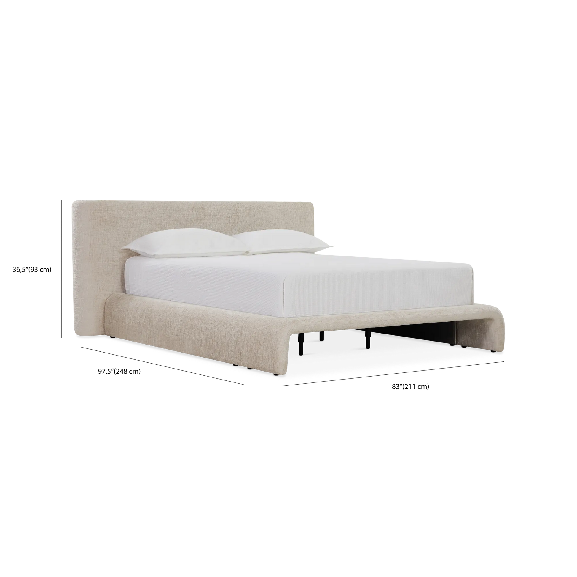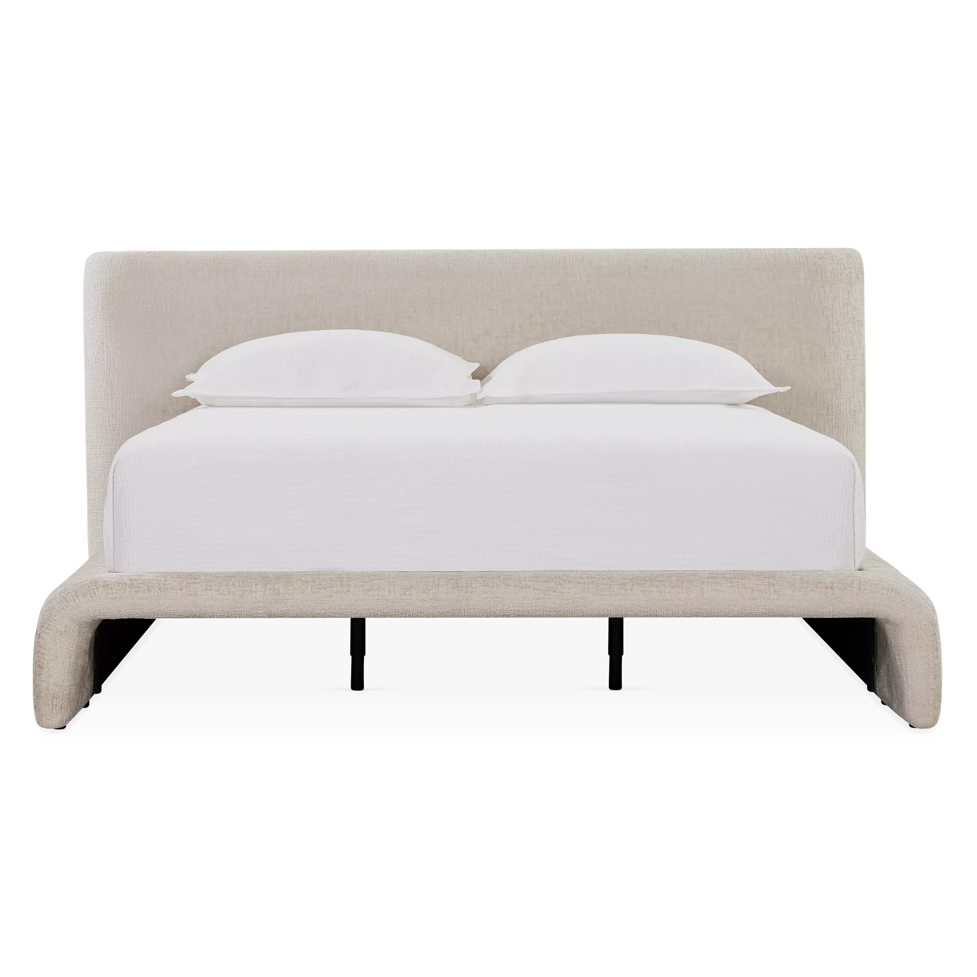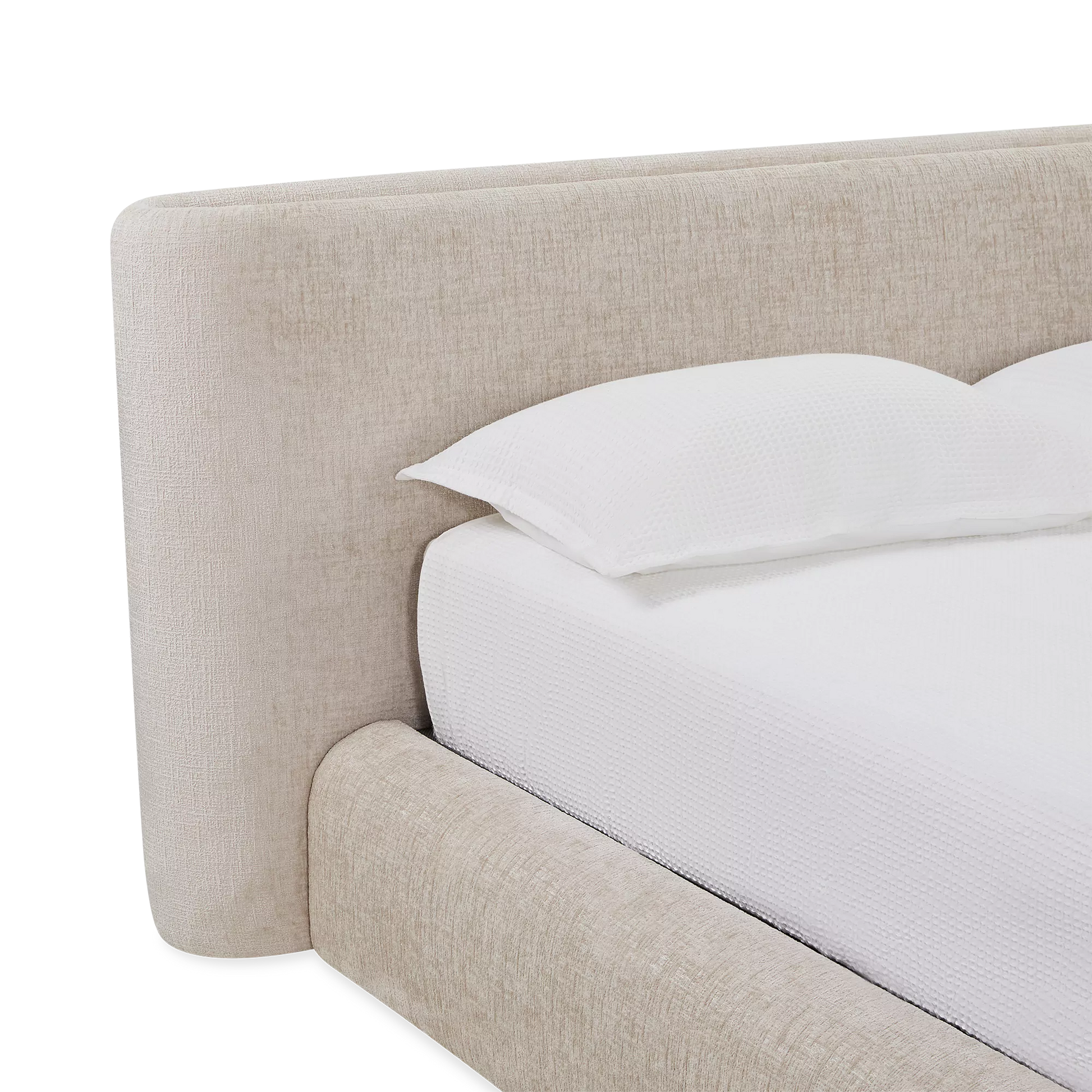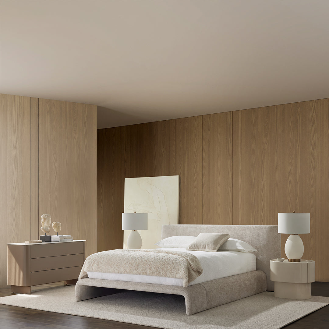 The Jonathan bed brings a dream-like feel with its expansive headboard and fully upholstered frame. Gently curved and draped in textured fabric, it exudes a quiet elegance to create a tranquil effect in any modern or contemporary style bedroom.