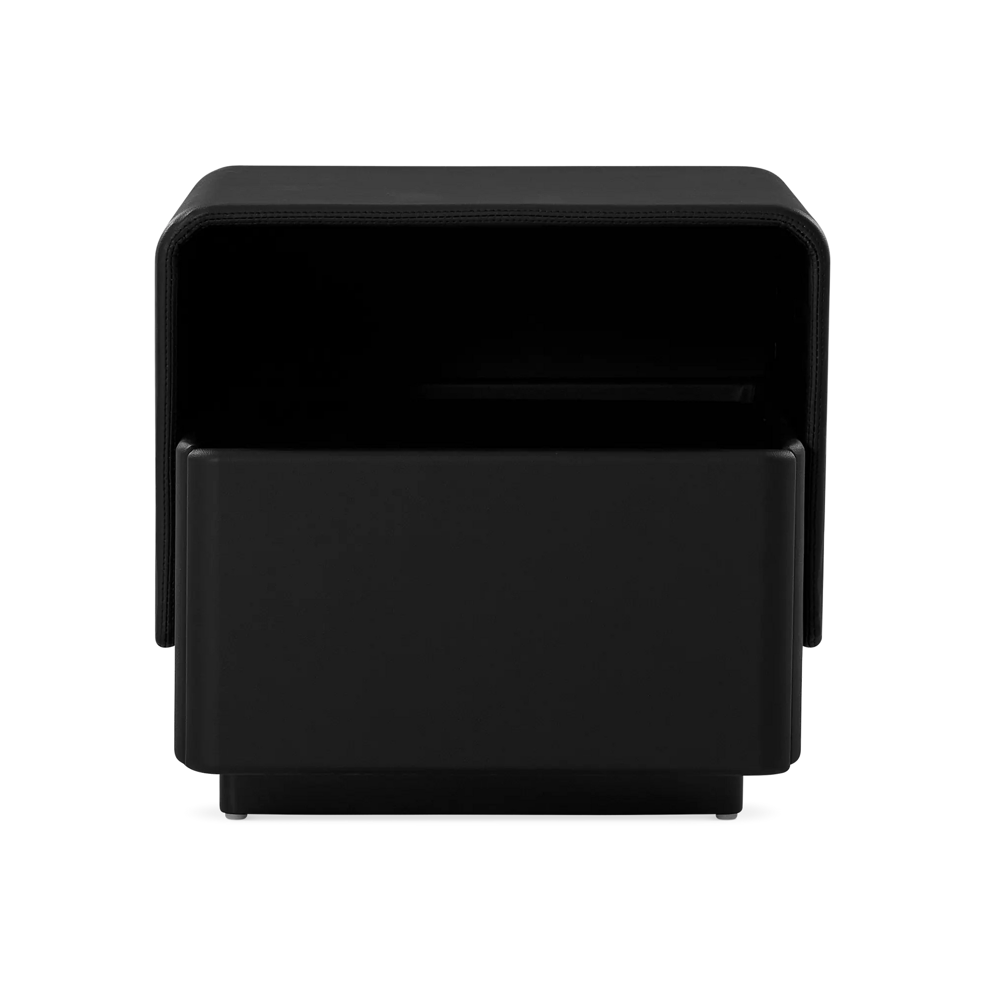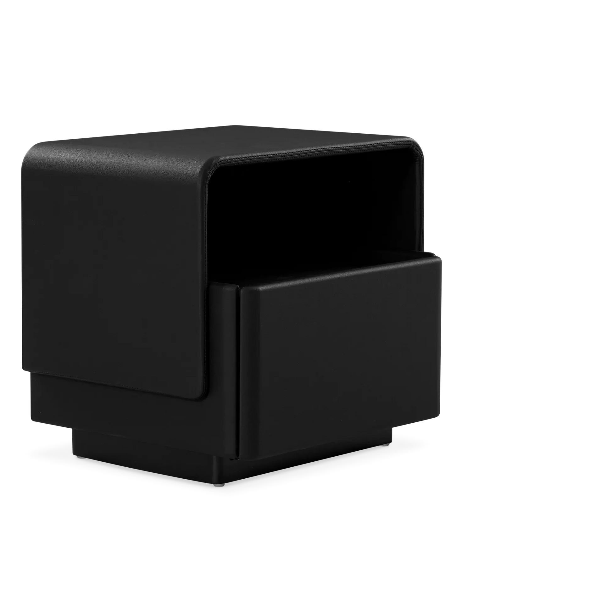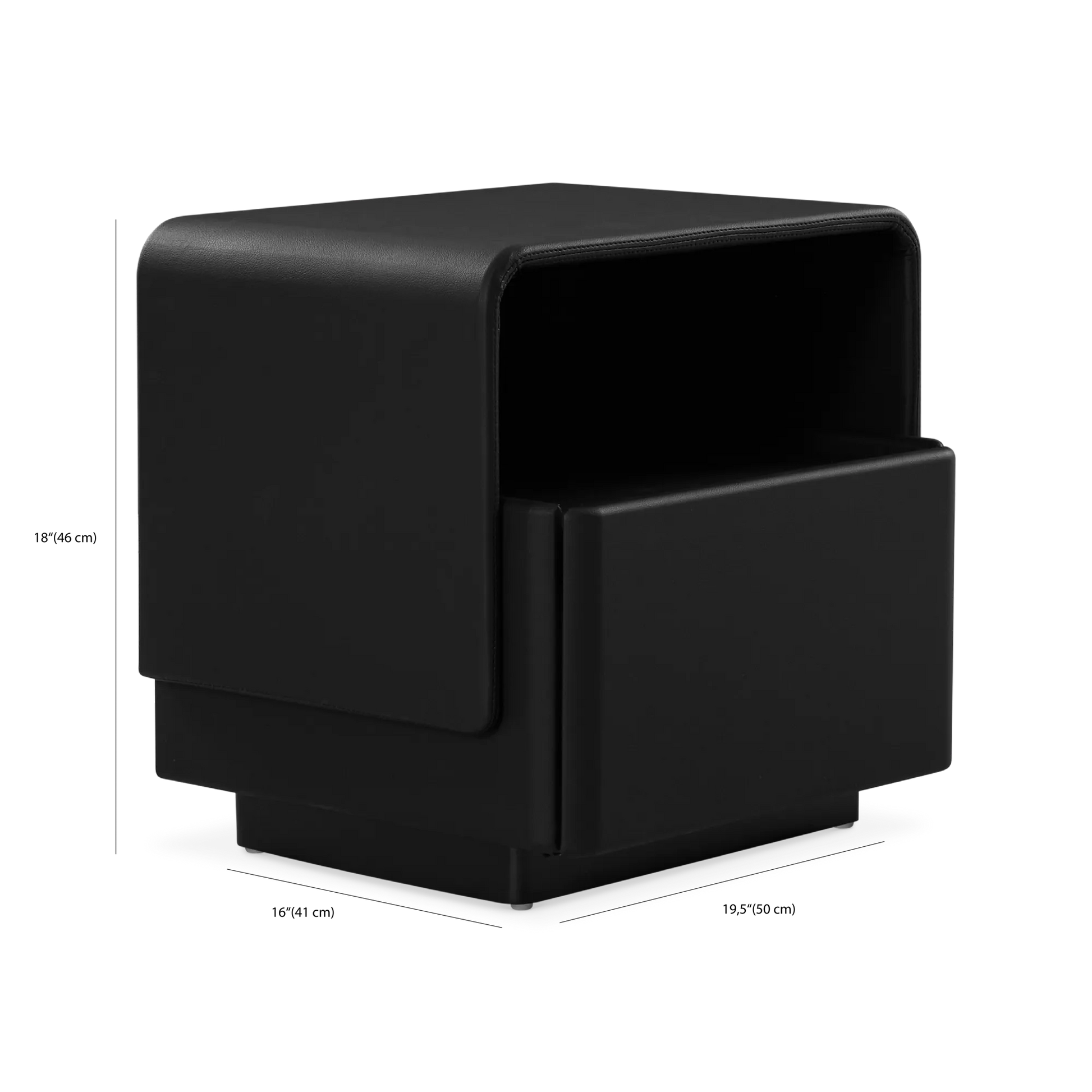 Stylish from every rounded angle, the Joni bedside table is also functional with its built-in drawer and open storage space. Its clean and rounded design fits perfectly into contemporary style bedrooms. It’s covered entirely in vinyl, a durable material that’s both eye-catching and easy to maintain.
