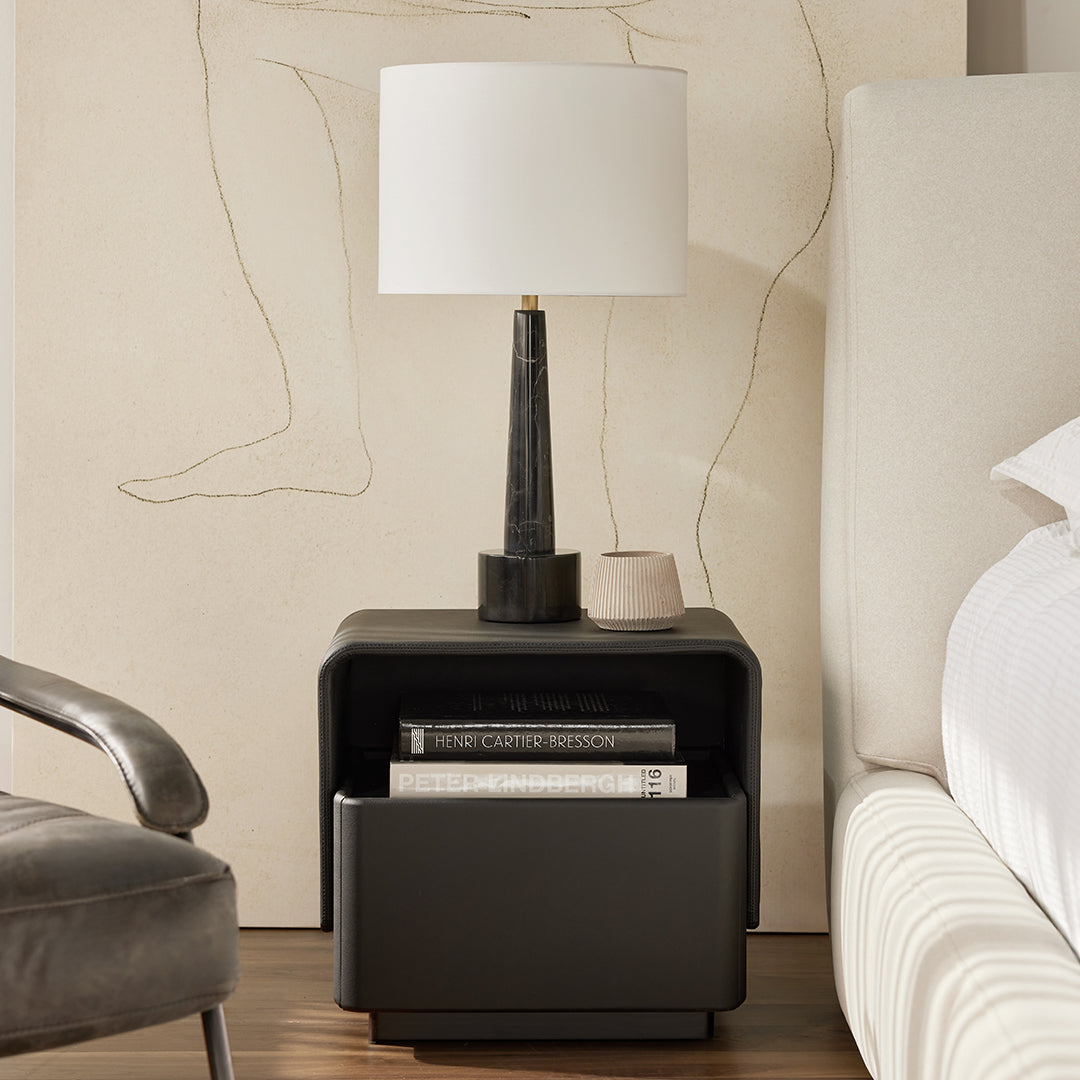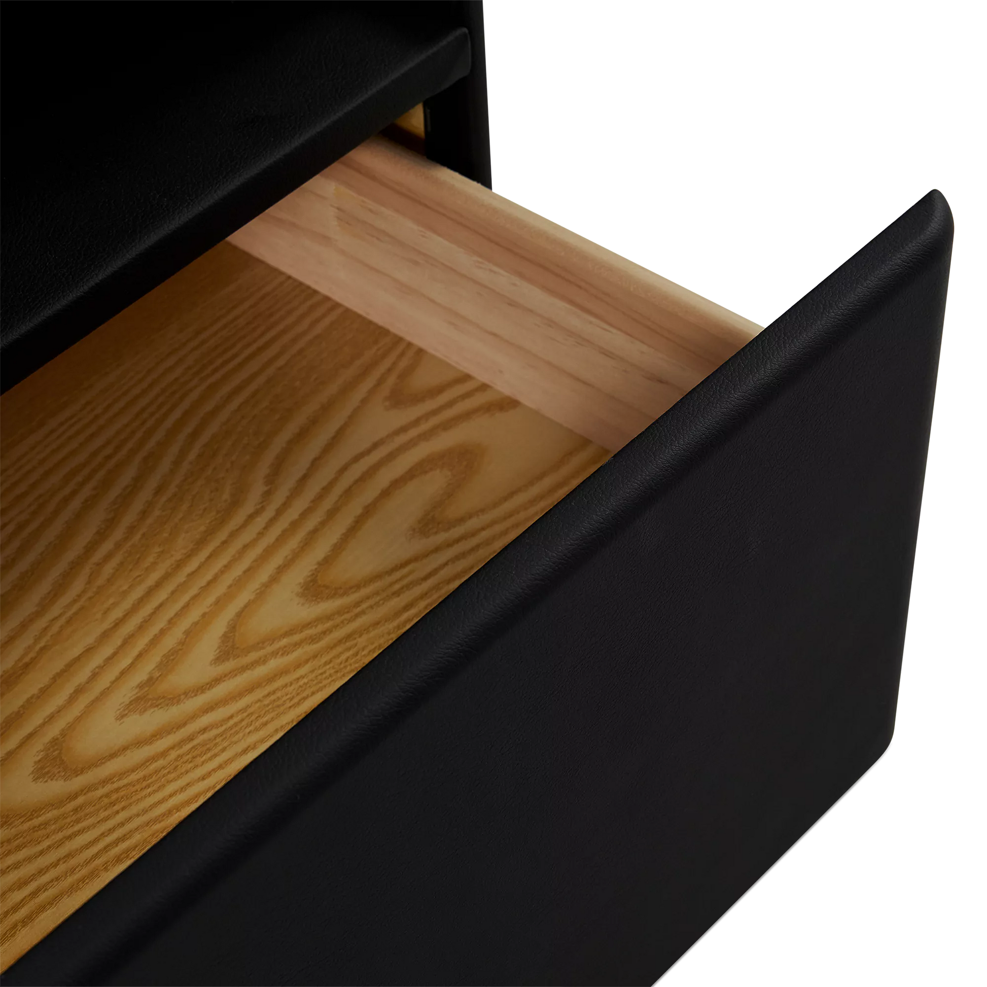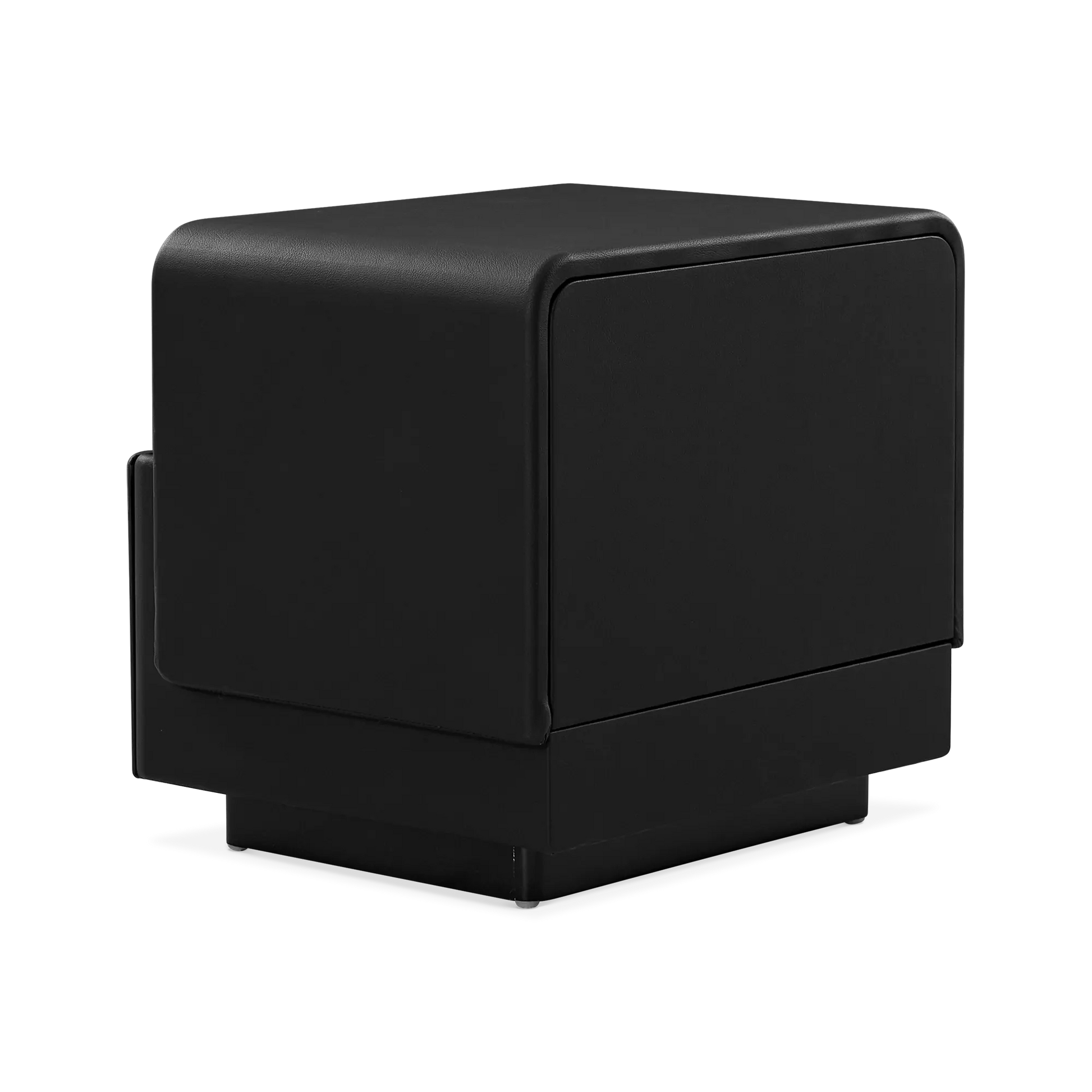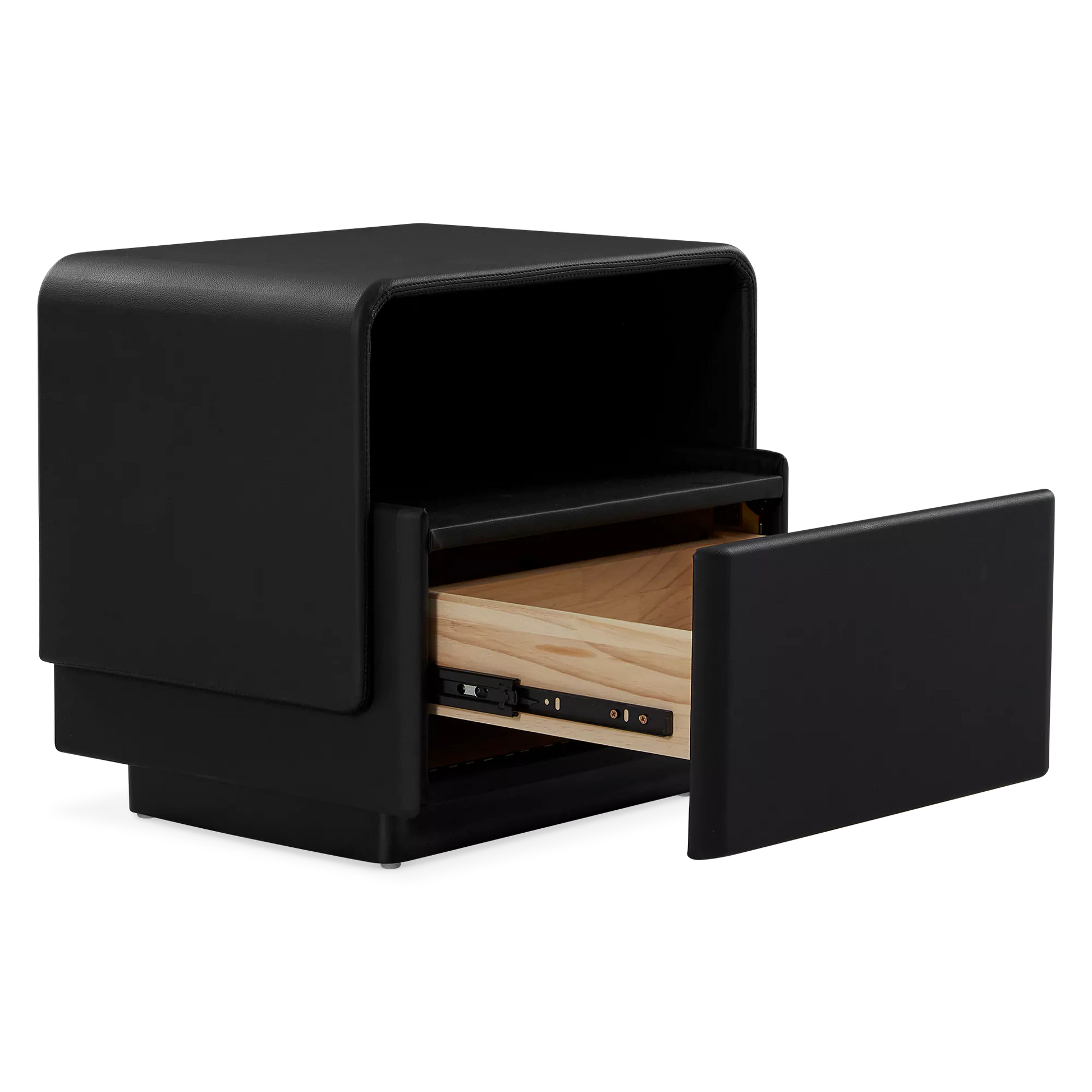 Stylish from every rounded angle, the Joni bedside table is also functional with its built-in drawer and open storage space. Its clean and rounded design fits perfectly into contemporary style bedrooms. It’s covered entirely in vinyl, a durable material that’s both eye-catching and easy to maintain.