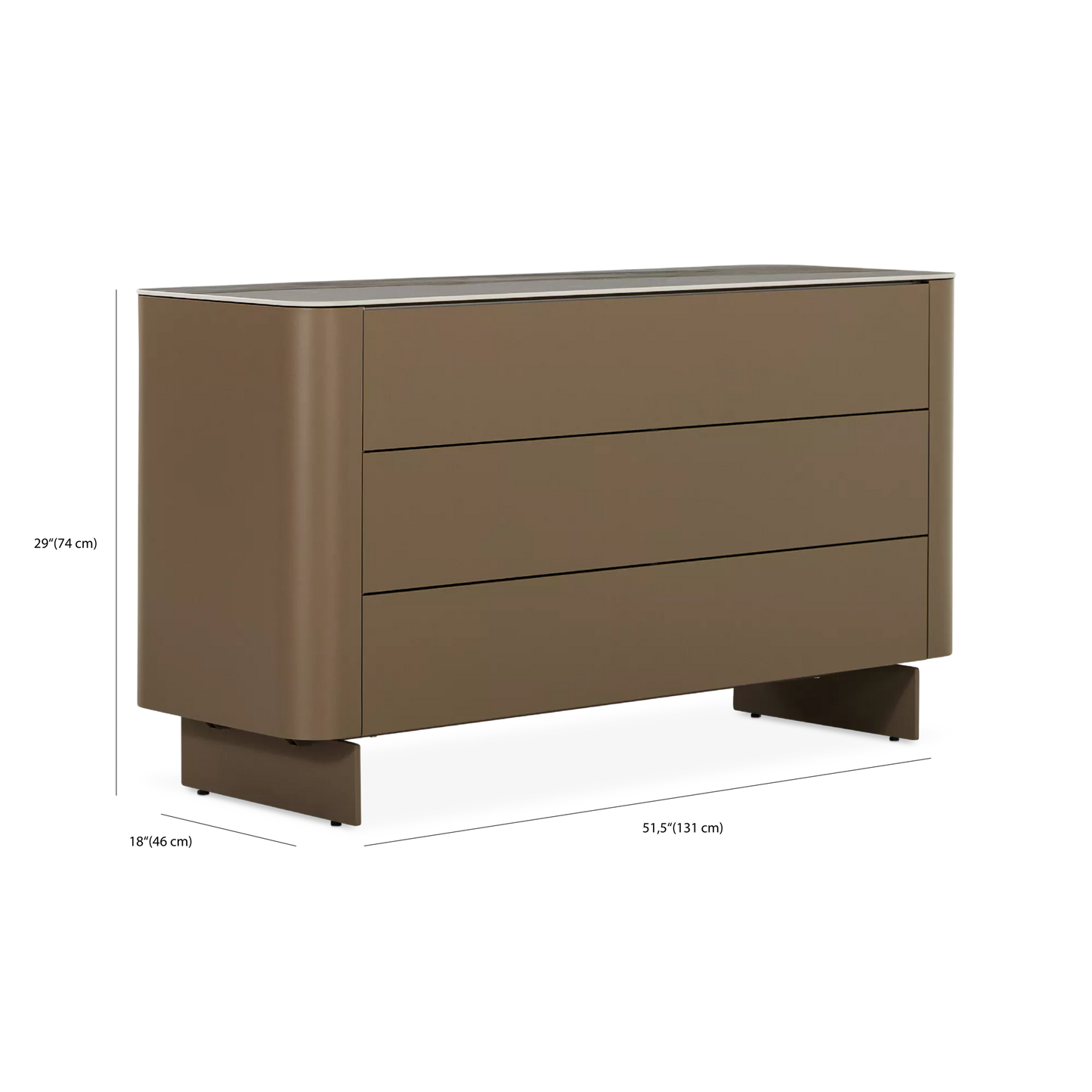 The Jordan dresser is at once striking and functional, with its three spacious drawers and rounded corners that soften an otherwise linear frame. Its neutral-toned body appears to float atop its thin rectangular legs, while its tonal Calacatta marble top adds polished surface space for daily essentials and decorative objects.