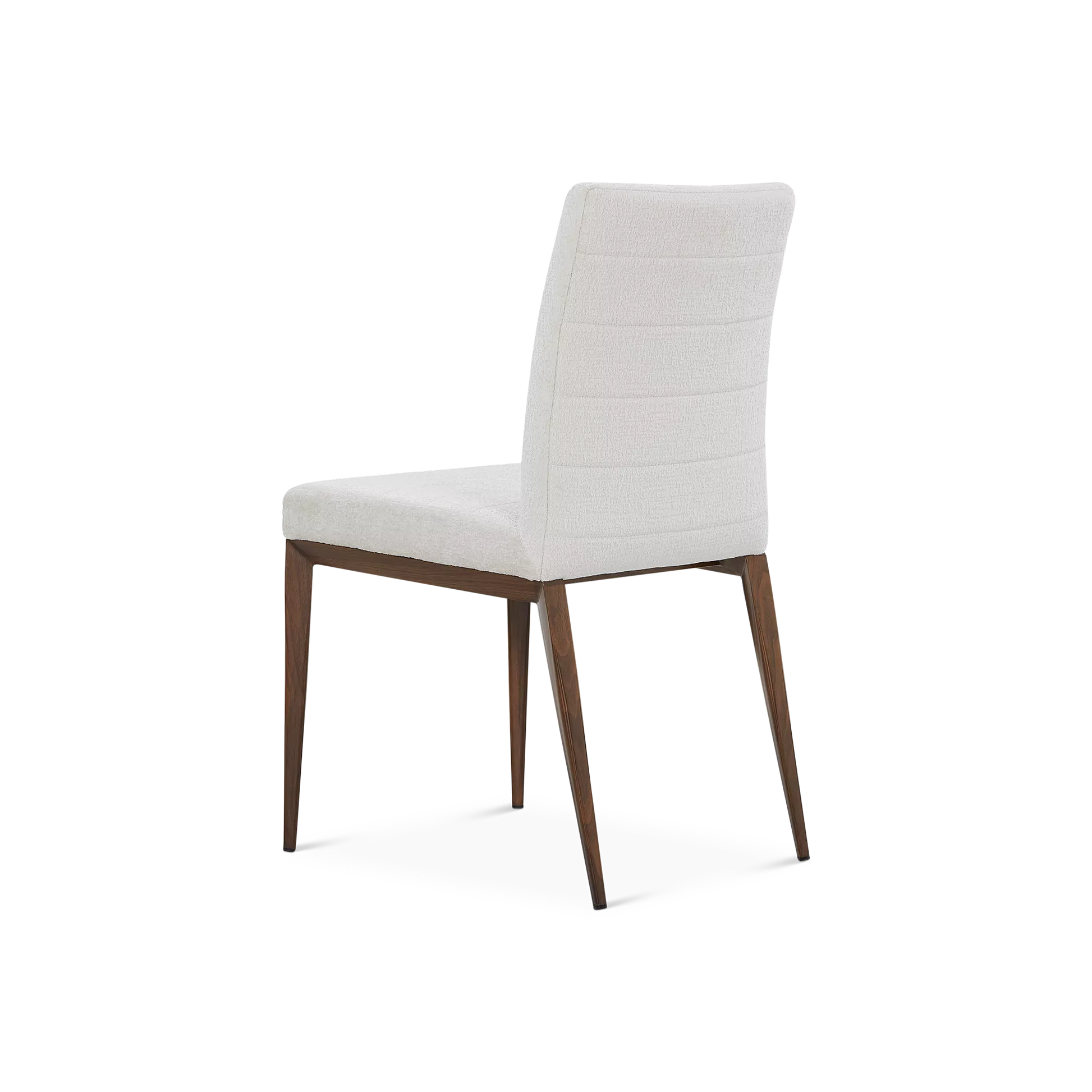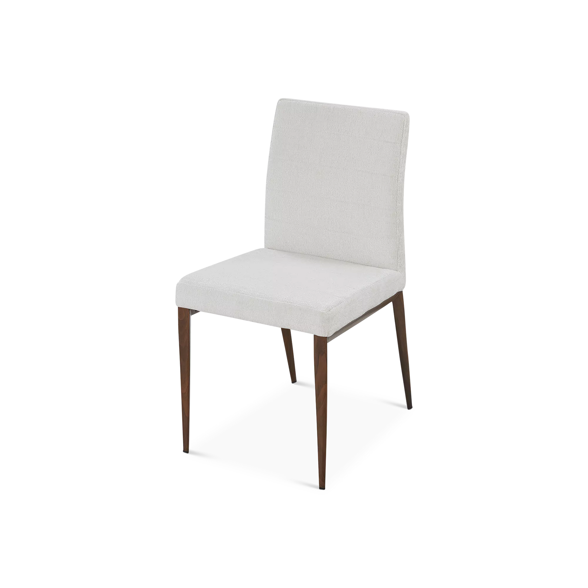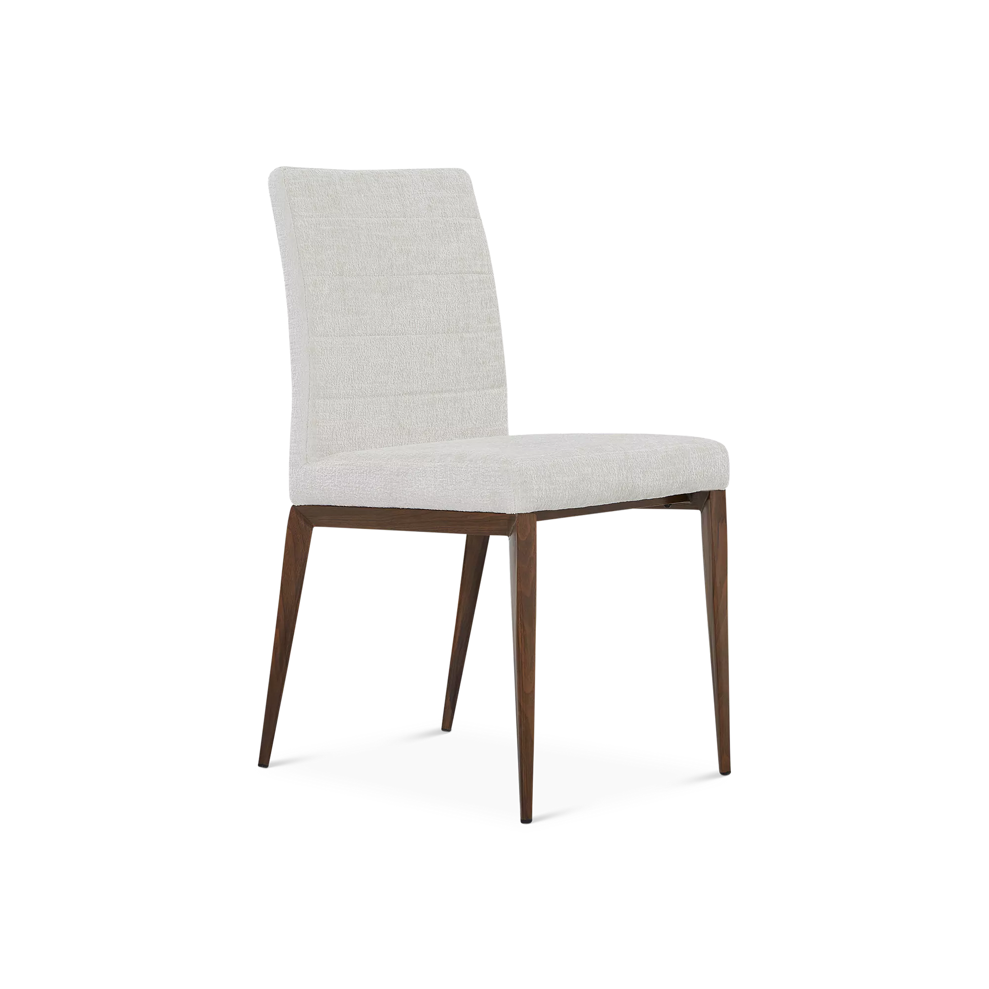 The Canadian-made Juliette chair combines a metal base with faux wood grain and a fabric upholstered seat. It charms with its classic look and the elegant curve of its backrest. It looks perfect around a dining table or in front of a desk.