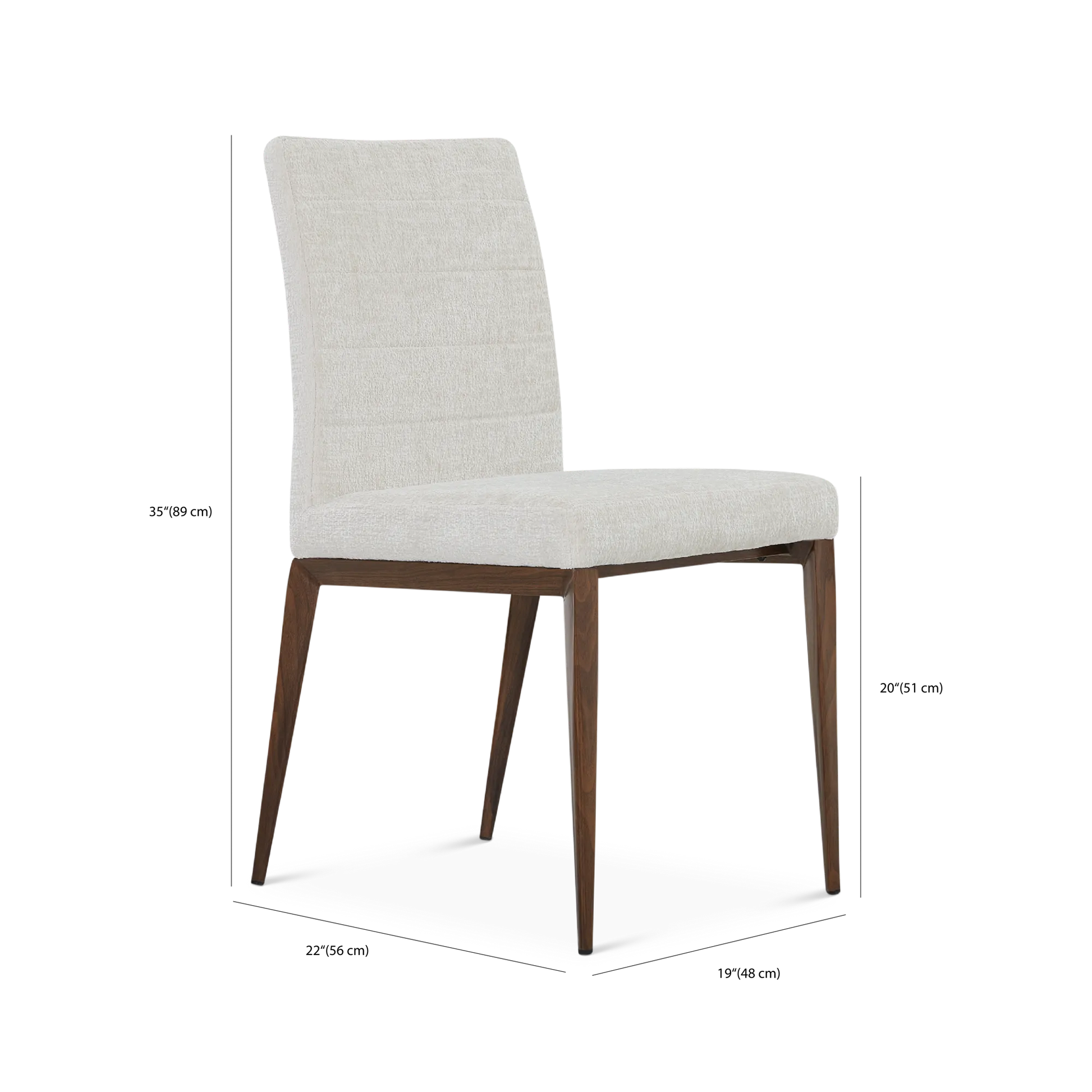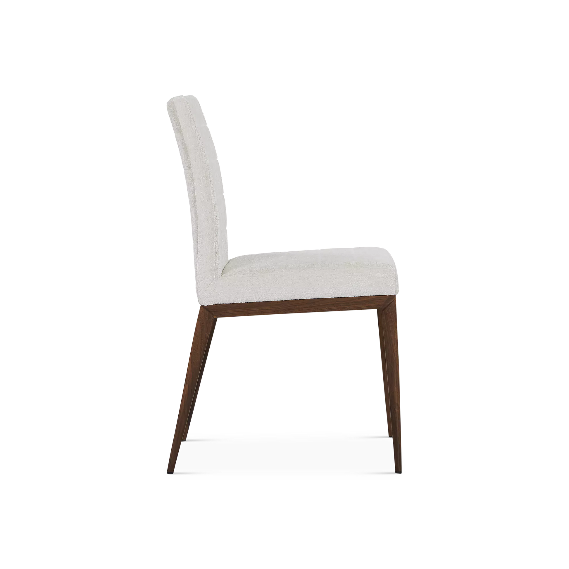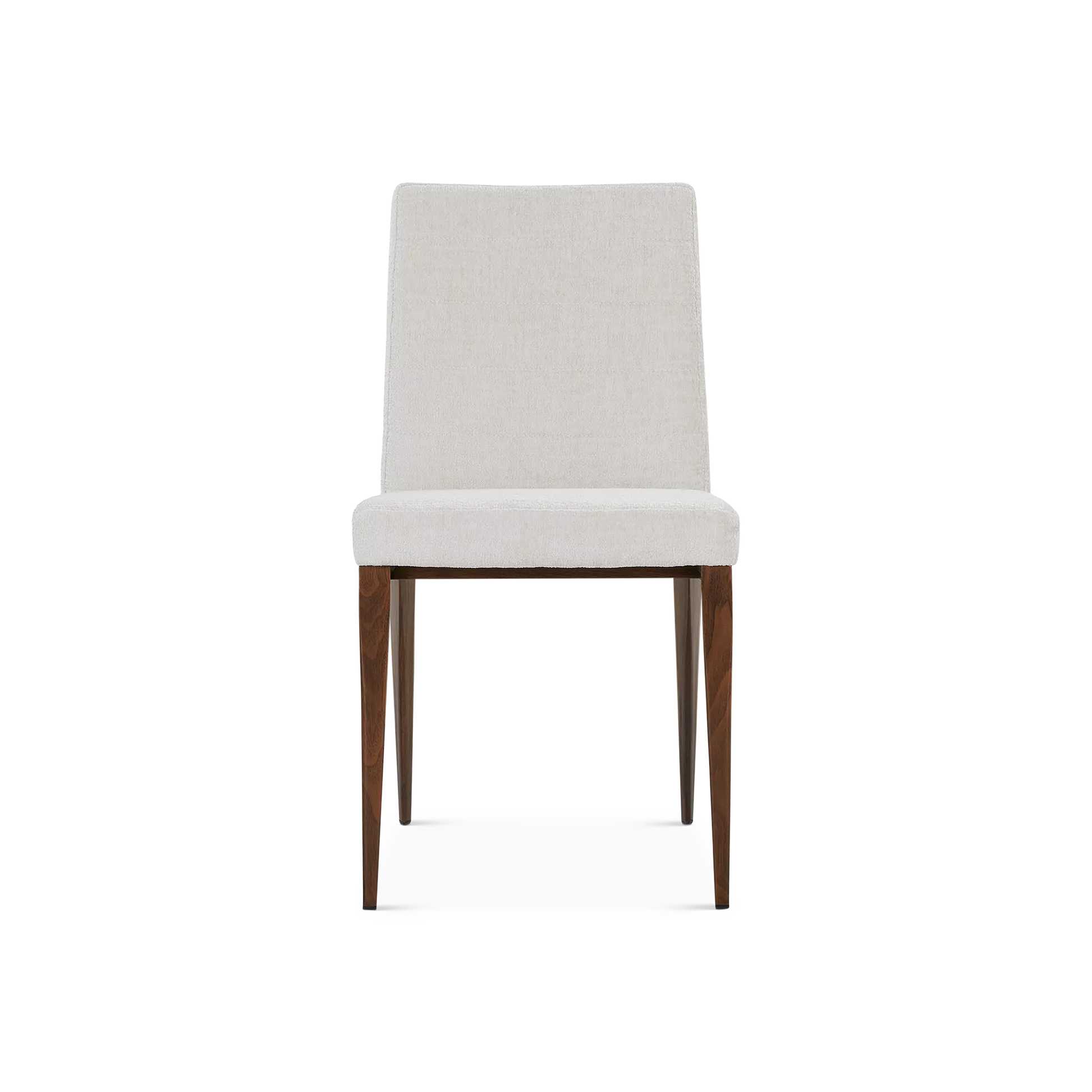 The Canadian-made Juliette chair combines a metal base with faux wood grain and a fabric upholstered seat. It charms with its classic look and the elegant curve of its backrest. It looks perfect around a dining table or in front of a desk.