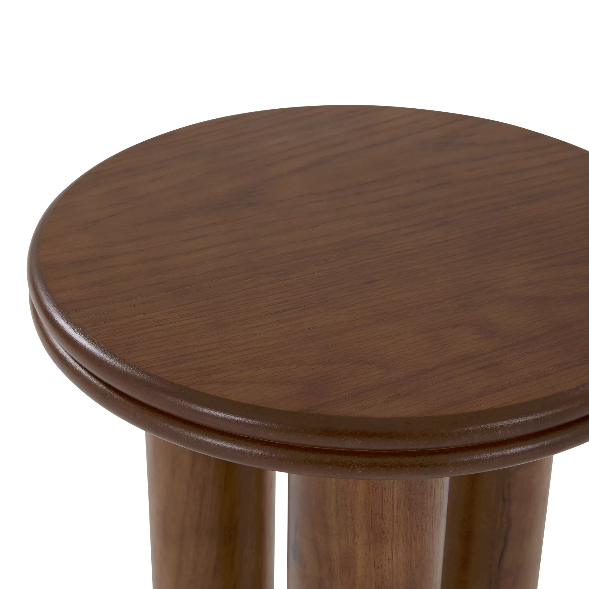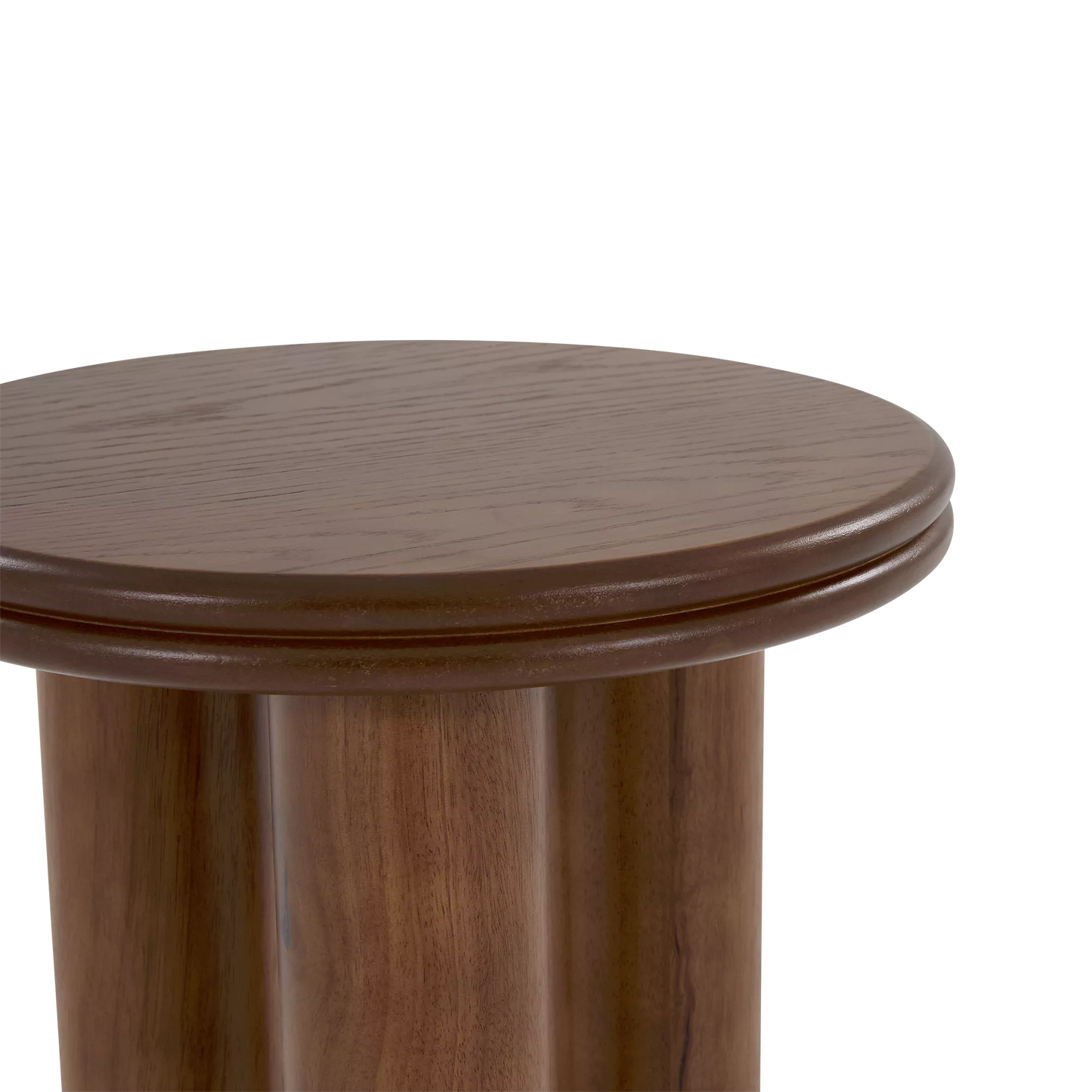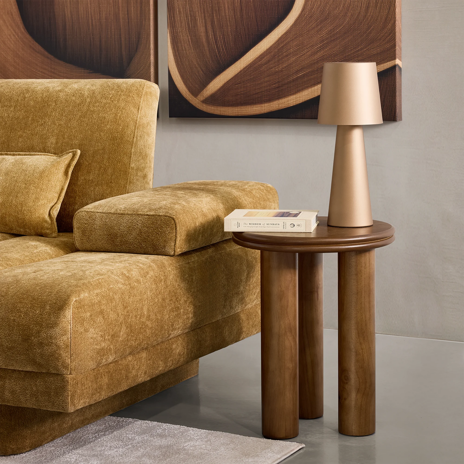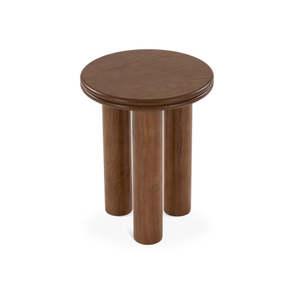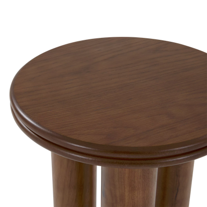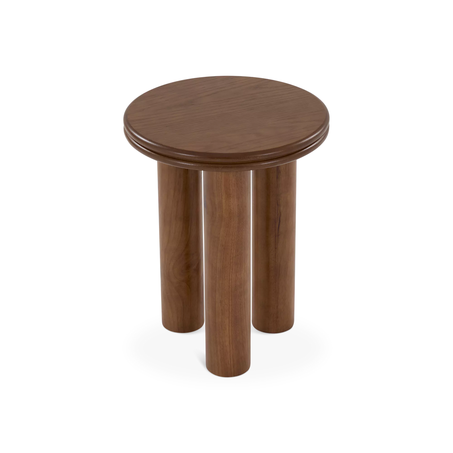 The Kara side table charms with its round top and three cylindrical legs, offering a simple silhouette with plenty of style. Made from walnut-stained oak veneer, it complements a sofa or armchair with ease. The layered rim of its tabletop creates an elegant double-edge effect, adding a refined touch to this warm design.