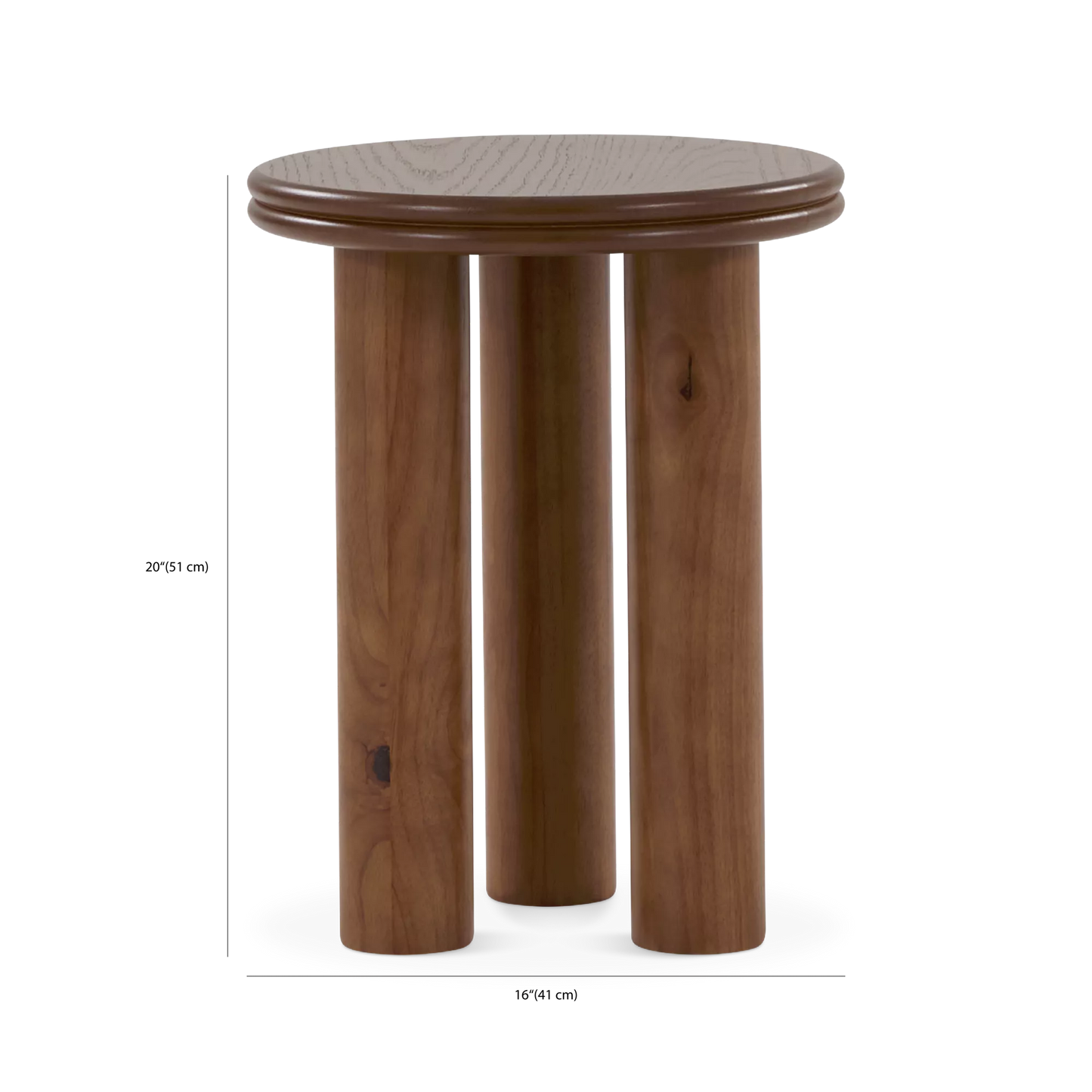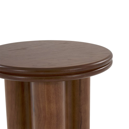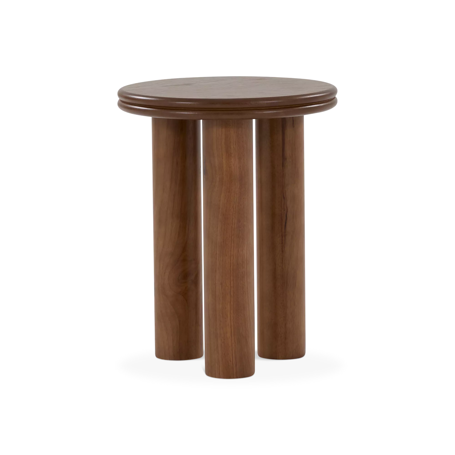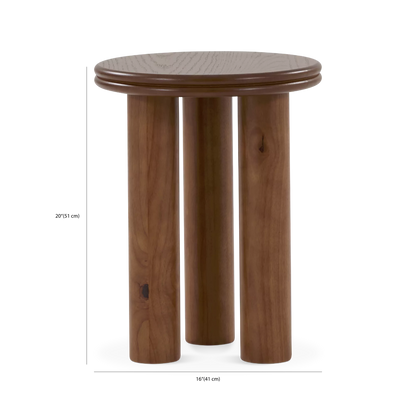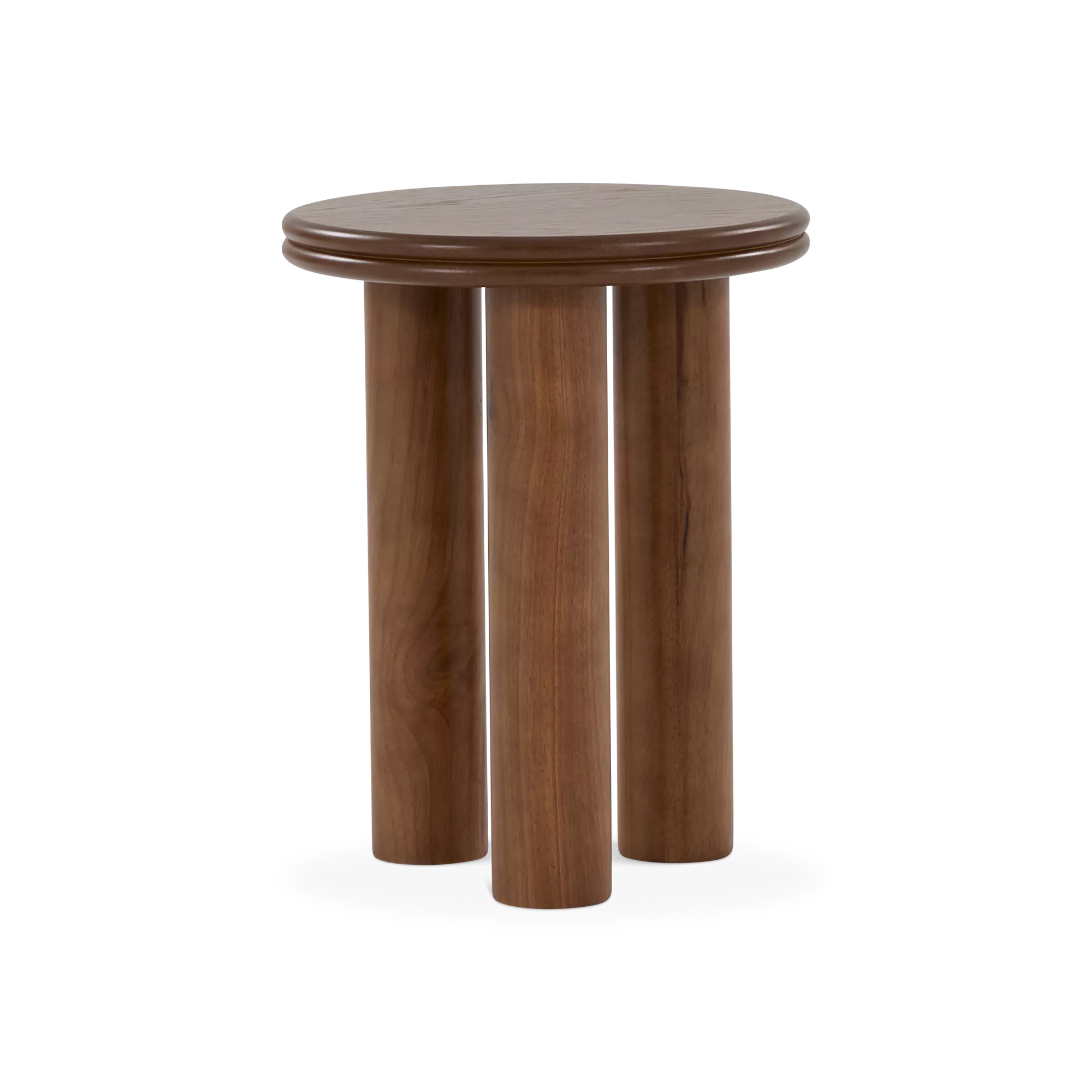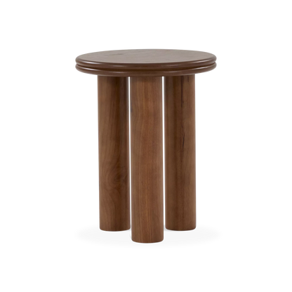 The Kara side table charms with its round top and three cylindrical legs, offering a simple silhouette with plenty of style. Made from walnut-stained oak veneer, it complements a sofa or armchair with ease. The layered rim of its tabletop creates an elegant double-edge effect, adding a refined touch to this warm design.