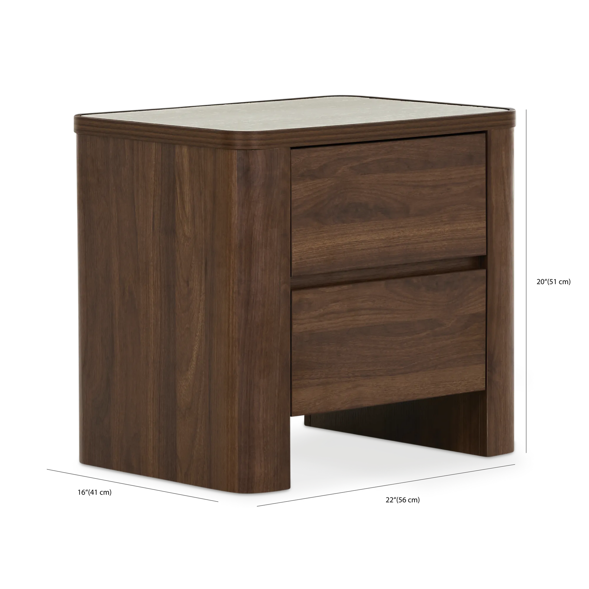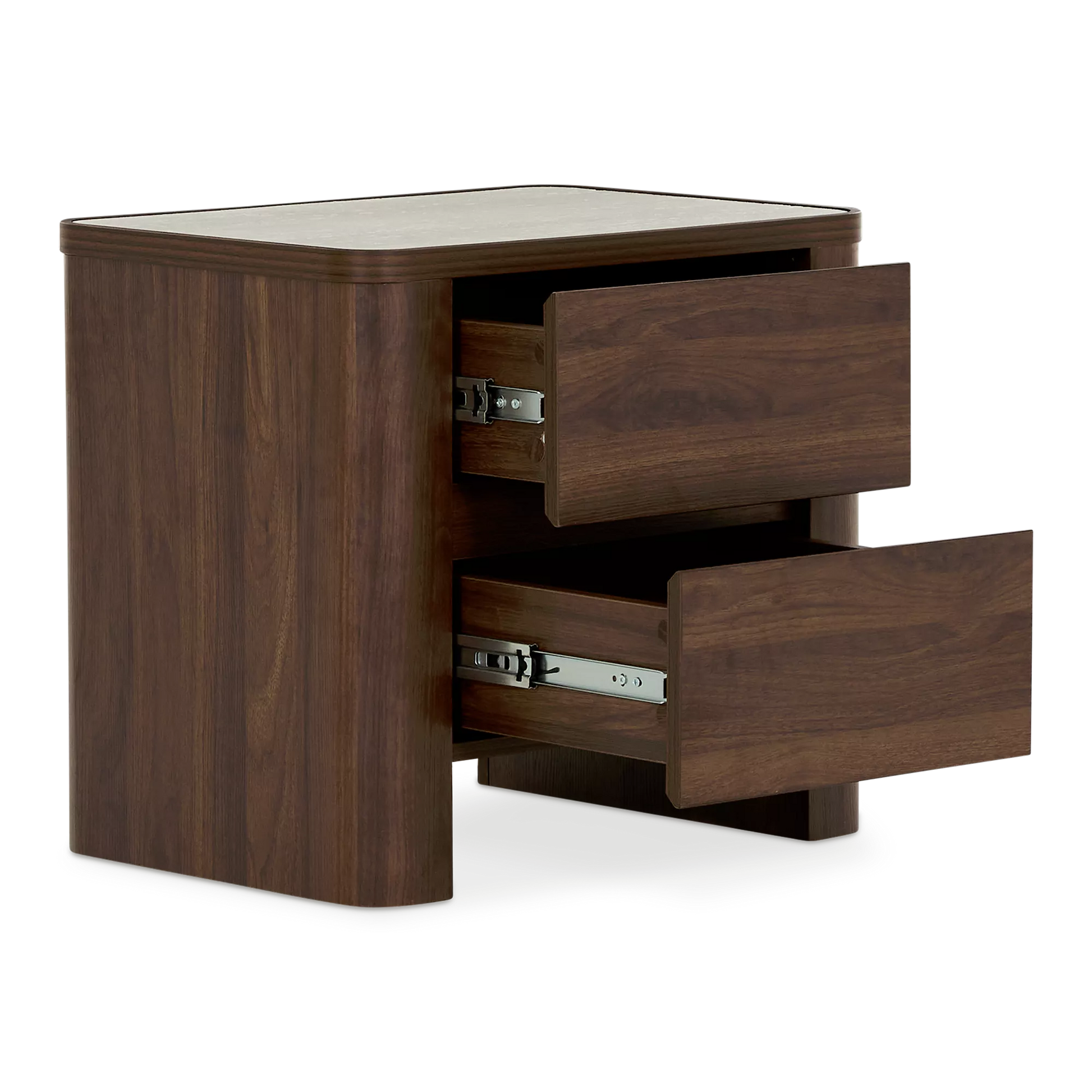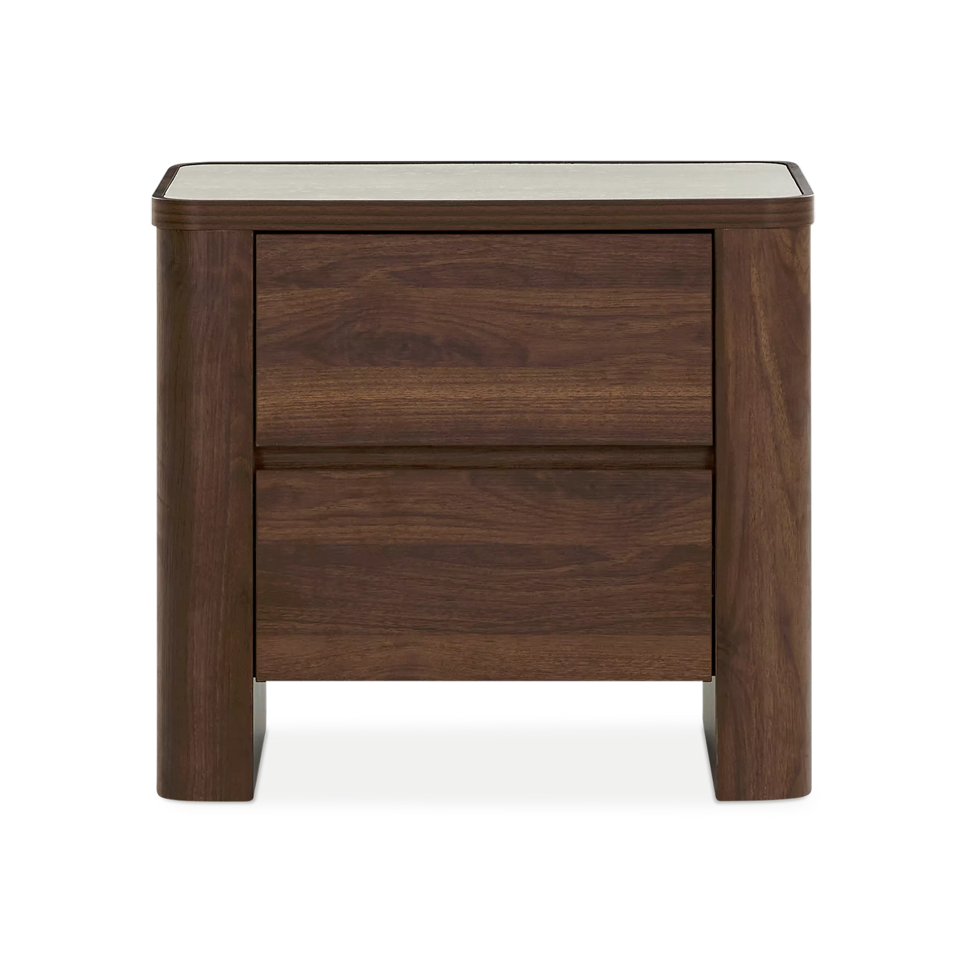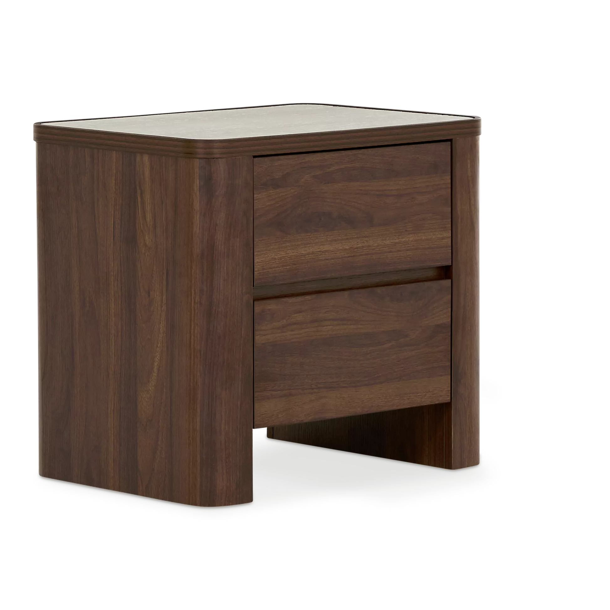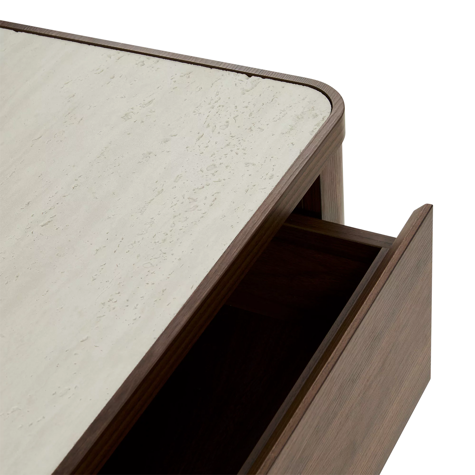 So soothing. Available in a natural oak or walnut finish, the Kubo nightstand is crowned with a travertine-effect ceramic top for a seamless material mix. Its clean lines, delicate curves and high-quality materials make it the perfect choice for any contemporary-style bedroom.