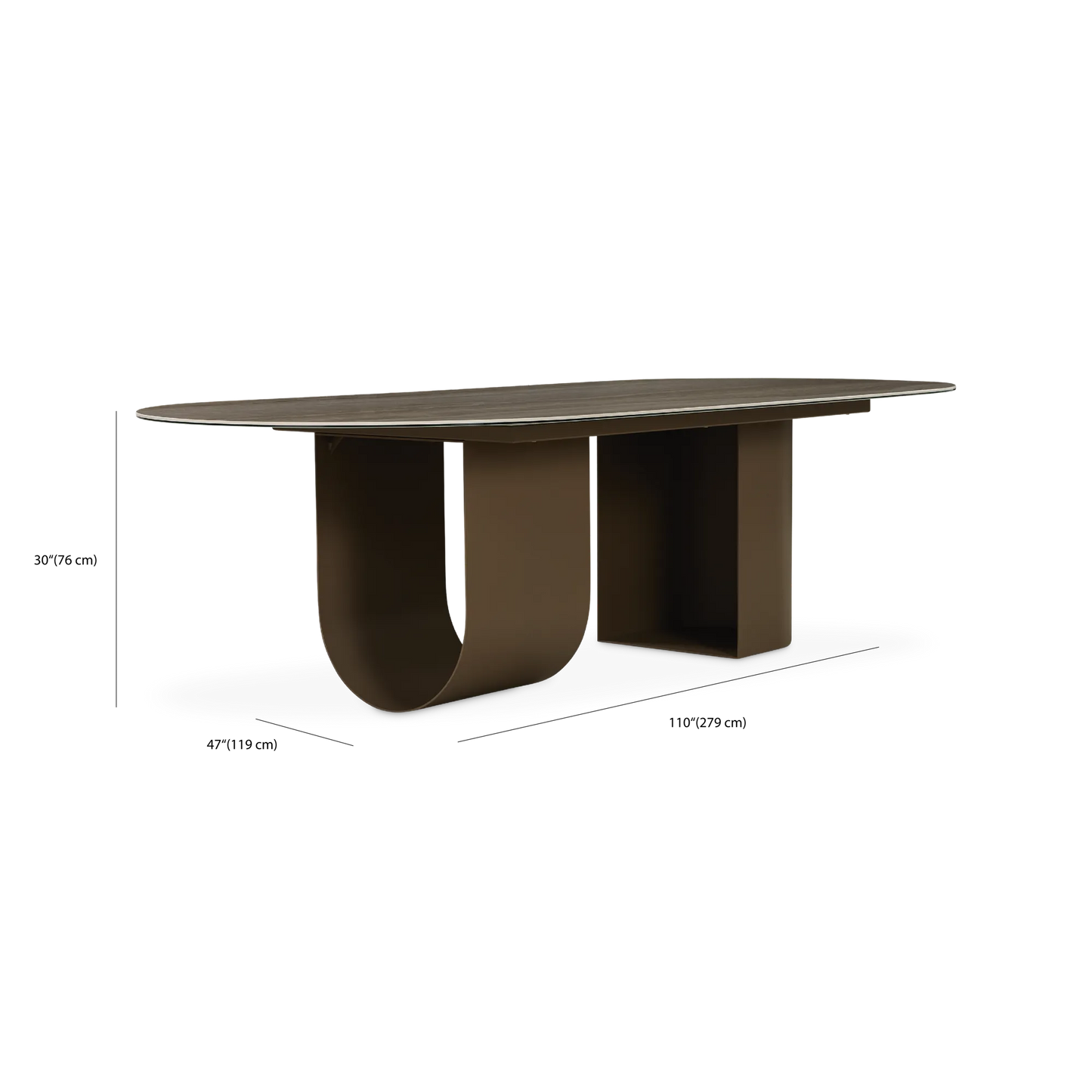 With its curved lines, mineral materials and bold silhouette, the Lama dining table features a stone-finish ceramic top and elegantly curved metal legs for a sculpturally elegant effect. A study in contrasts that’s at once sophisticated and positively striking.