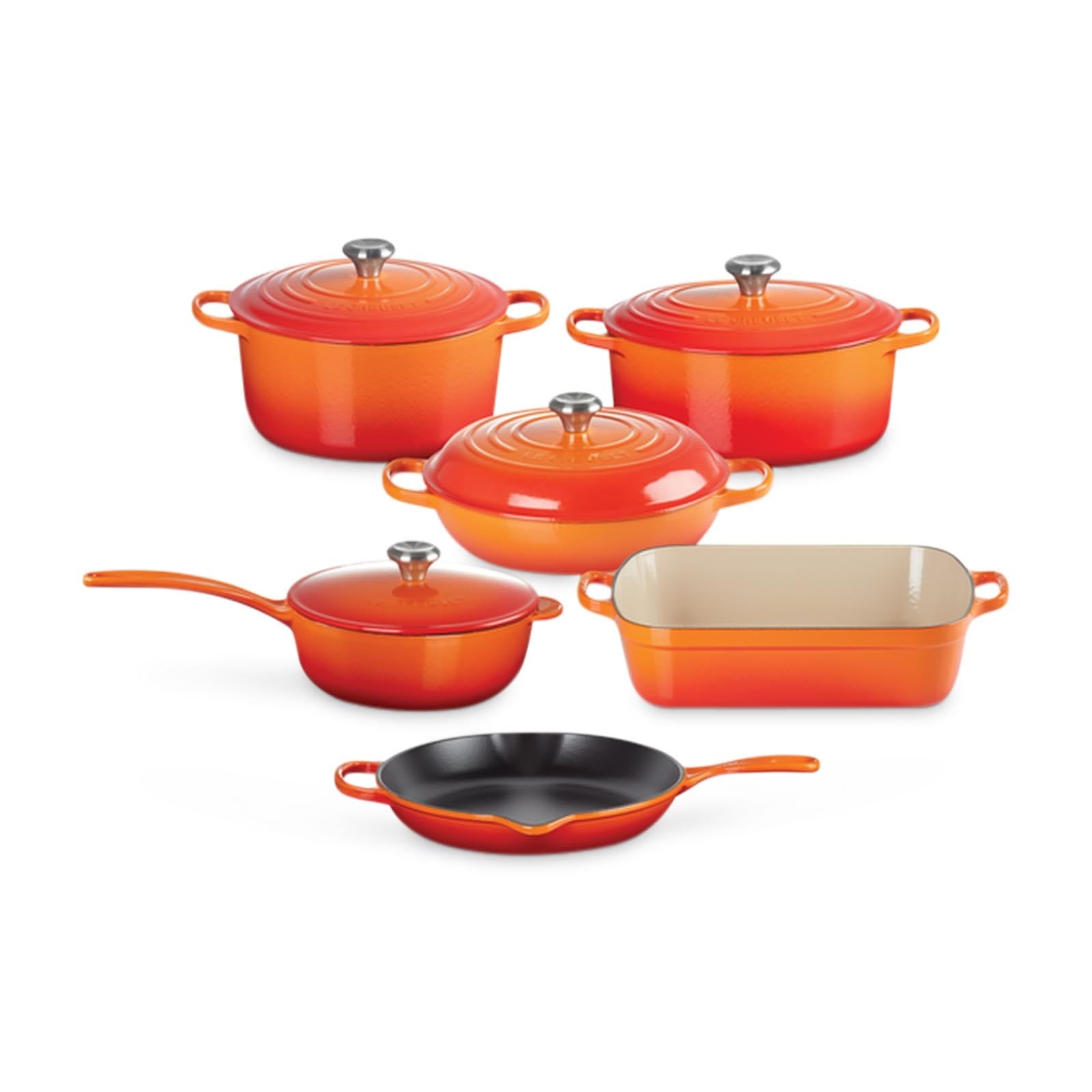 A kitchen set made for keeps! Made in France for nearly a century, this enamelled cast iron cookware will allow you to prepare all sorts of recipes and experiment with new techniques, whether you’re new to cooking at home or a professional chef. This set includes a 6.7L round Dutch oven, 4.7L oval Dutch oven, 3.5L braising pan, 2.0L rounded sauté pan, 30cm frying pan and 4.9L rectangular baking dish.