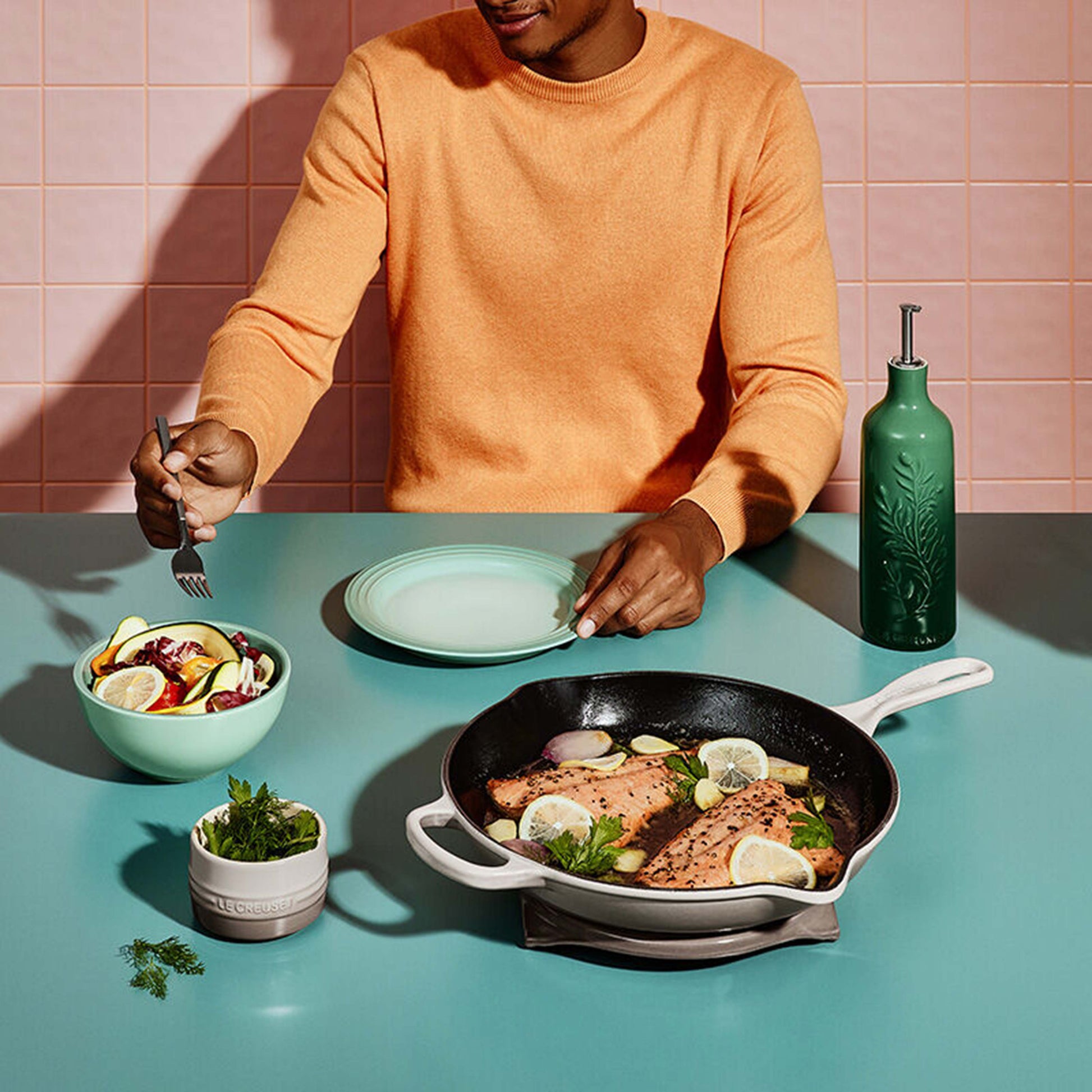 An iconic kitchen accessory, the Le Creuset cast iron skillet is ideal for searing, frying and baking. Its brightly colored enamelled finish is a feast for the eyes, while its black interior develops a natural patina over time. Chef’s tip: use this skillet to cook your breads and desserts to strike the perfect balance between a crunchy and golden exterior, and a soft, airy inside.