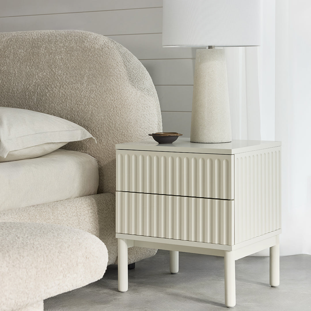 Your cozy oasis is within reach. Add the Lila nightstand in cream white wood to give your bedroom a bright and soothing look. Its rectilinear structure with a textured façade is set on tubular legs for a subtly retro look that’s effortless to style. Store your essentials with ease in its two drawers.