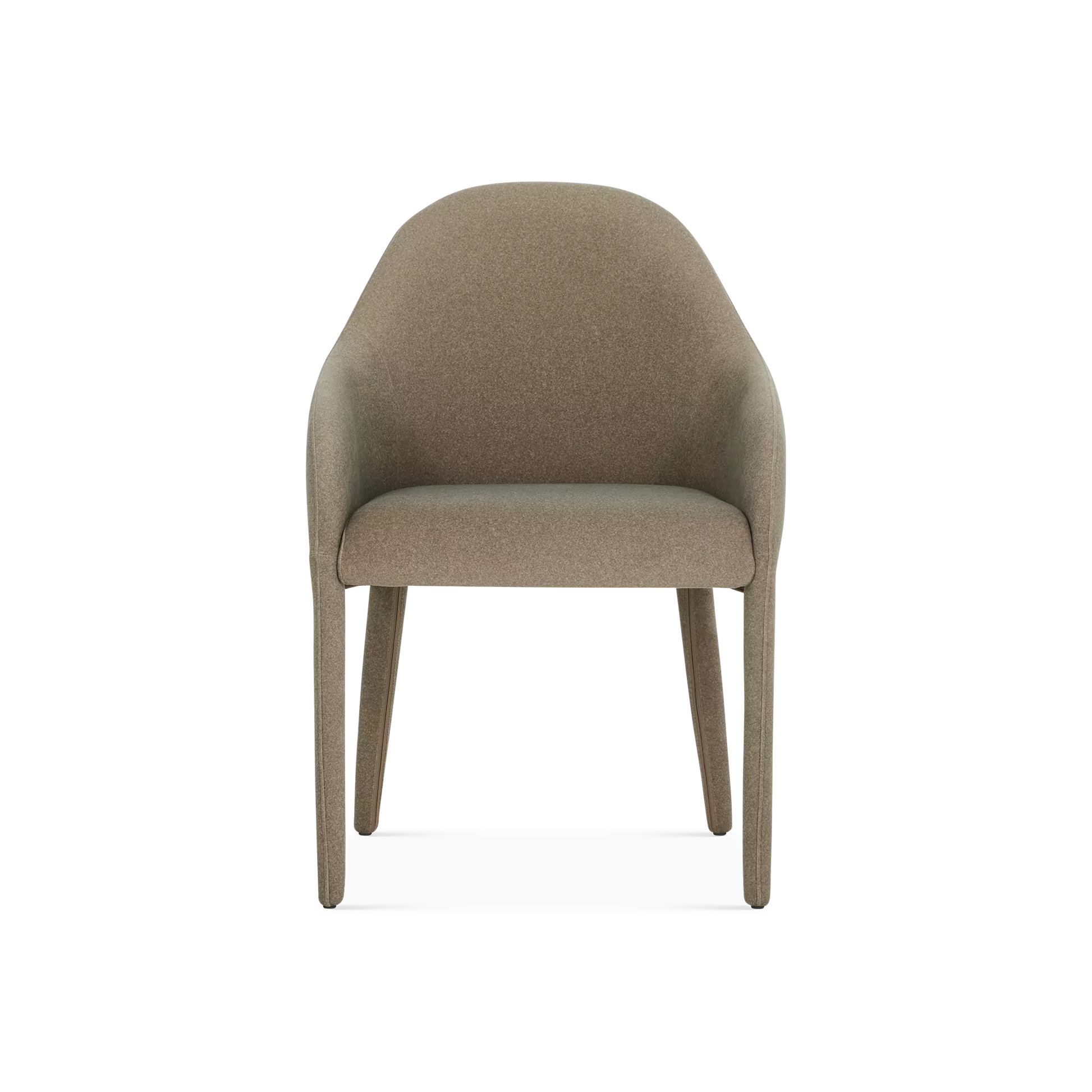 With its curved silhouette and enveloping design, this chair is perfect for dining in relaxed style. Upholstered in fabric from top to bottom, it offers a clean, monochromatic look. Its soft fabric blends in with ease, while its padded seat and integrated armrests ensure a welcoming and comfortable seating experience.