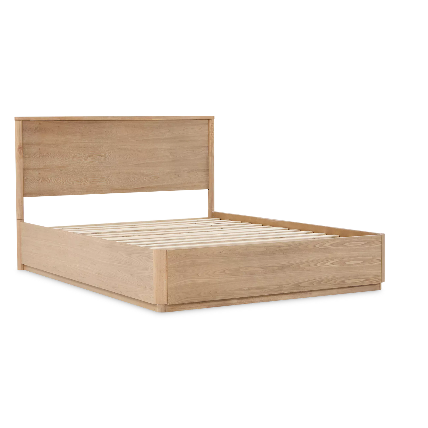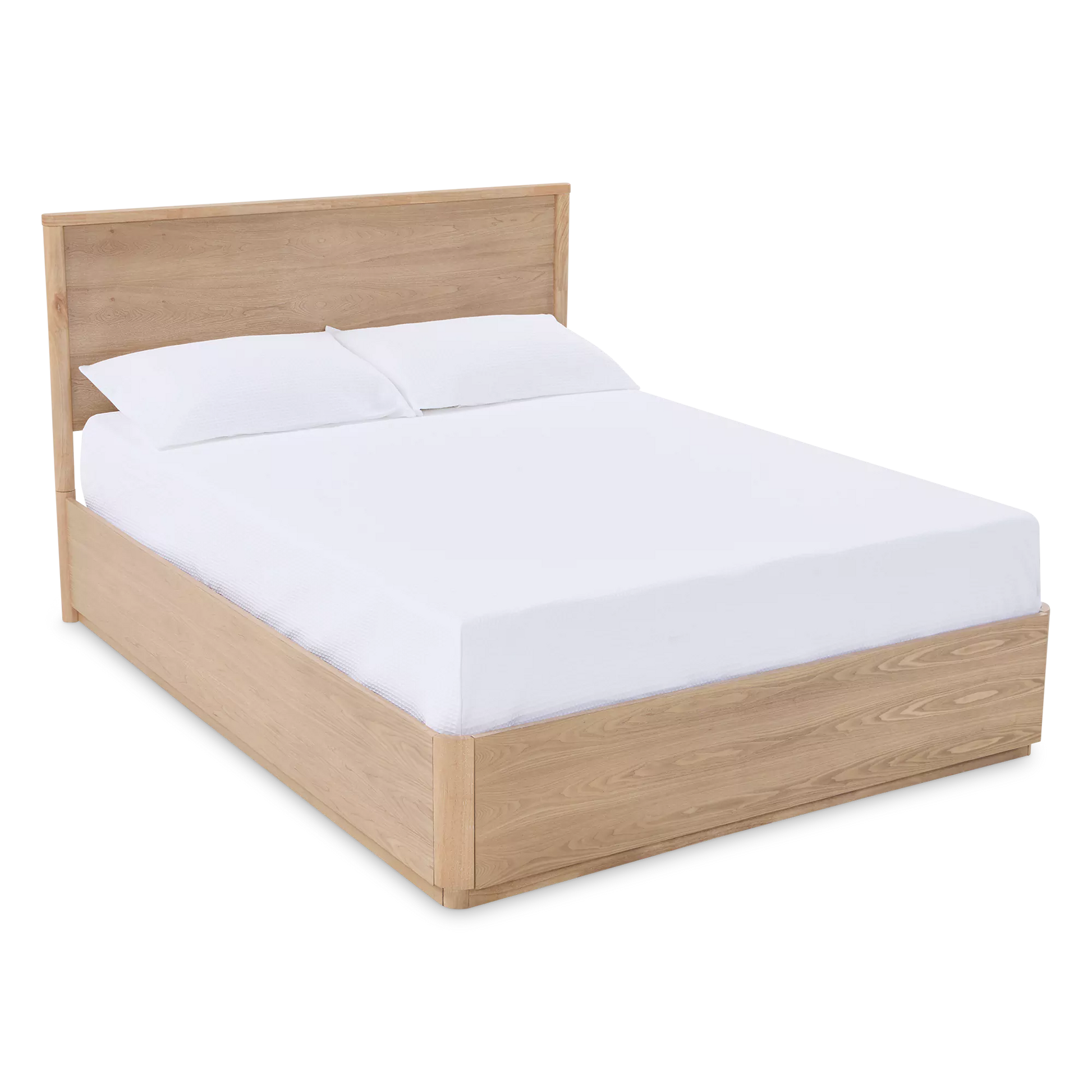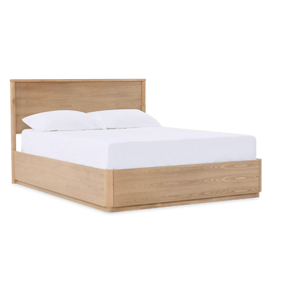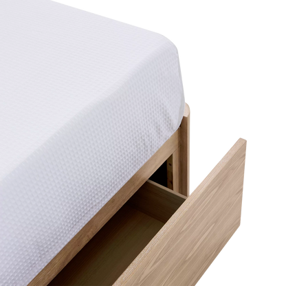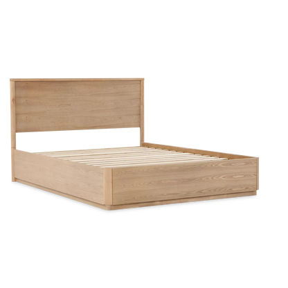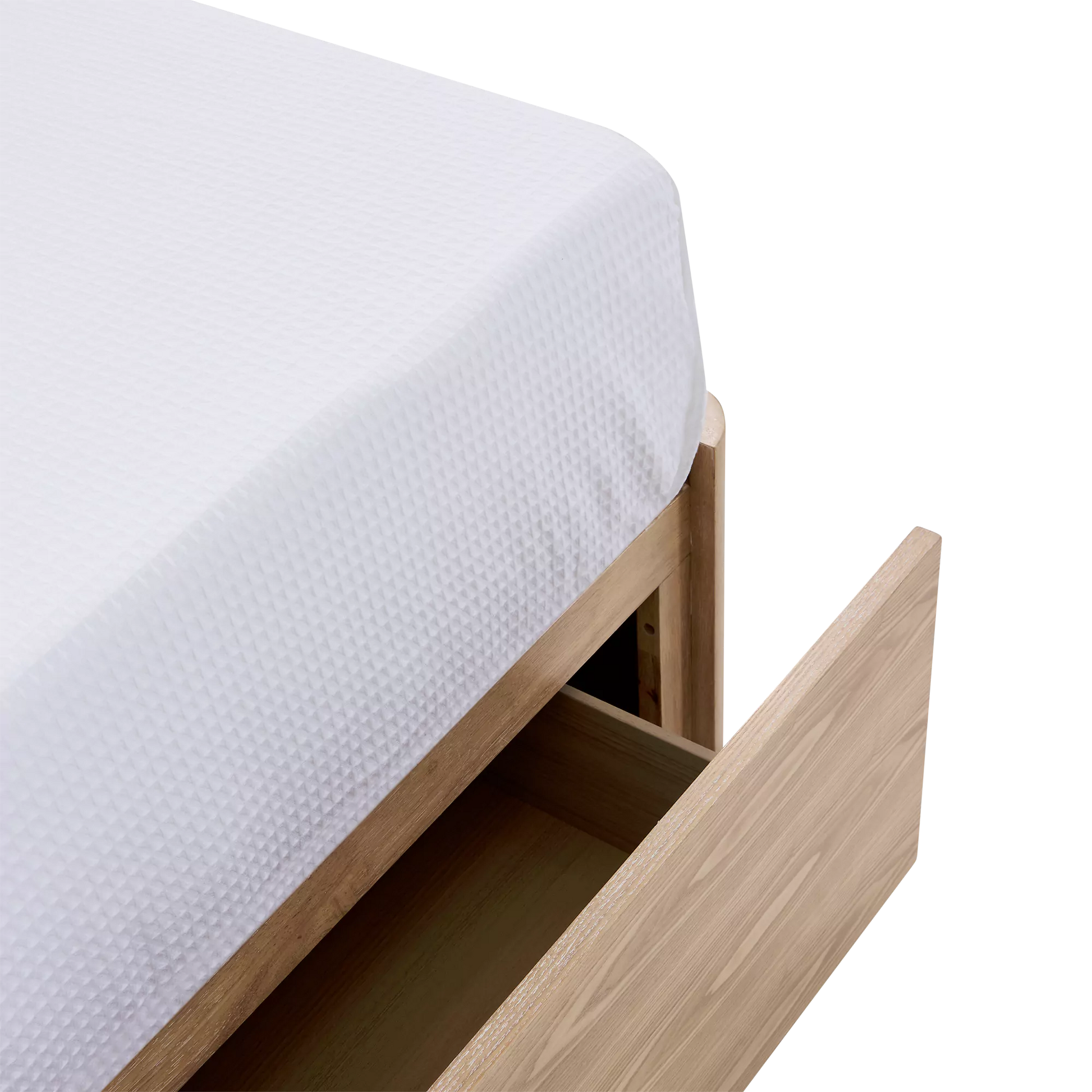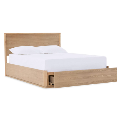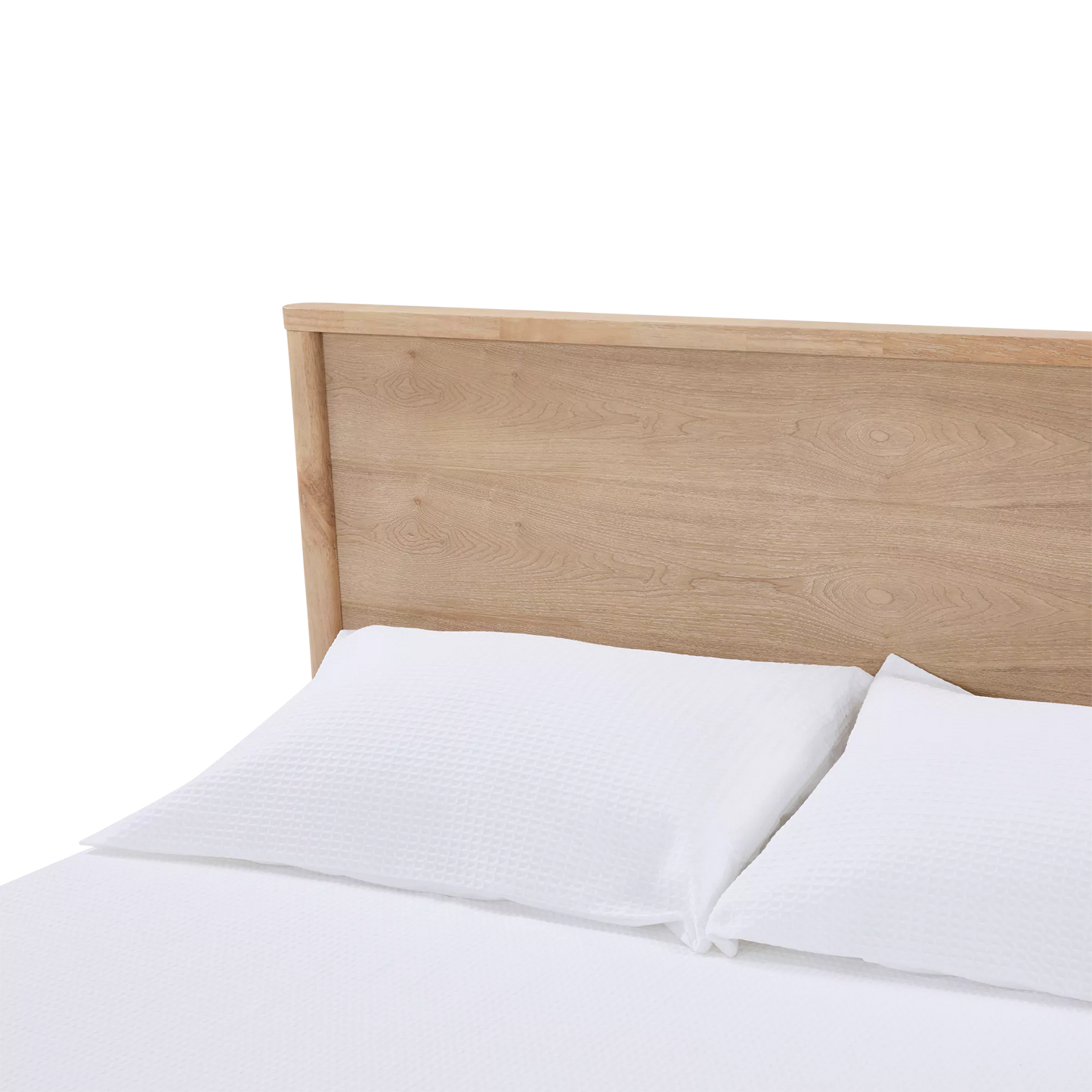 The Maiko bed combines clean design and practical function, with a beautiful blanched wood frame and spacious built-in storage drawer. Its softened edges and tall headboard give it a calming and elegant presence. Versatile and easy to style, it fits just as well in a modern bedroom as it does a rustic or country-style space.