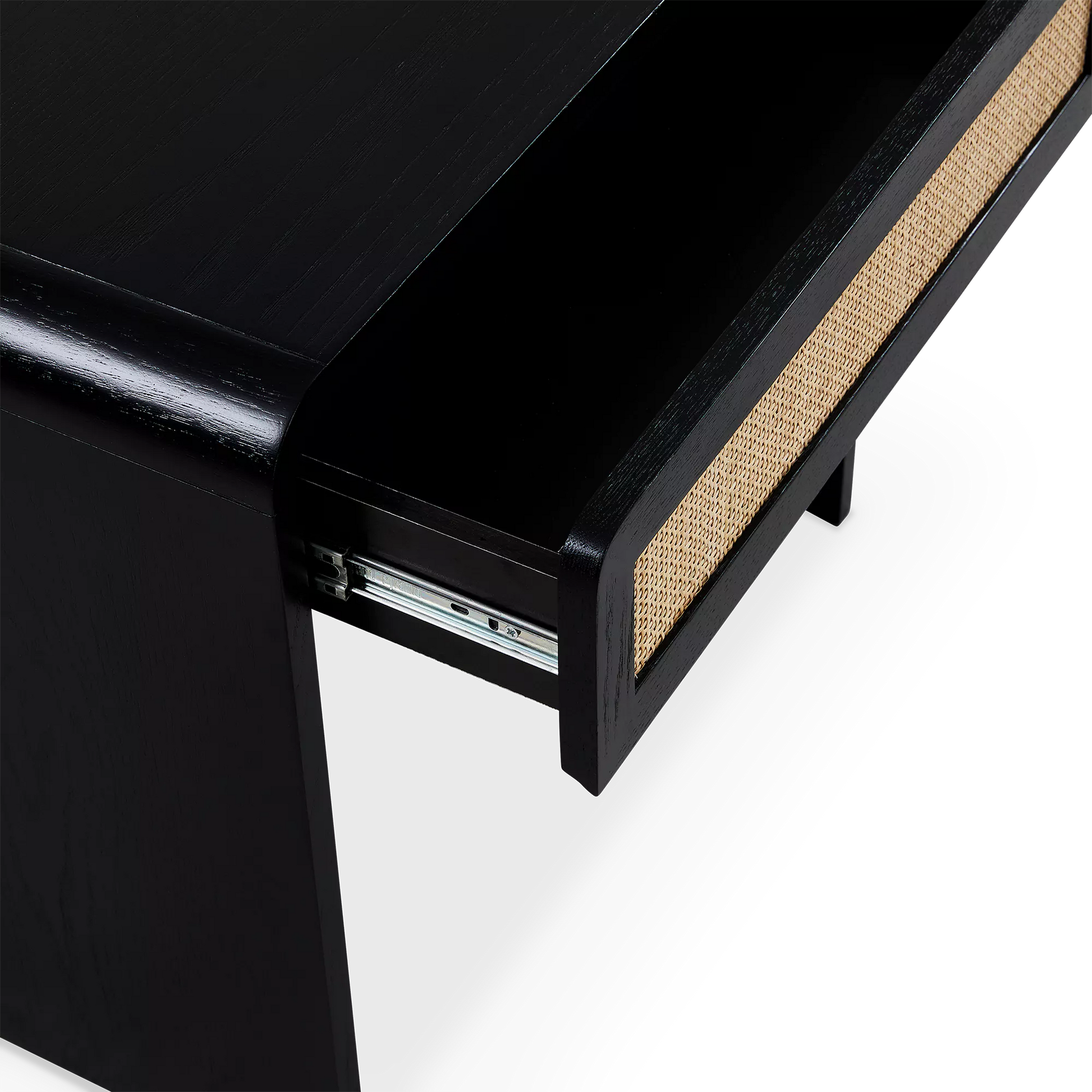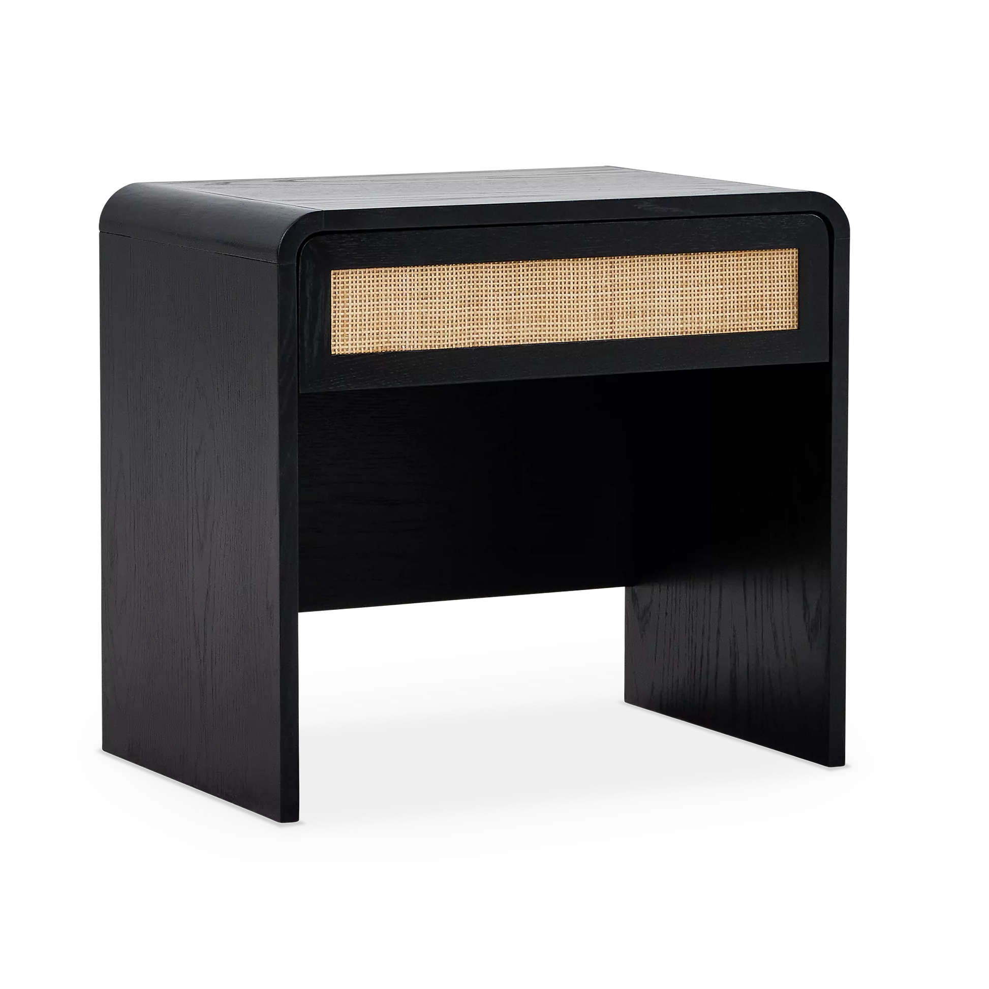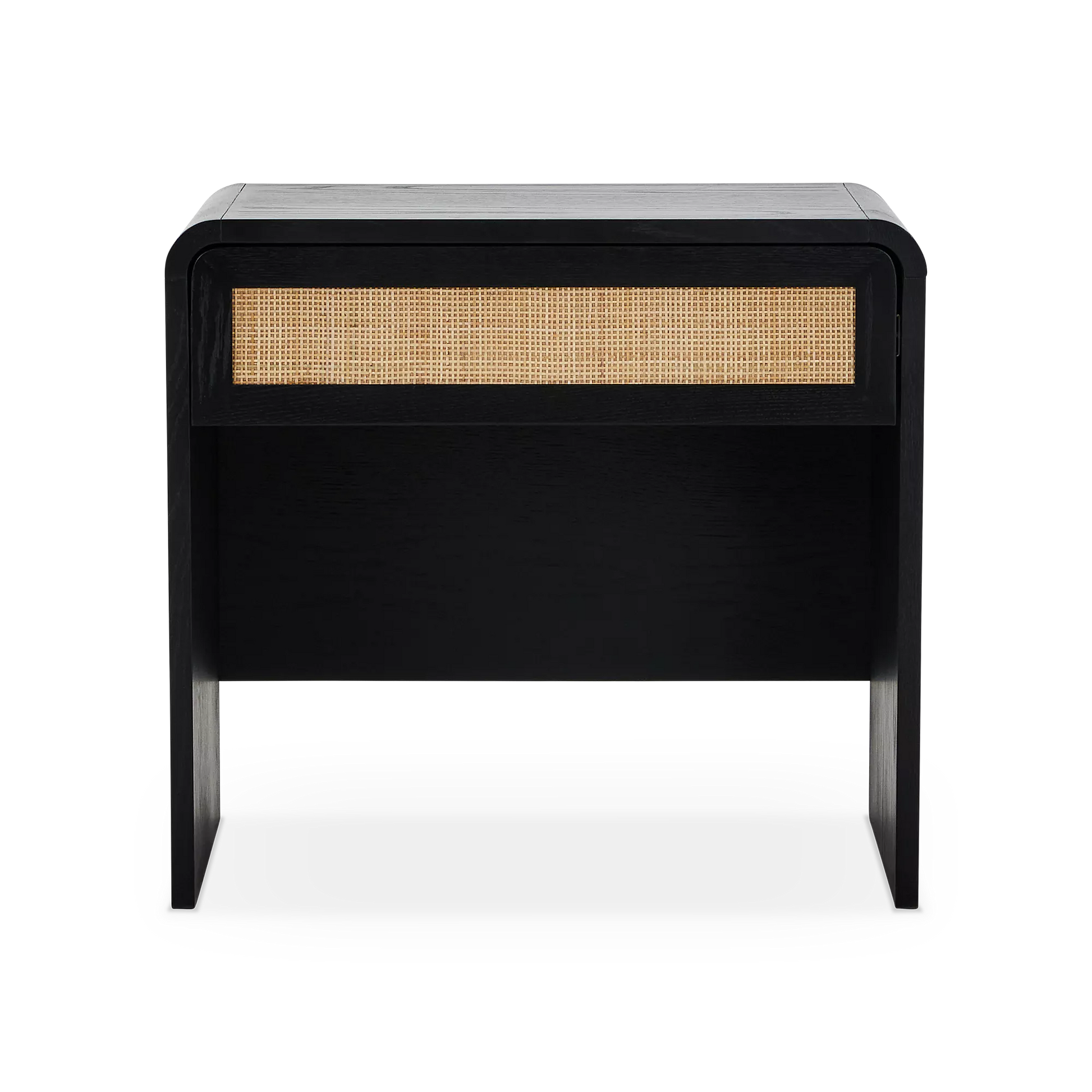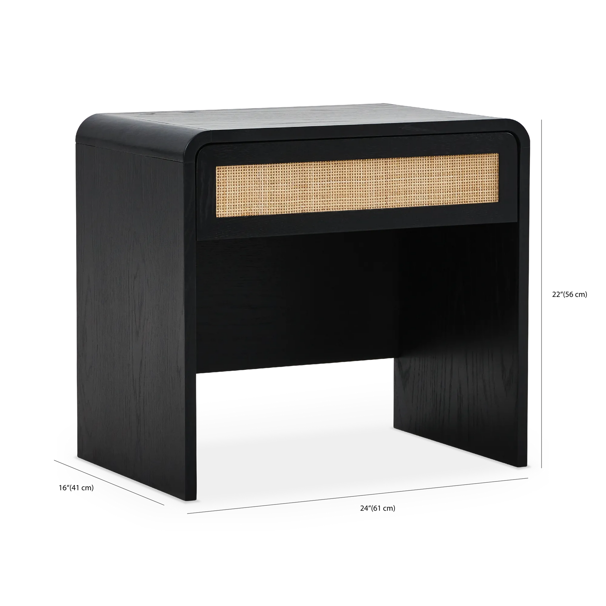 Right on trend with its rounded-corner shape and mix of rattan and black oak wood, the Marume nightstand is the ultimate piece for creating an impeccably decorated space.