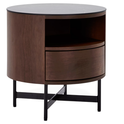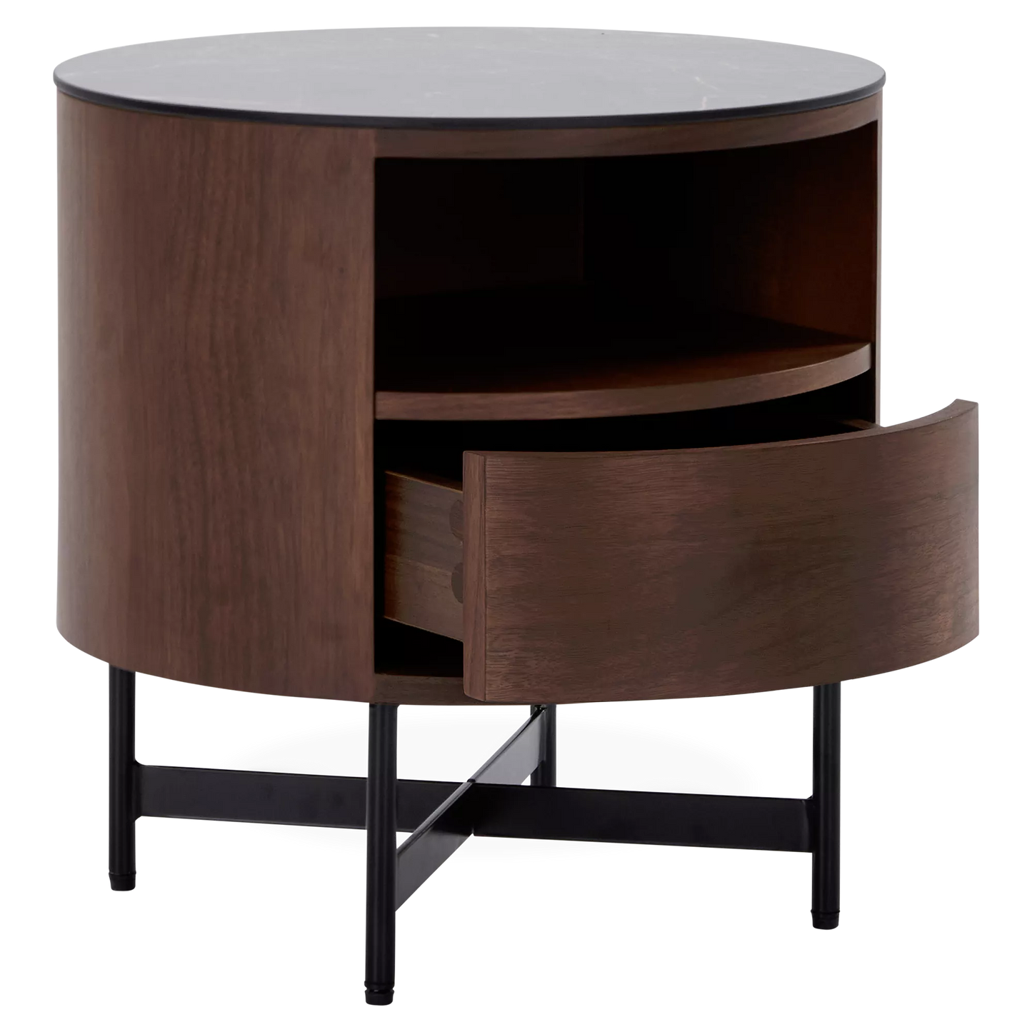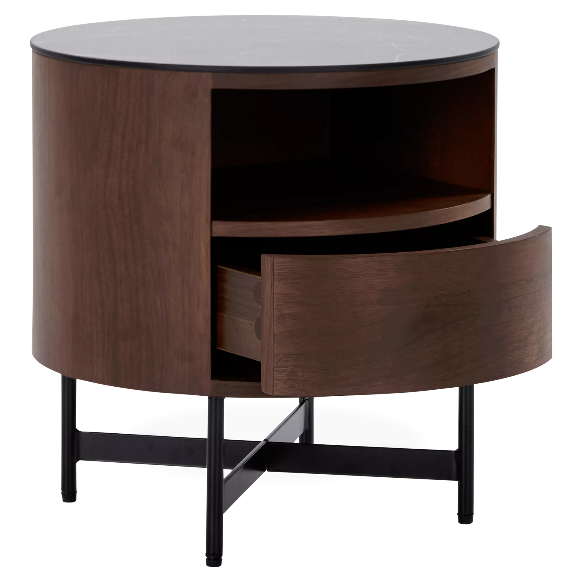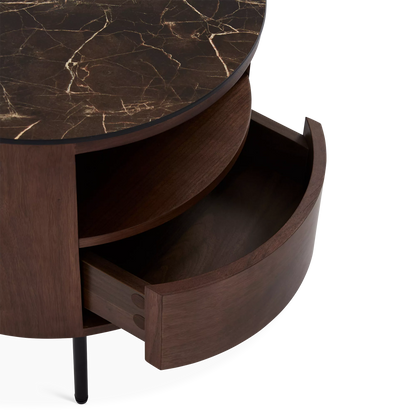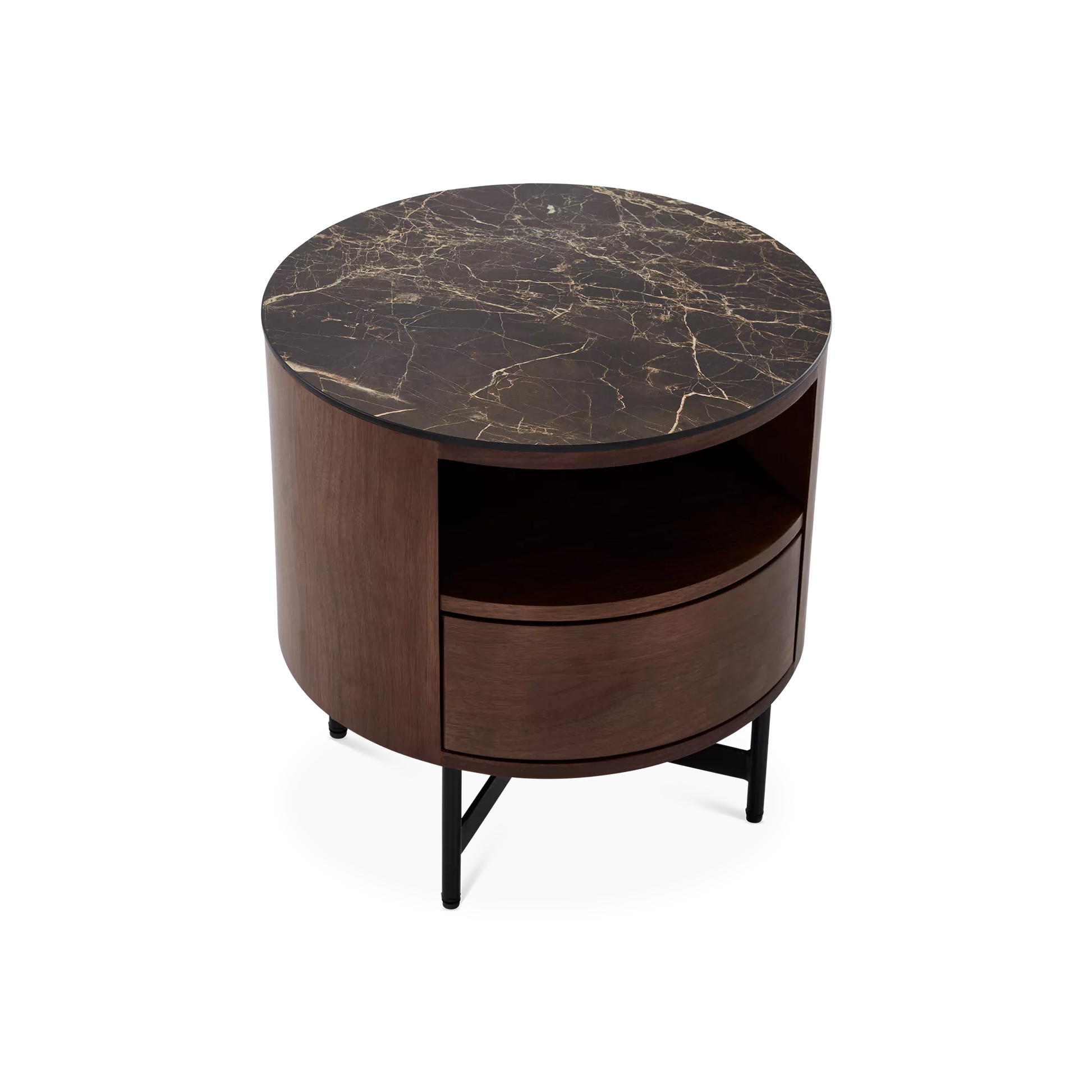 The Meli nightstand shines with exquisite curves reminiscent of a jewelry box.
