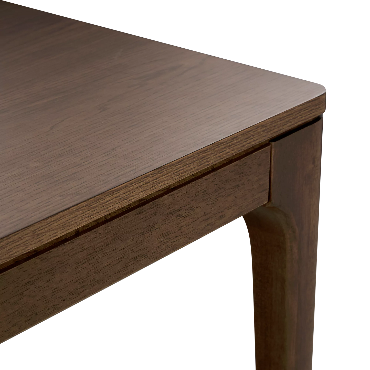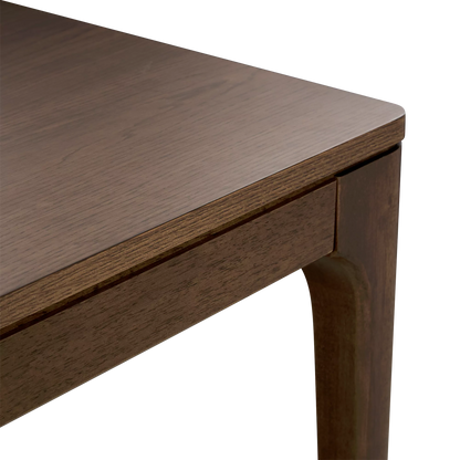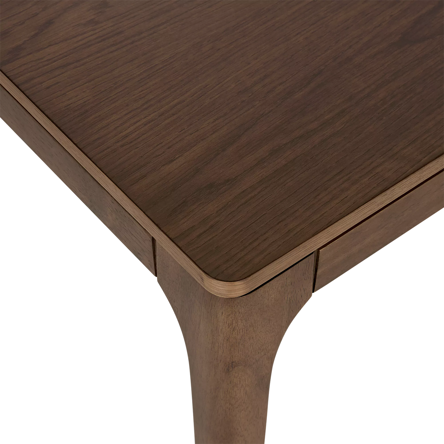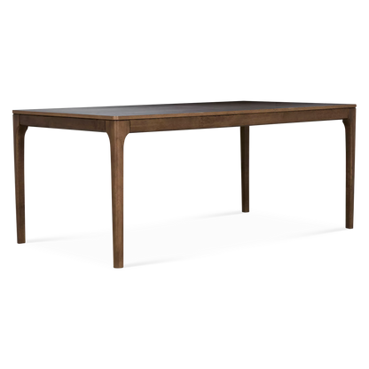 The Millie dining table charms with its clean lines and balanced design. Crafted from stained walnut veneer, it features a rectangular top with softened corners and slender legs that lend a light, refined look. A chic and timeless addition to any dining space.