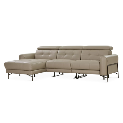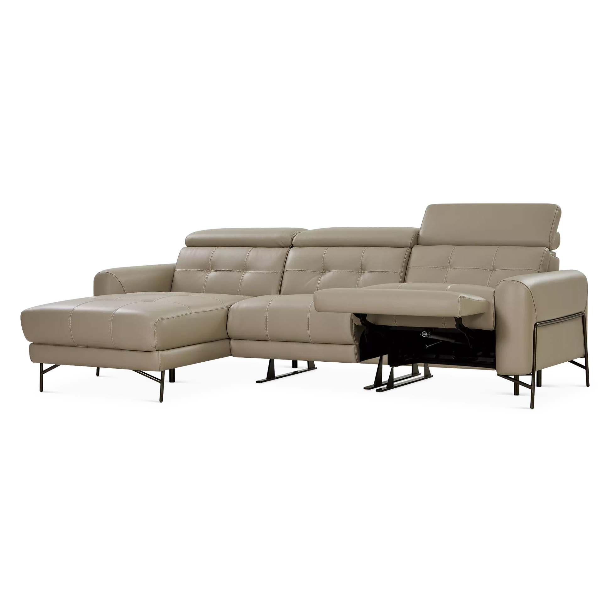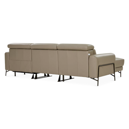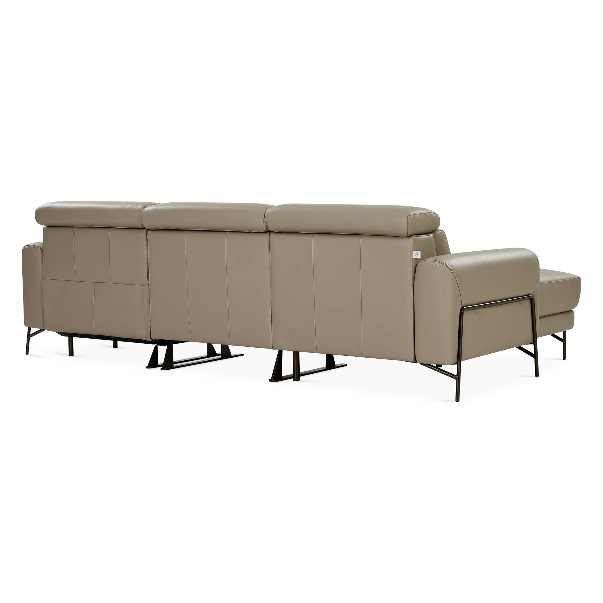 The Modena leather sectional offers an elegant look and adaptable design. It promises customized comfort with its power-recline backrest and adjustable headrests. Its reversible chaise lounge allows it to adapt to any space, while its metal legs add an airy touch, making it the perfect addition to any modern, sophisticated living room.