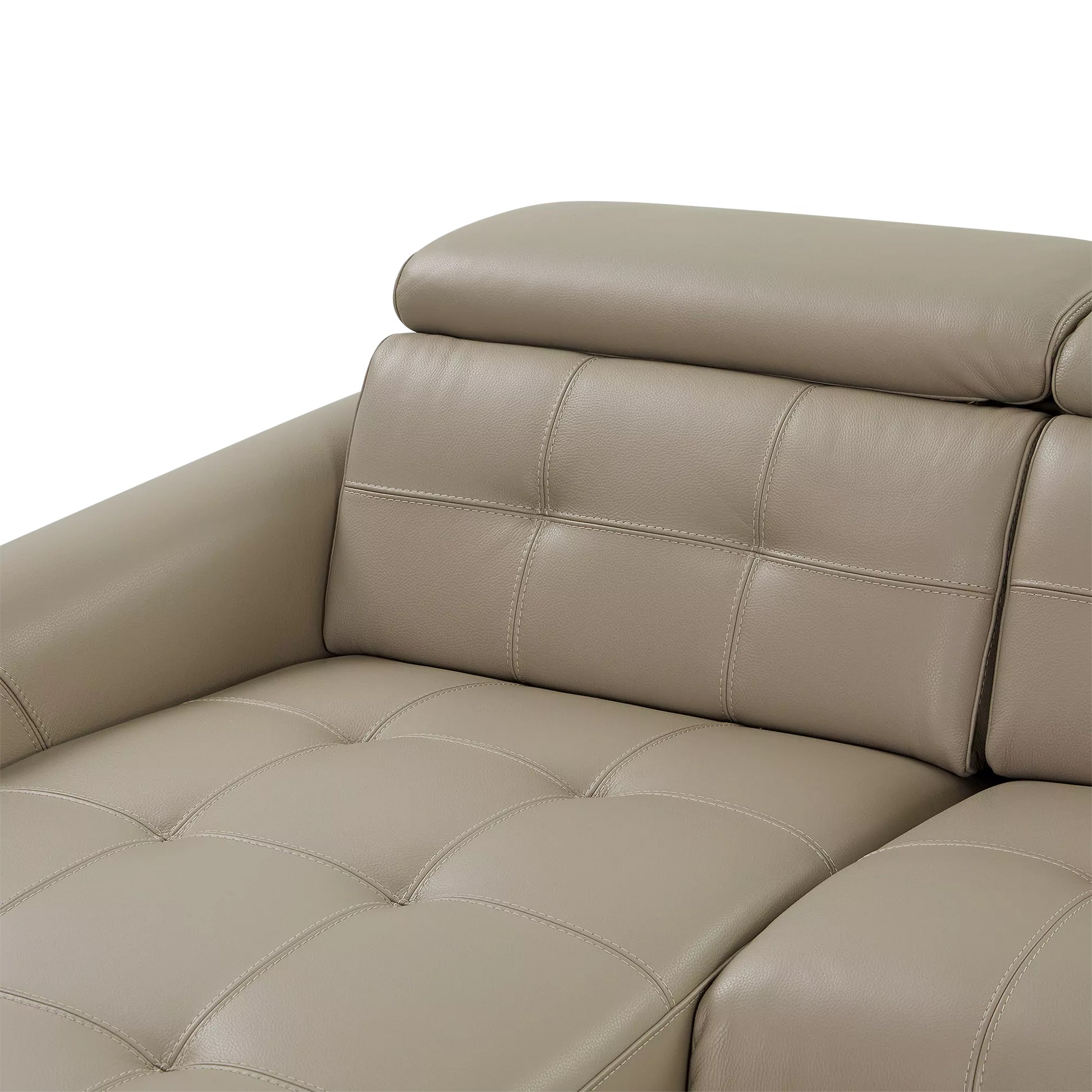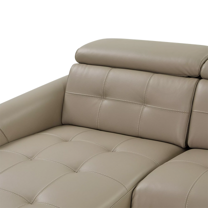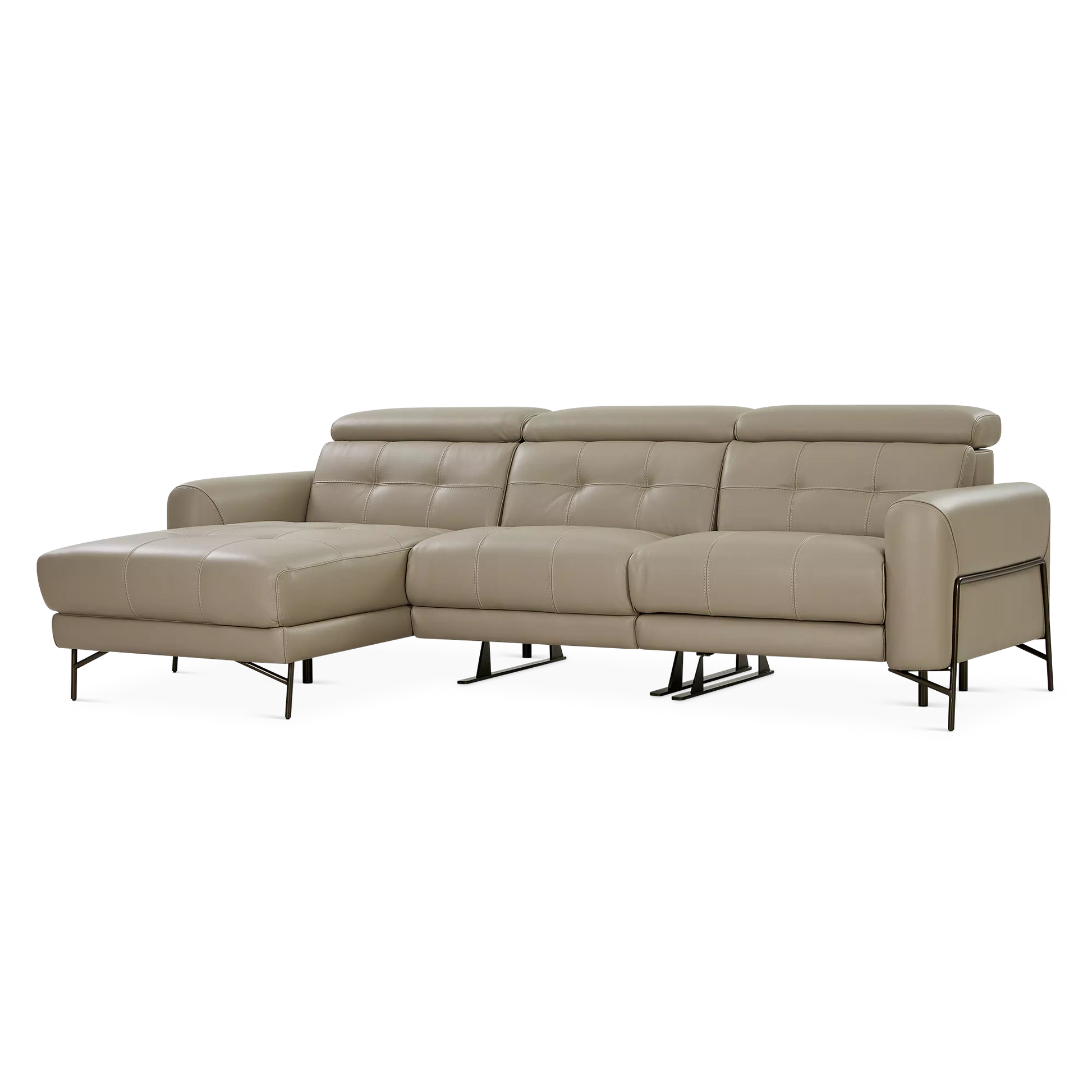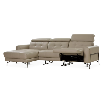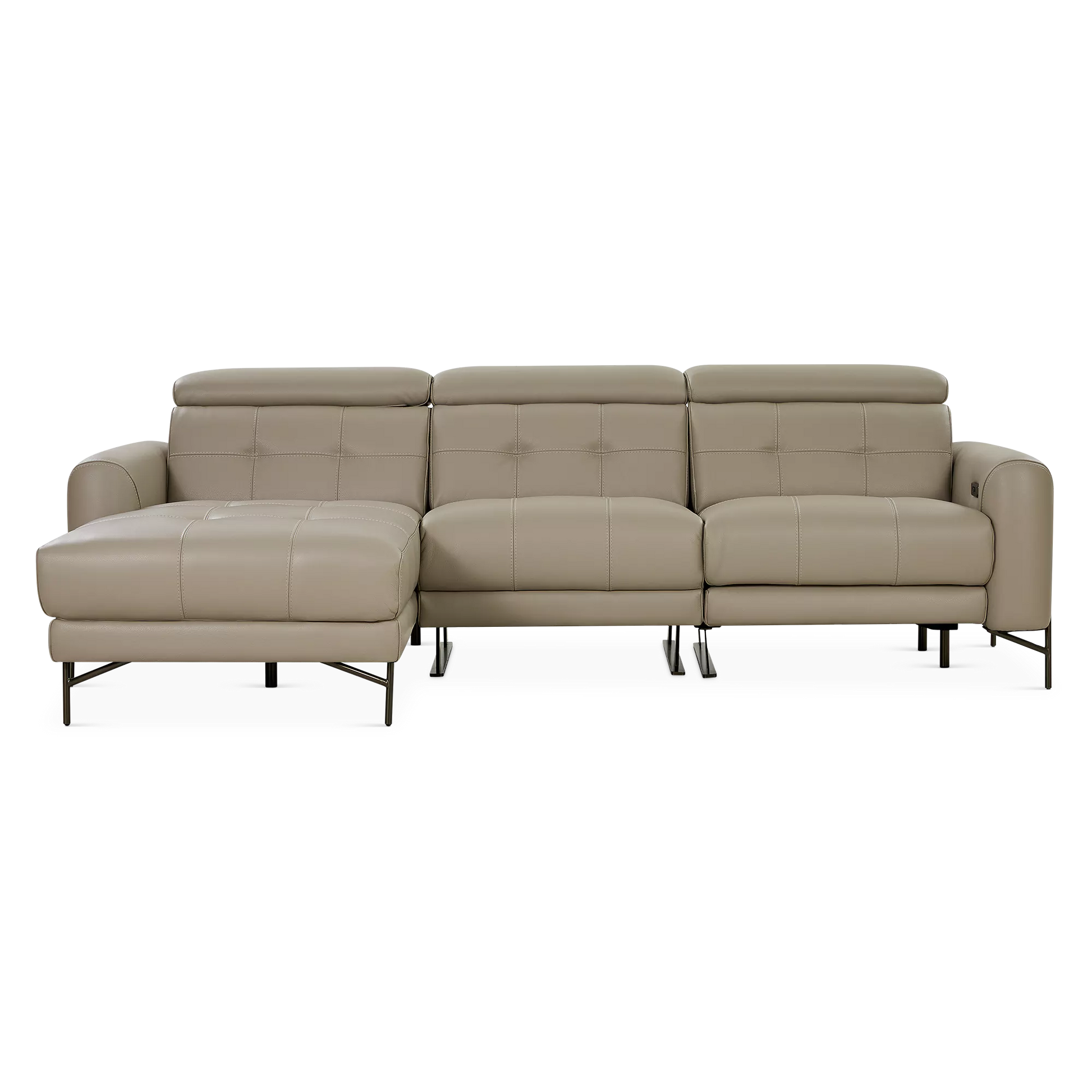 The Modena leather sectional offers an elegant look and adaptable design. It promises customized comfort with its power-recline backrest and adjustable headrests. Its reversible chaise lounge allows it to adapt to any space, while its metal legs add an airy touch, making it the perfect addition to any modern, sophisticated living room.