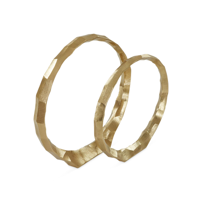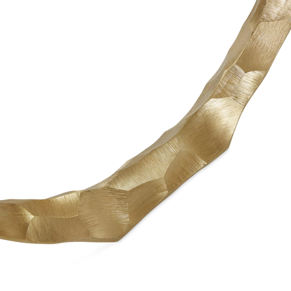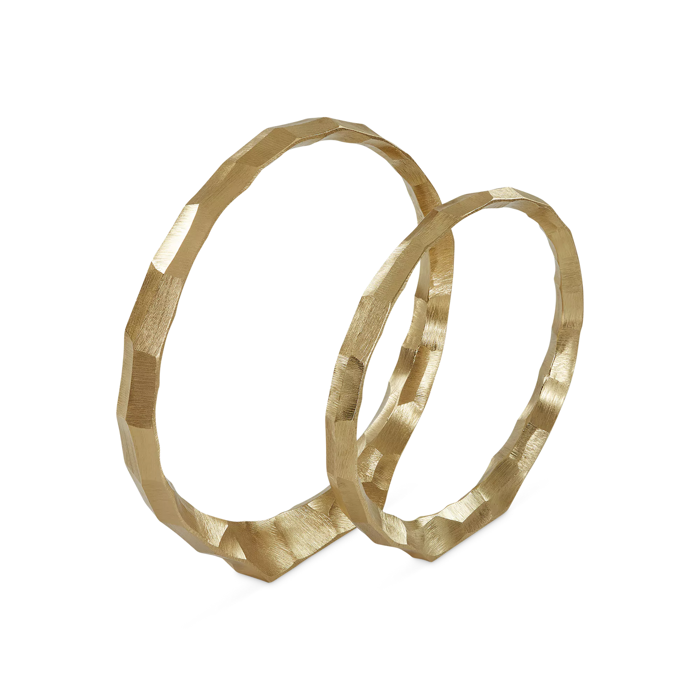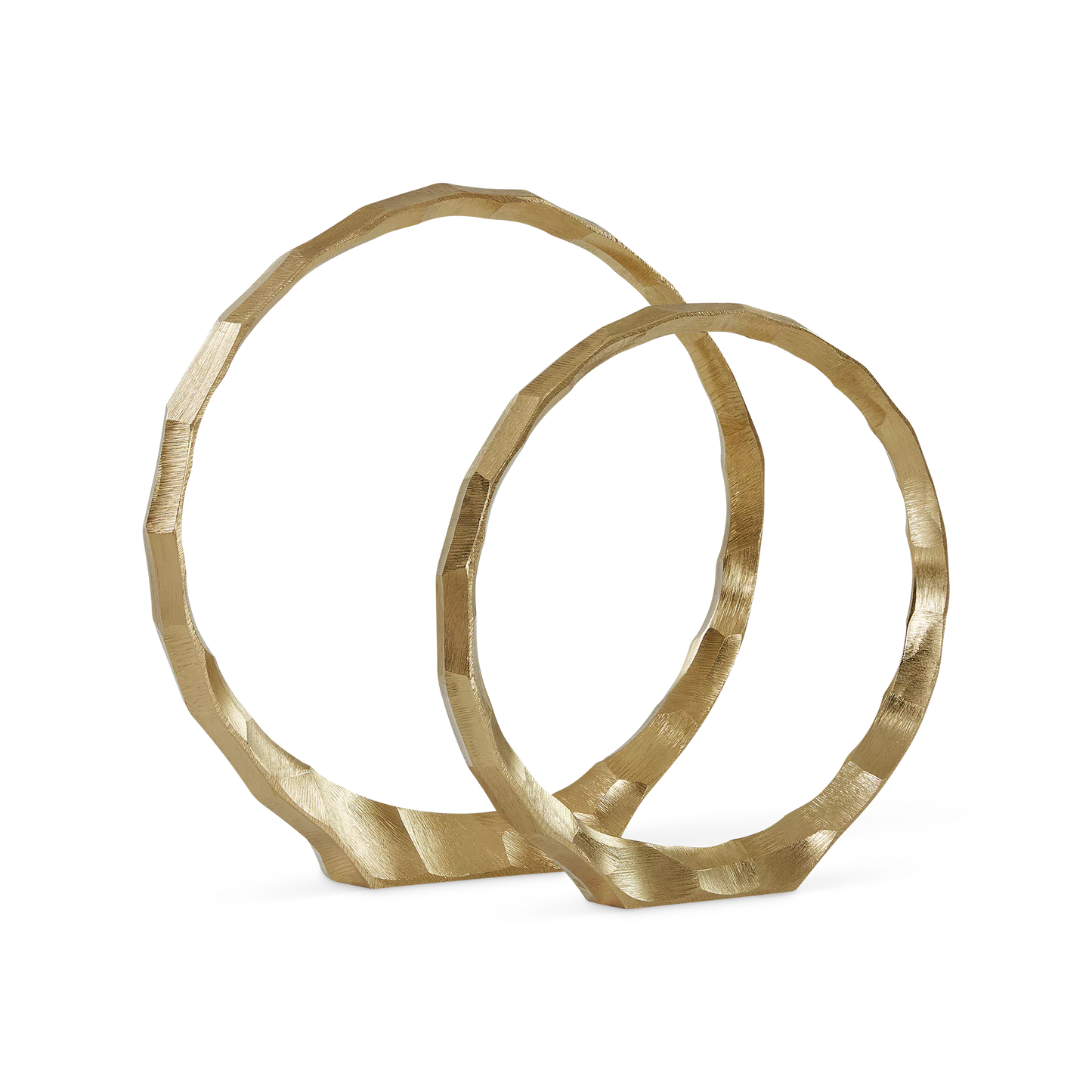 This set of gold metal sculptures captures the light in elegant style. Their hammered, irregular forms brings texture and movement to any decor, whether displayed on a console, bookshelf or table. A modern composition with radiant appeal.