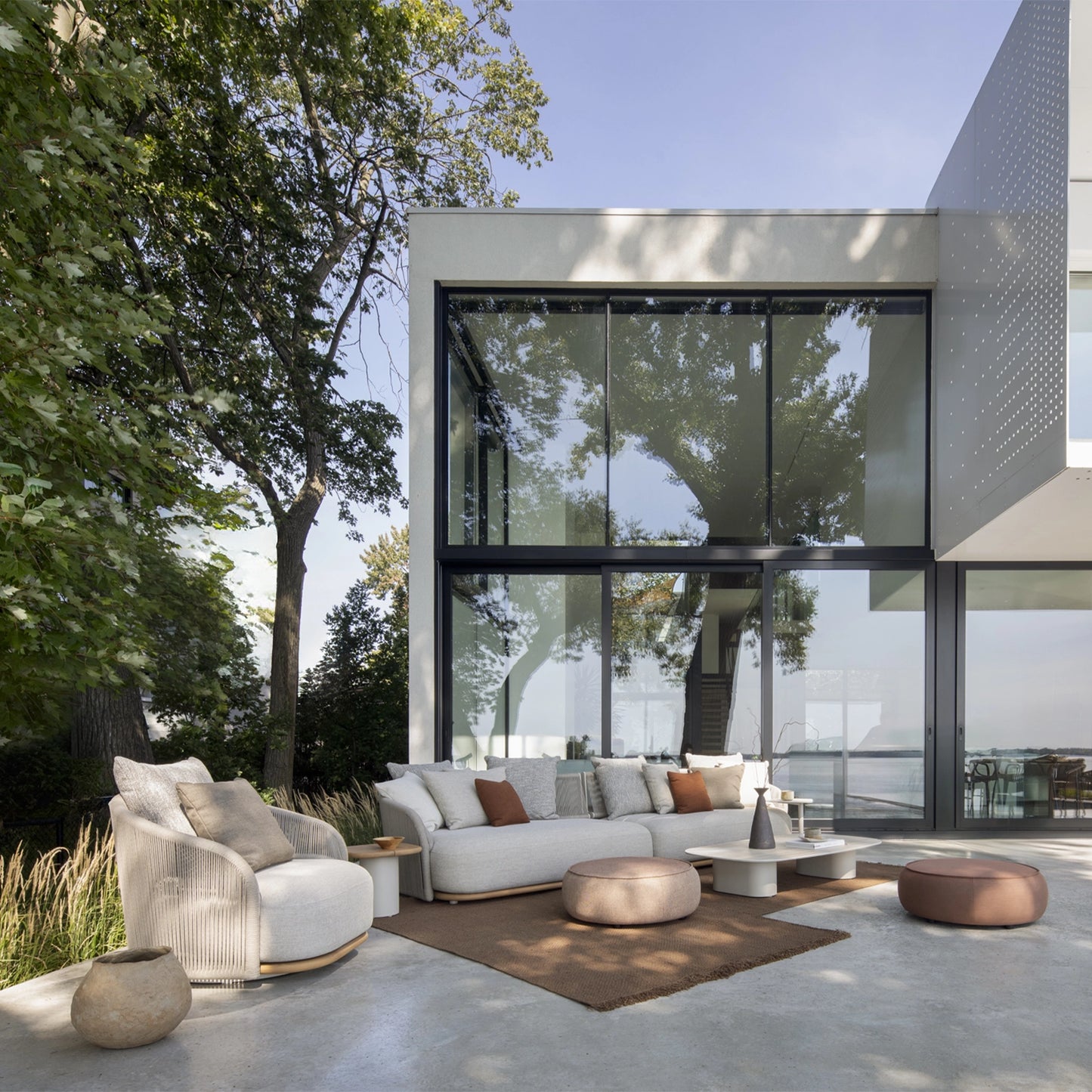 The Muscade swivel armchair sculpts an organic allure where the solid teak base dialogues with the rigor of architectural weaving. Its backrest, a corolla of taut ropes, creates kinetic play of shadows that rhythm the space. The generous volume of the seat deploys a textile minerality, magnified by earth and rock tones. Between technical sophistication and noble materials, this piece inhabits the outdoors with serene radicality, anchoring its circular geometry in a suspended temporality.