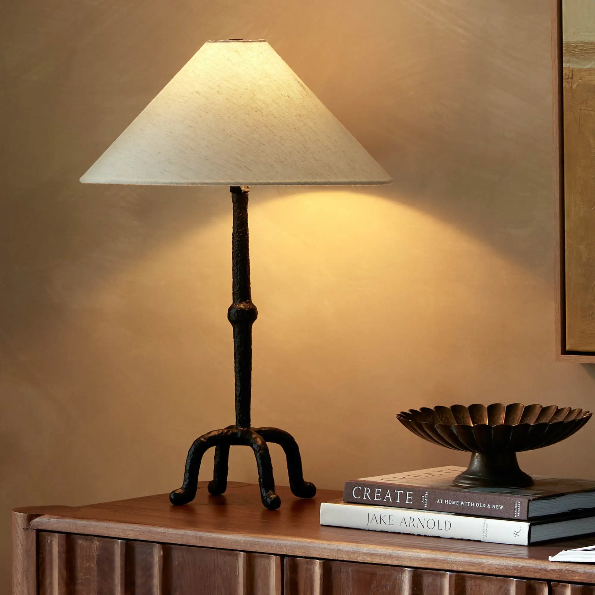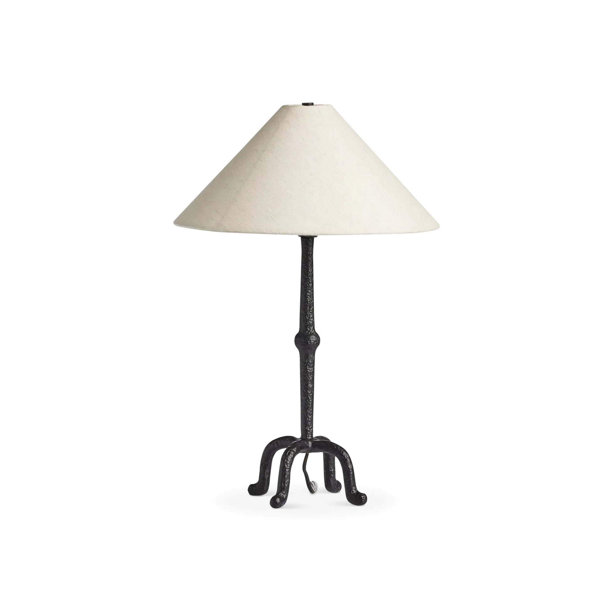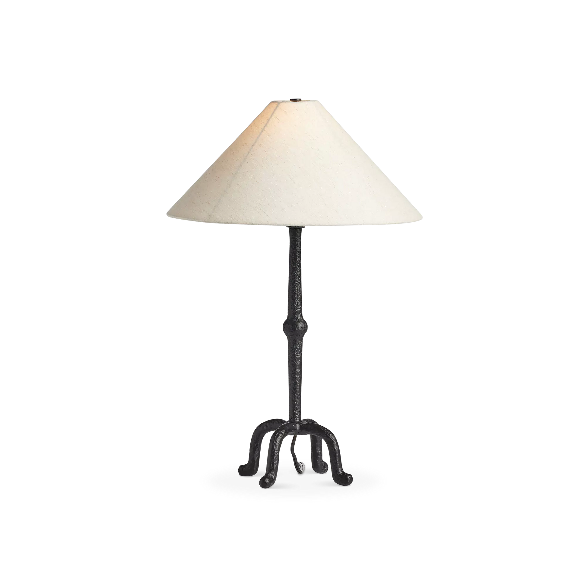 The Neville table lamp by Four Hands revisits the silhouette of classic candlesticks by employing a black aluminium base with sculpted lines. Its tapered linen shade softly filters the light to create a cozy ambiance. A stylish addition with a subtle yet striking presence.