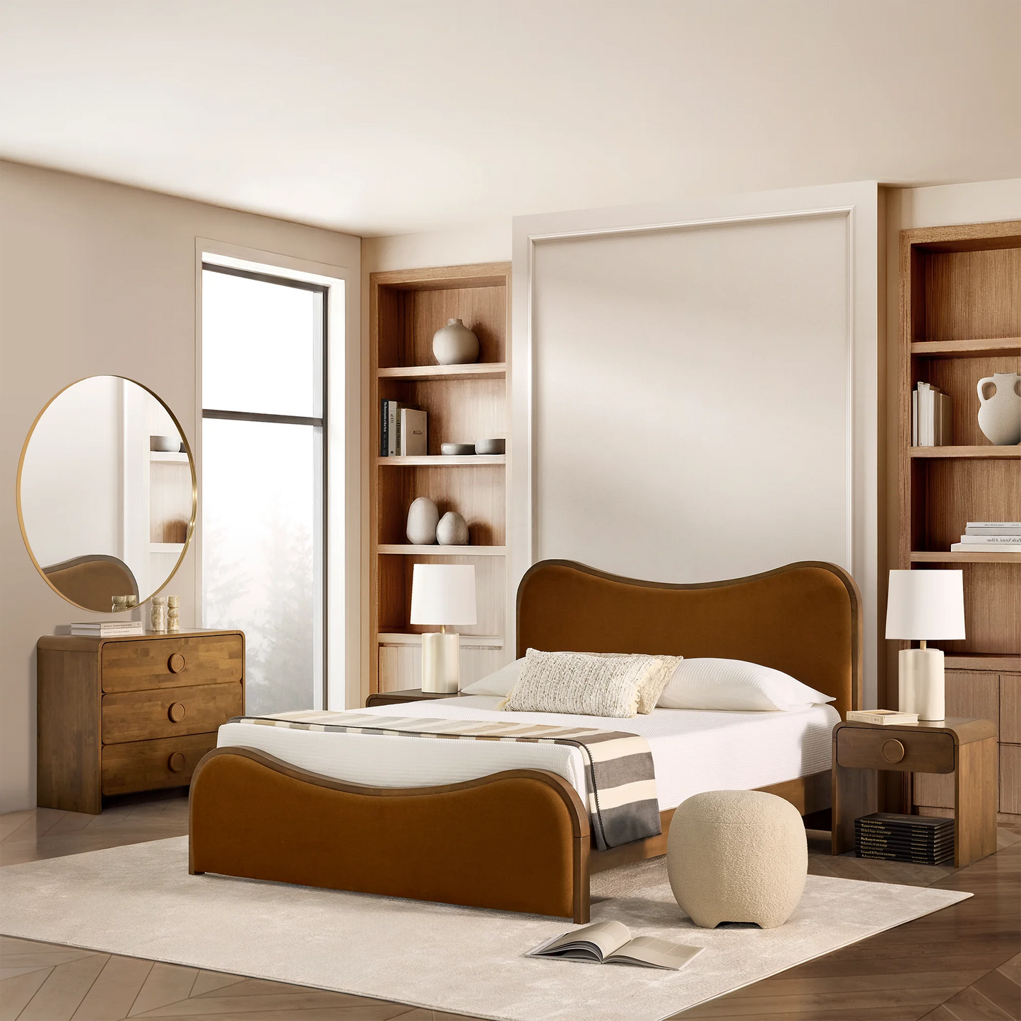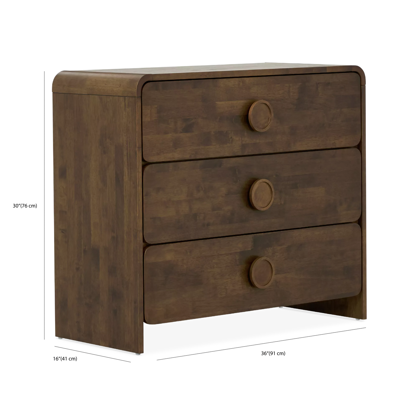 The Noemi dresser puts a fresh twist on 1960s style with its curved lines and distinctive circular handles. Crafted entirely from walnut veneer, it features three spacious drawers and strikes the perfect balance between retro charm and contemporary elegance.
