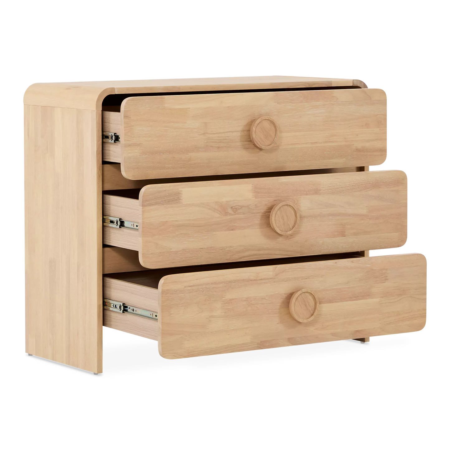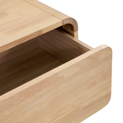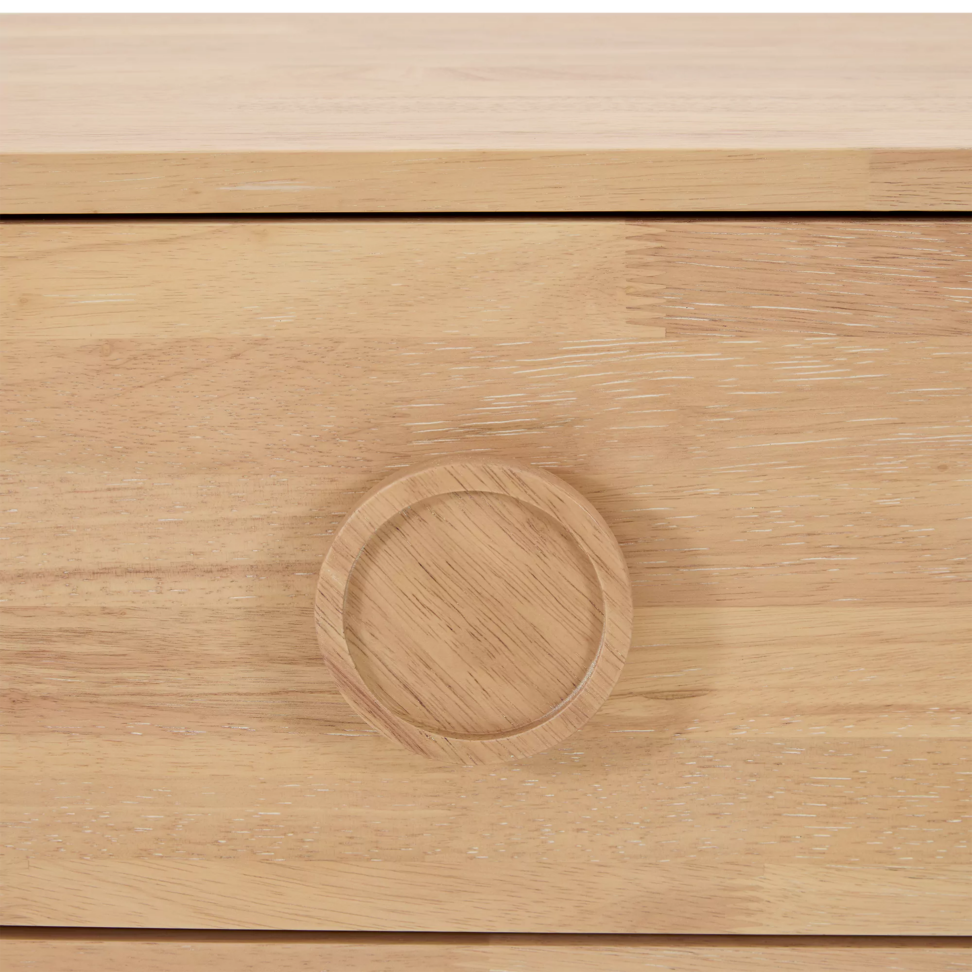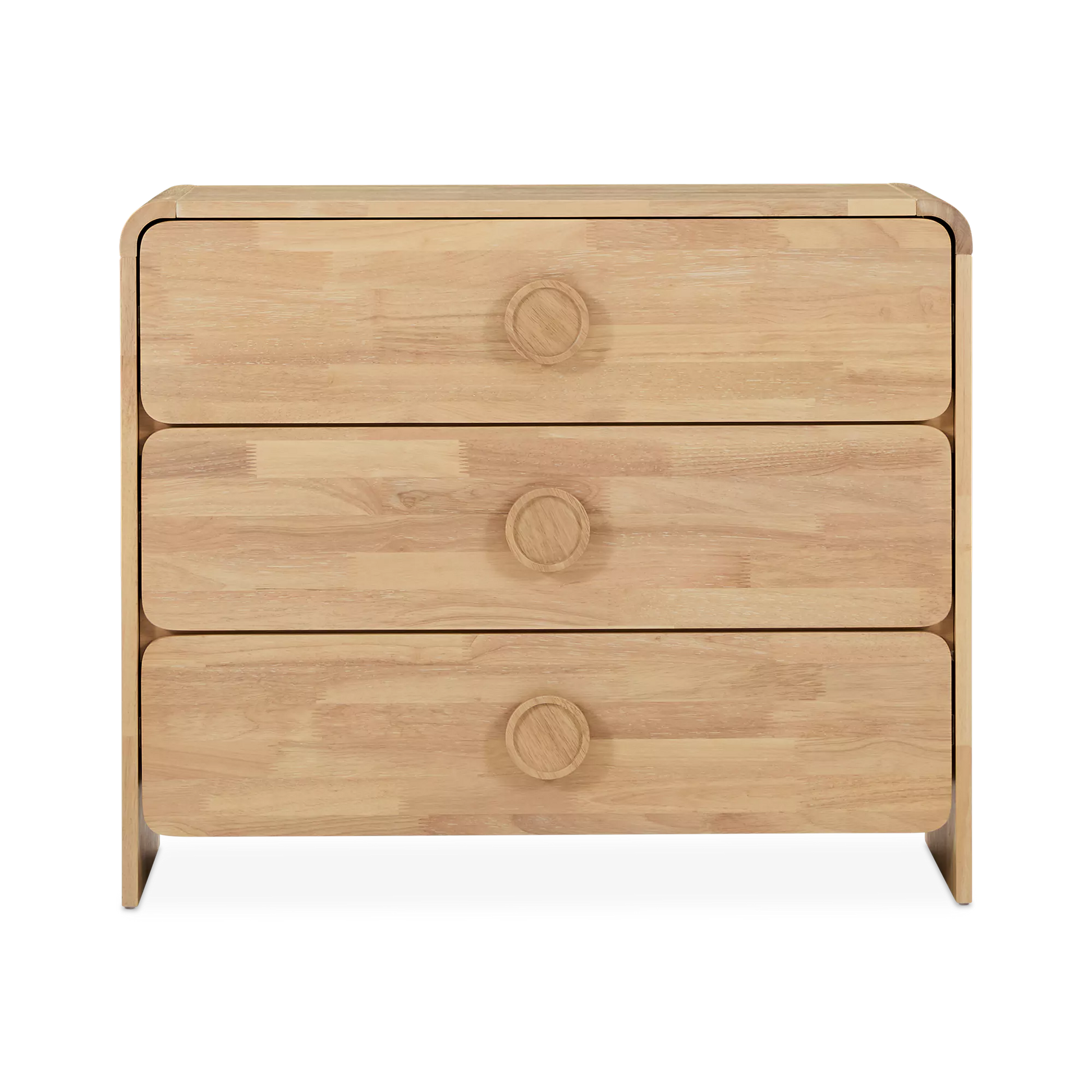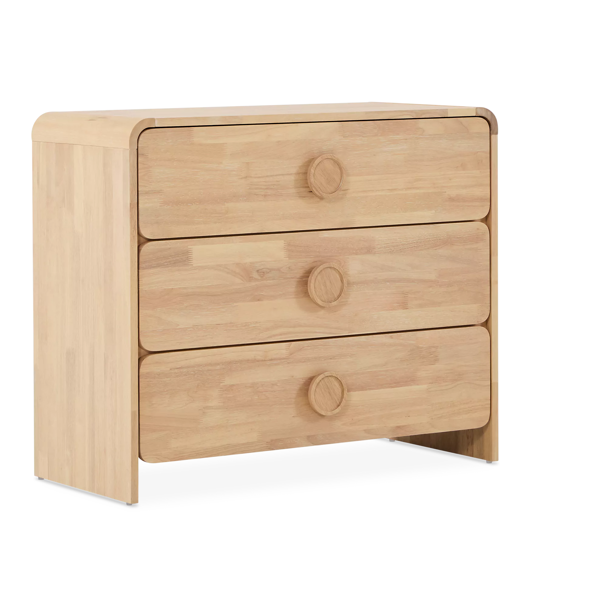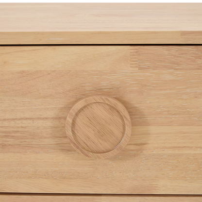 The Noemi dresser puts a fresh twist on 1960s style with its curved lines and distinctive circular handles. Crafted entirely from walnut veneer, it features three spacious drawers and strikes the perfect balance between retro charm and contemporary elegance.