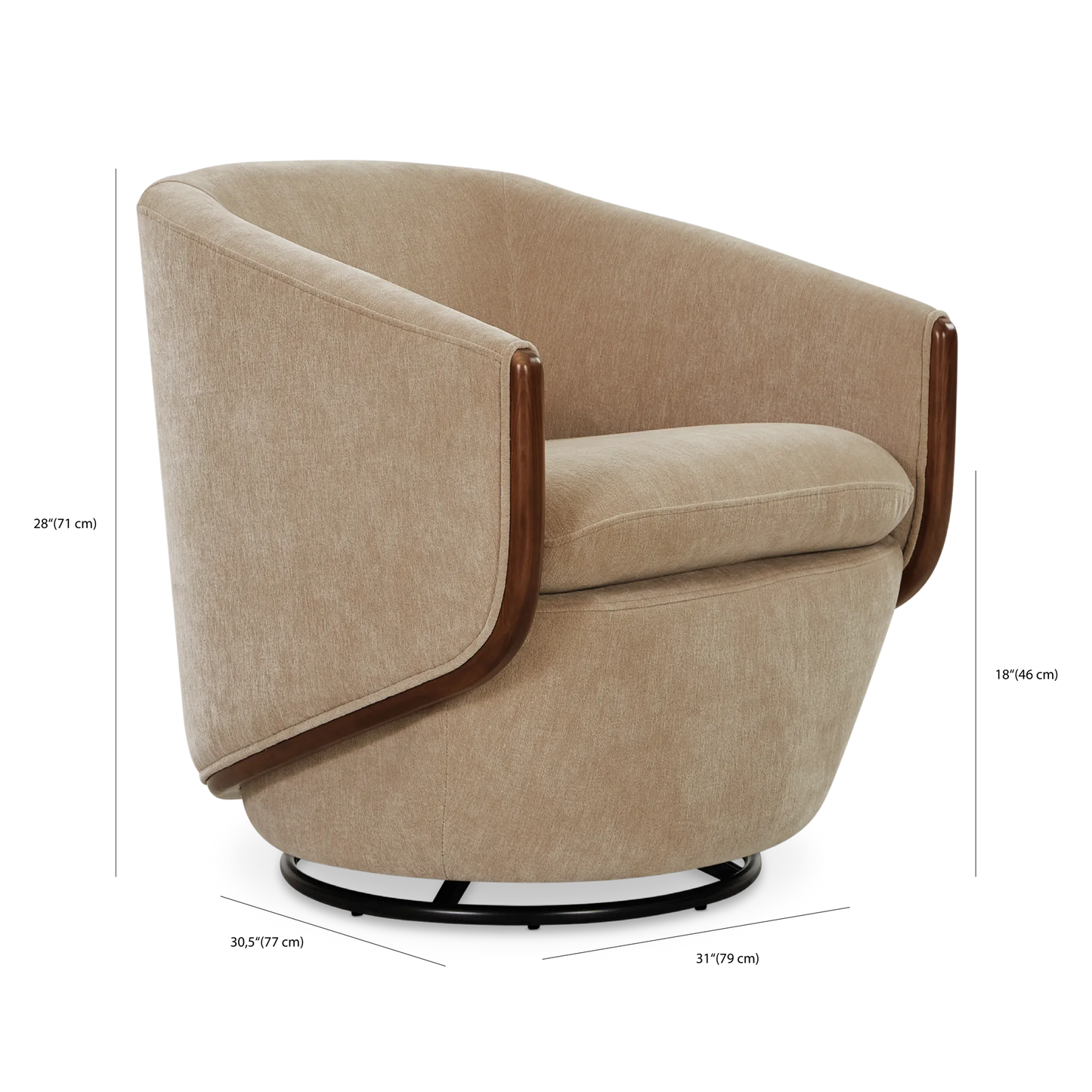 The Nola chair offers a comfortable and fluid seating experience with its rounded form and swivel base. Wood trim frames its generous silhouette while giving its sleek style an organic touch. Perfect for softening a modern decor or warming up a neutral ambiance.