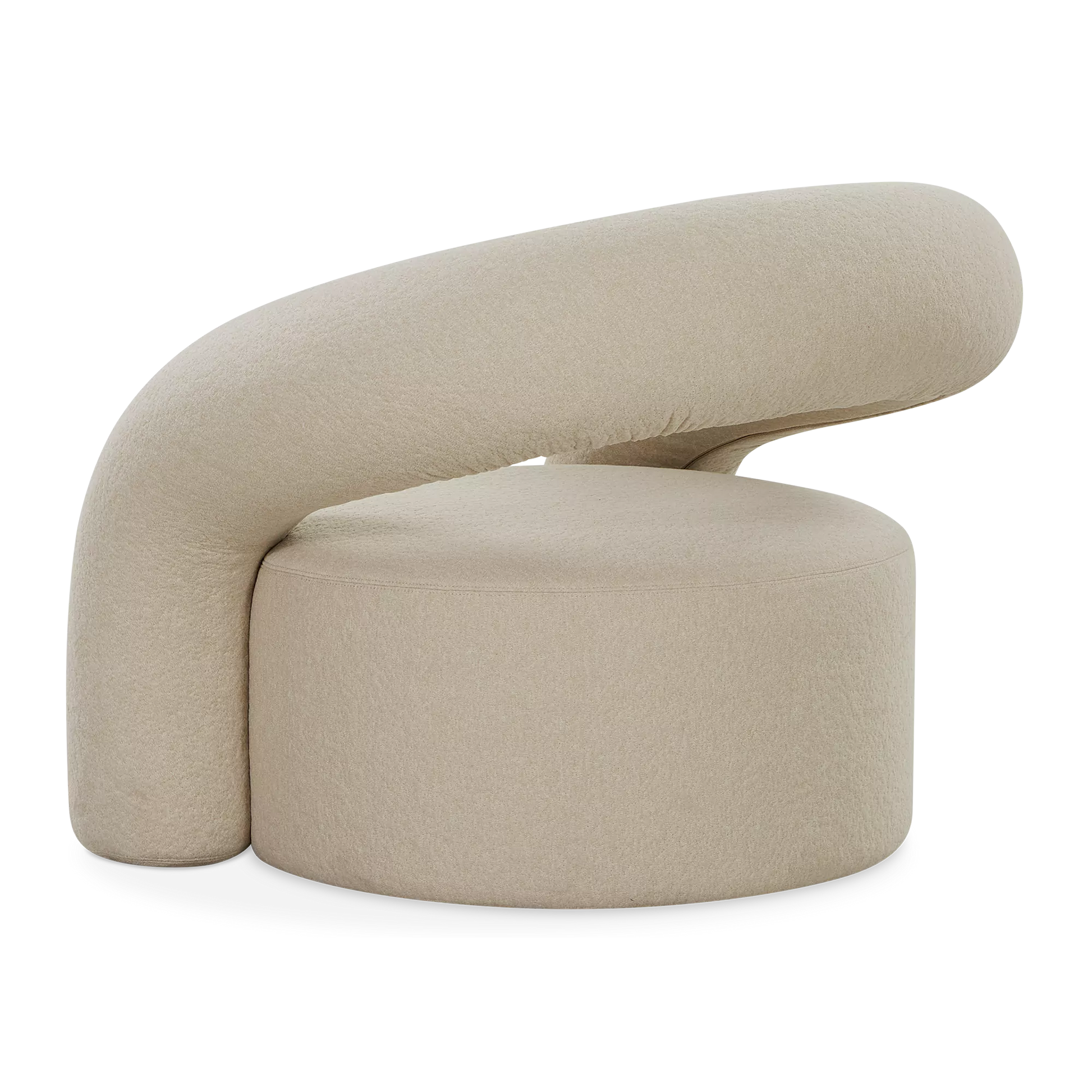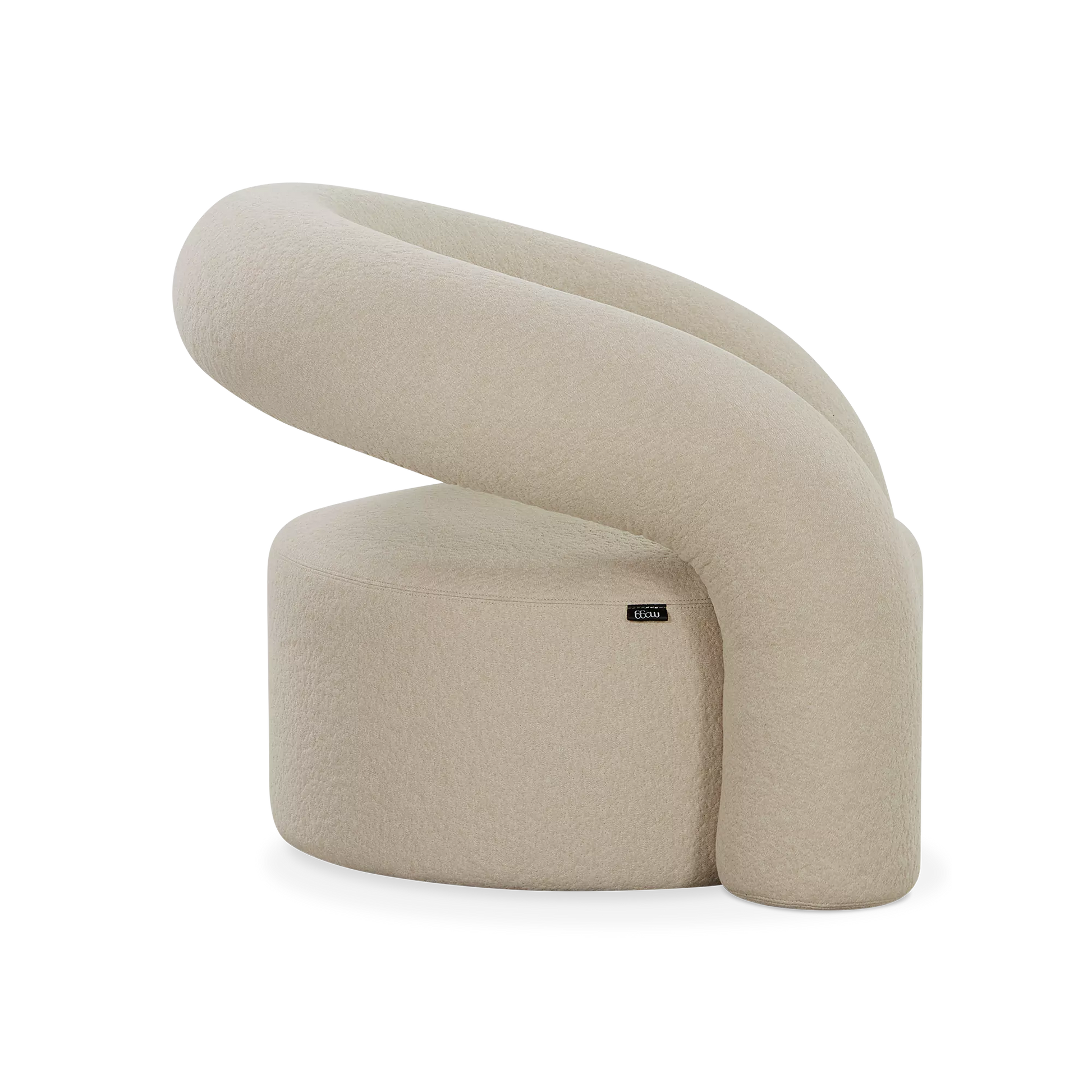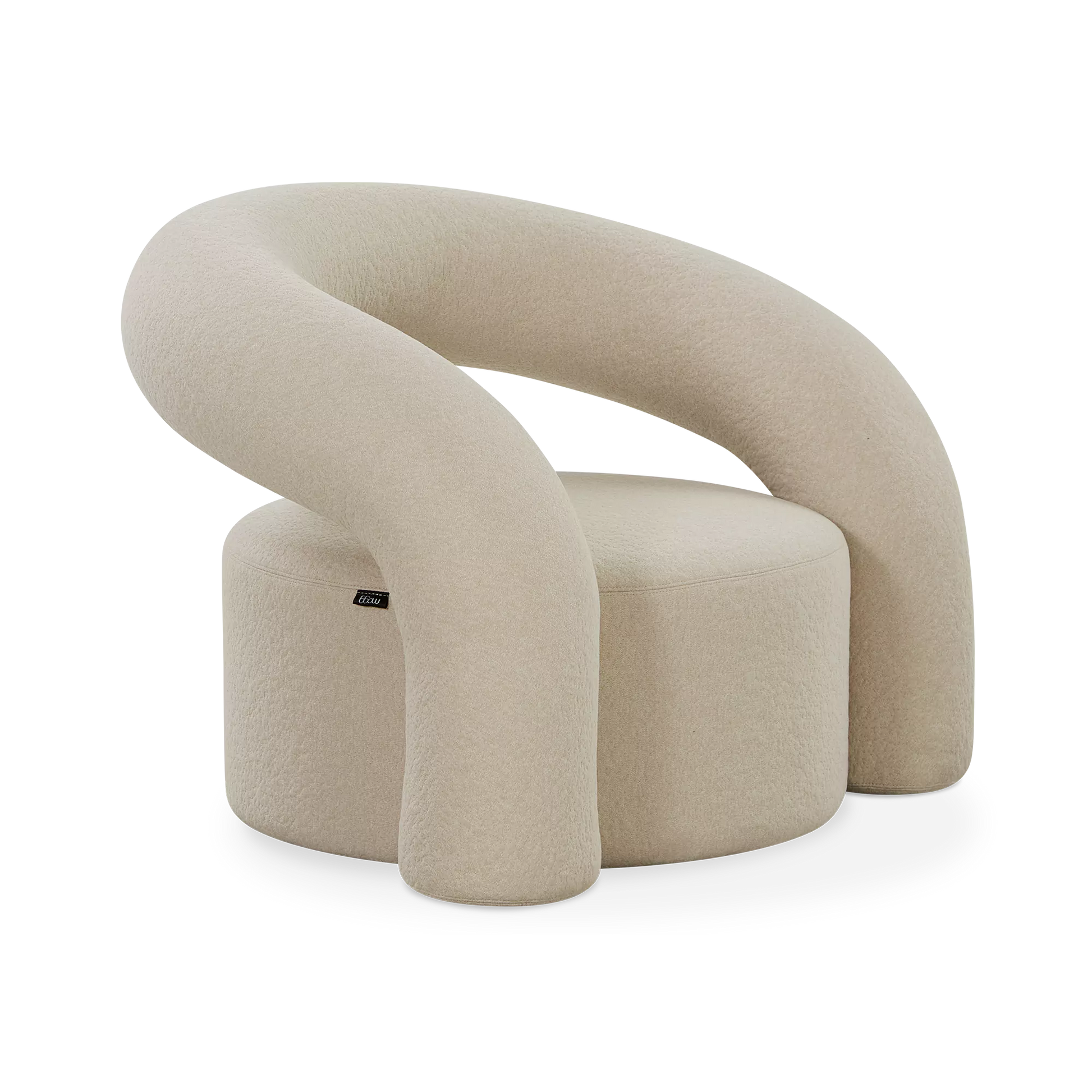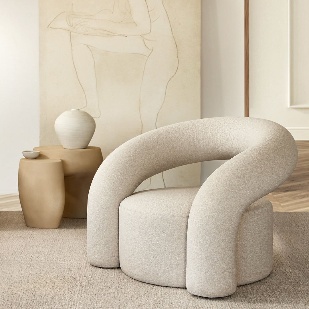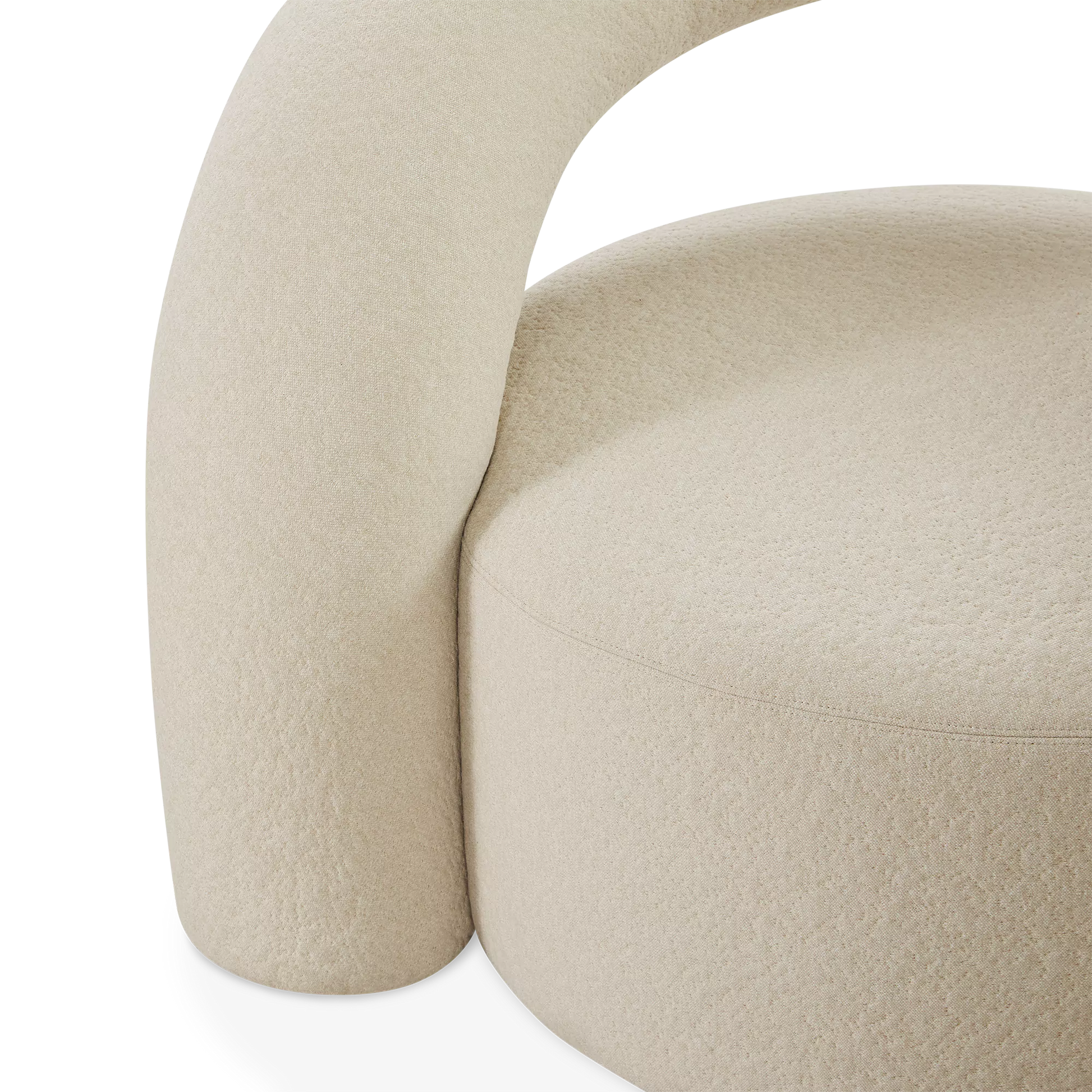 Featuring a curved plywood frame wrapped in textured ivory fabric, the Nora armchair blends comfort with quiet whimsy. Its rounded silhouette evokes a sense of ease for a sturdy yet welcoming effect that’s sure to turn heads. Generously padded and thoughtfully shaped, Nora brings warmth and charm to any space as it invites you to settle in and stay a while.