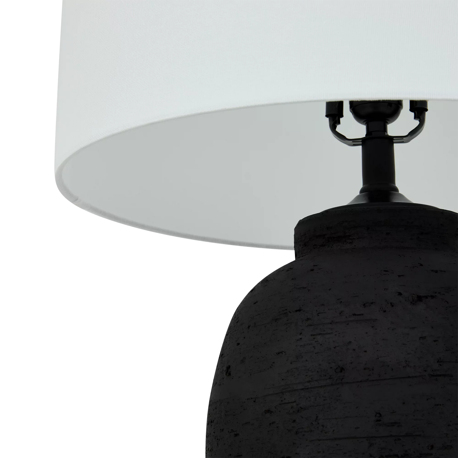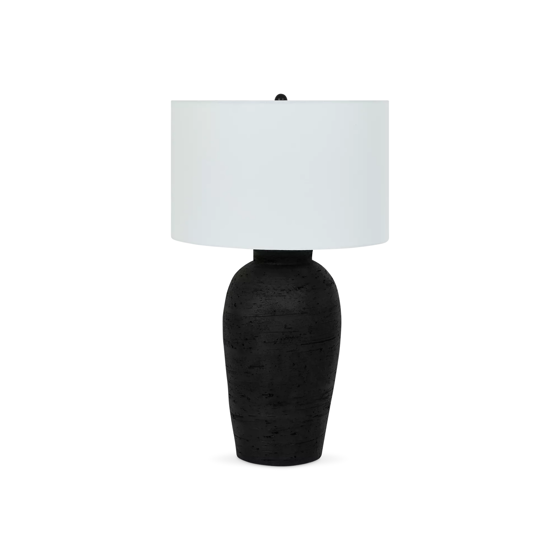 Orren II lamp, inspired by ancient potters, this black textured ceramic lamp adds an artistic and cultural touch to any decor. Its classic geometric shape and modern off-white shade bring warmth and structure to your home.