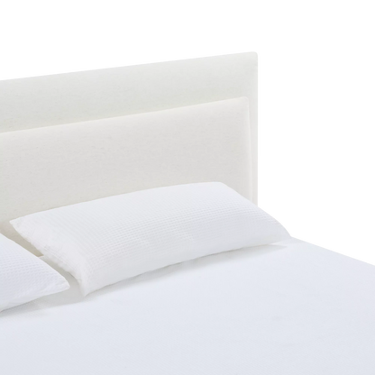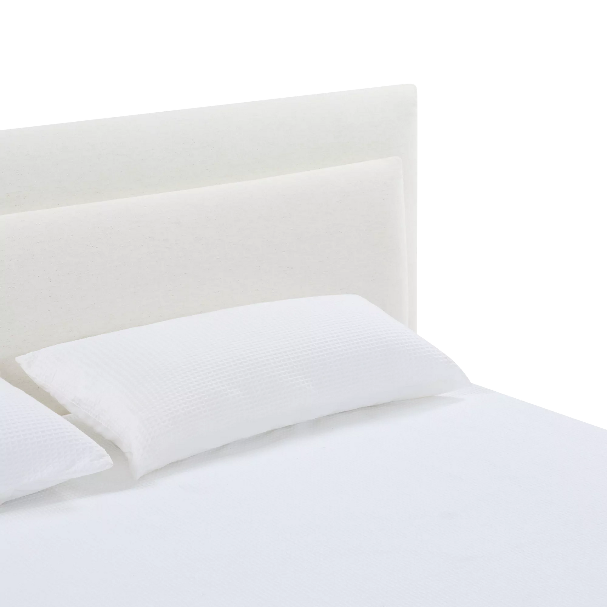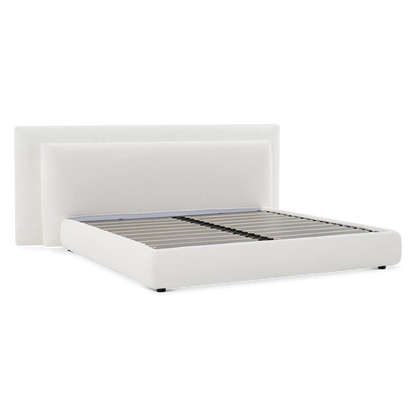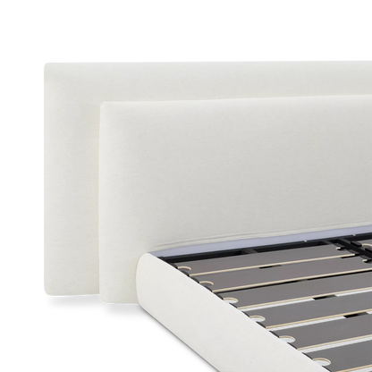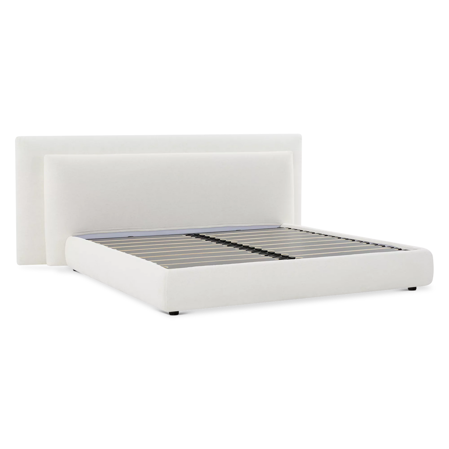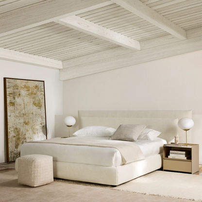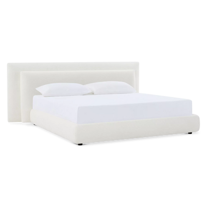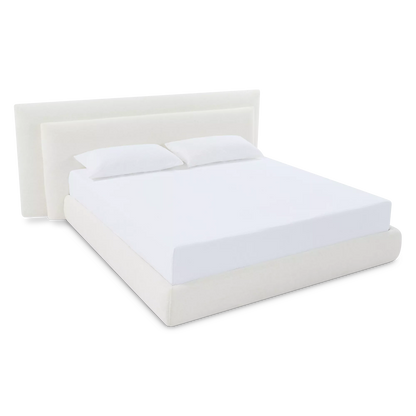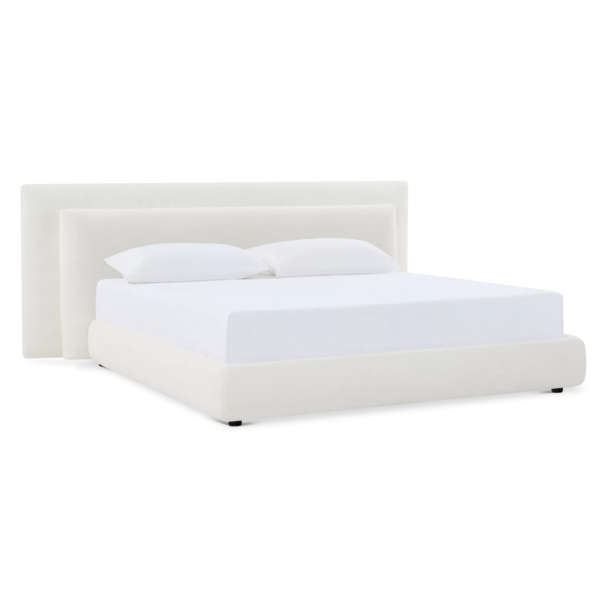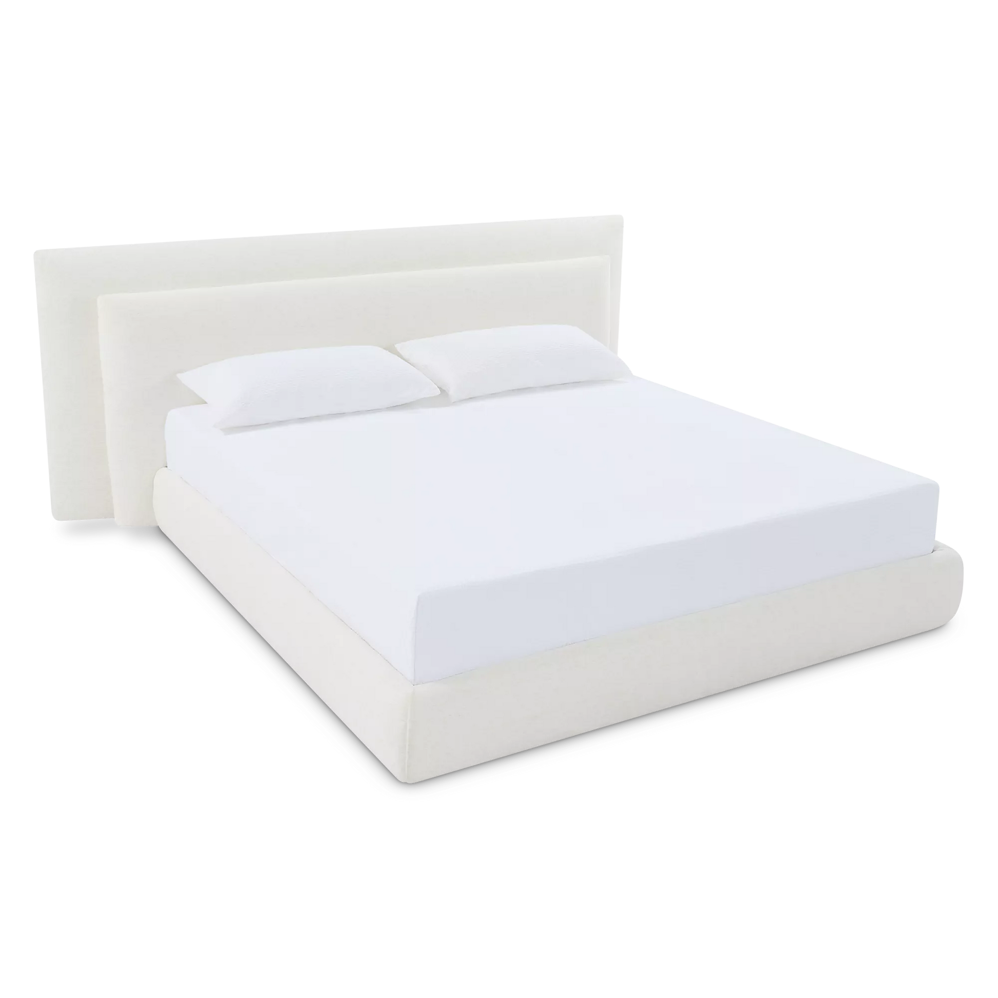 The Osomae bed offers pillow-like comfort to create a tranquil oasis you won’t want to leave. Tailored in softly textured fabric, it features a dual-layered headboard with an extended backdrop and a padded inner panel for subtle dimension and sink-in softness. An upholstered, low-profile base and discreet legs finish the look to anchor any bedroom in serene, luminous style.