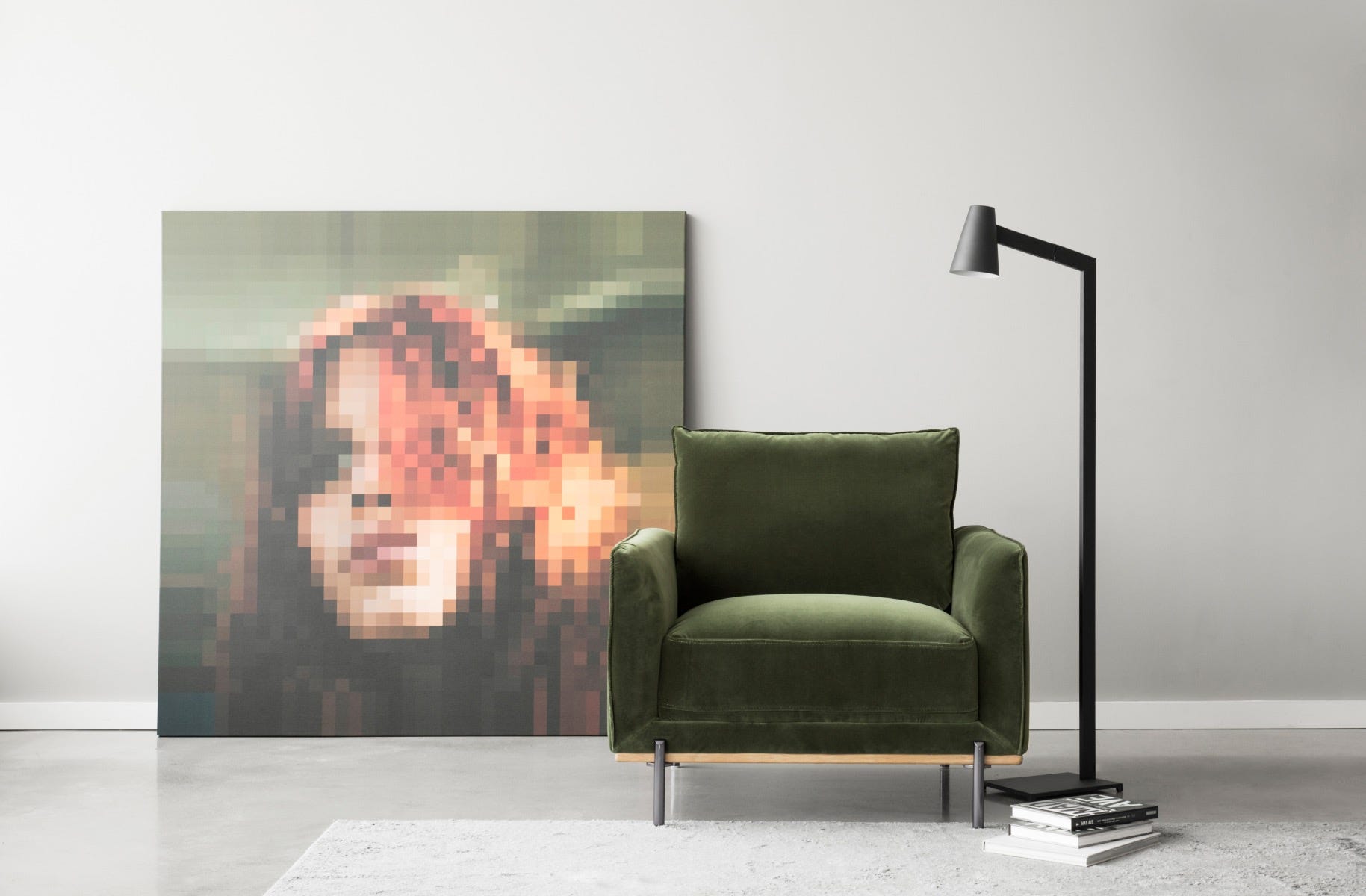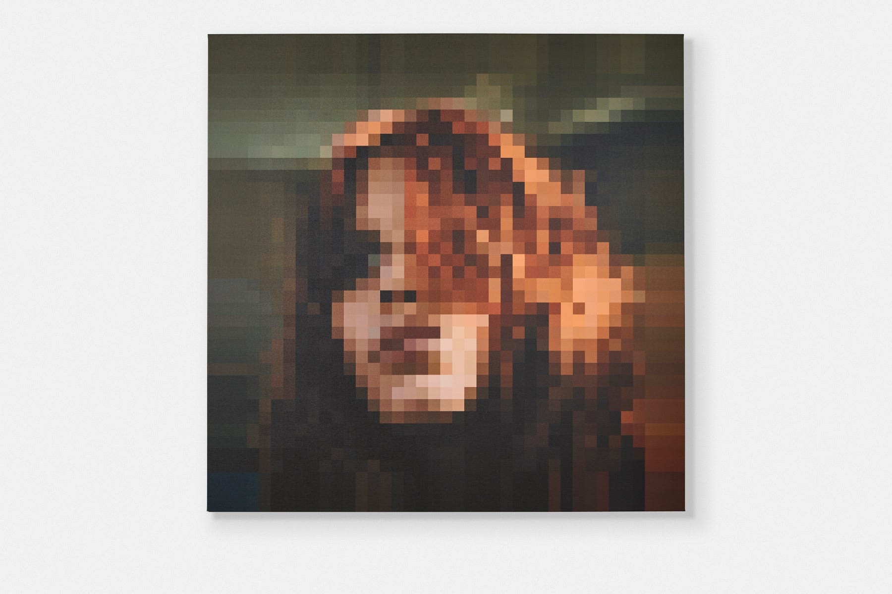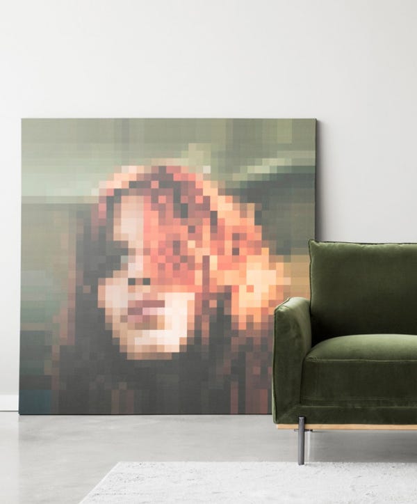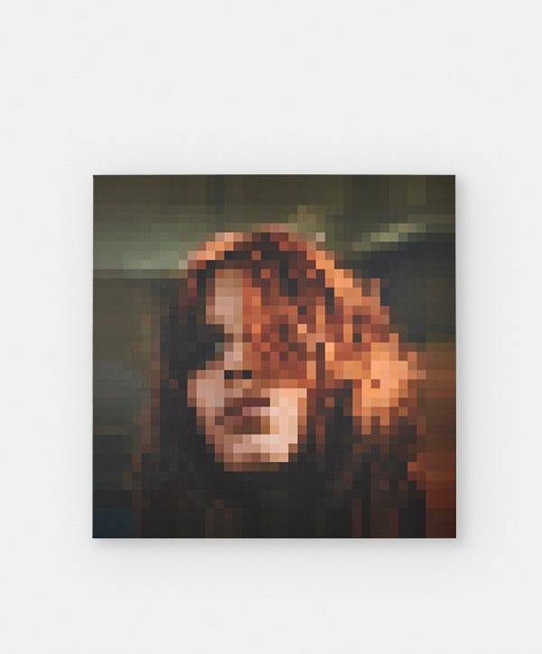 With its warm tones and oversized form, the Feu print painting presents a mosaic of cubes that take the shape of a female face. It looks equally perfect leaning against a loft wall as it does hanging on a gallery wall.