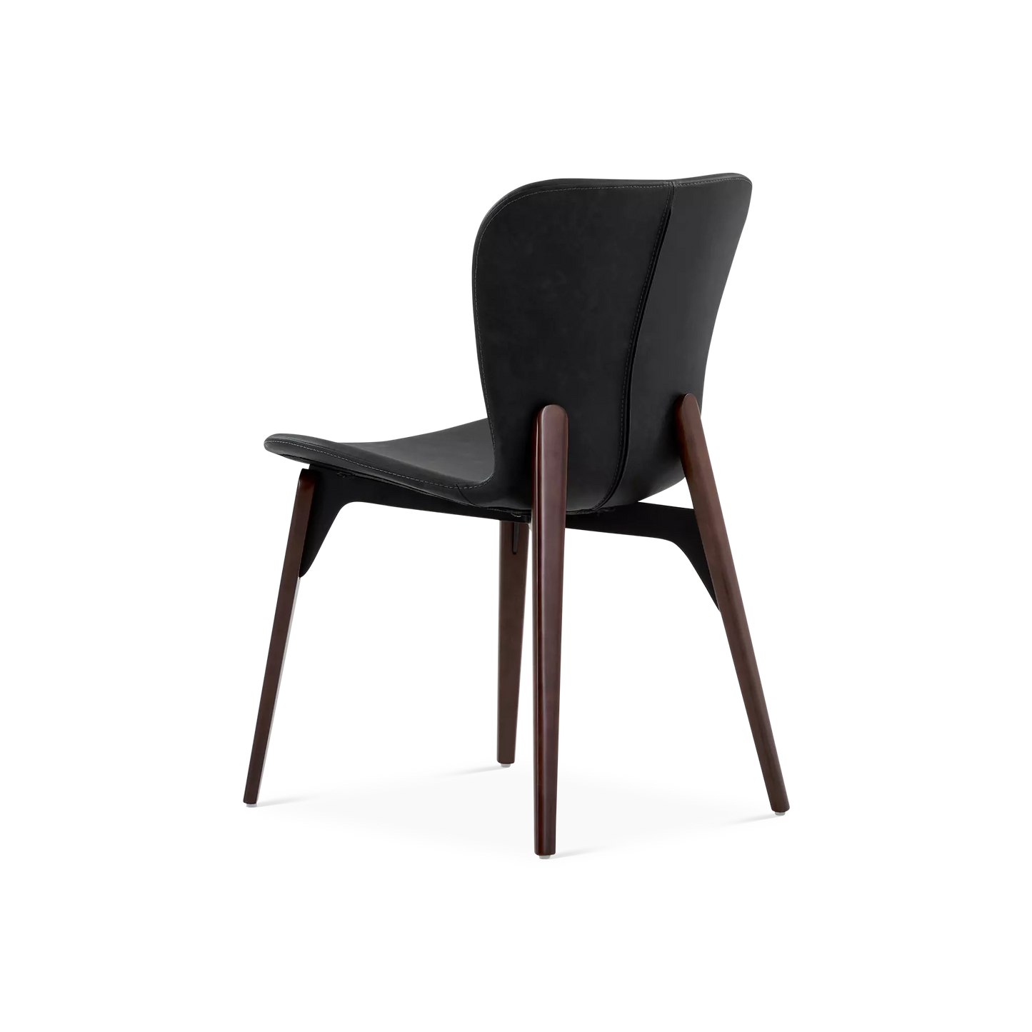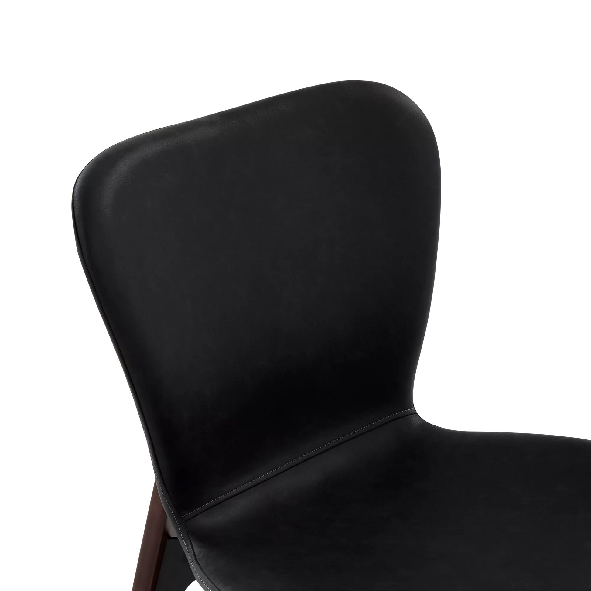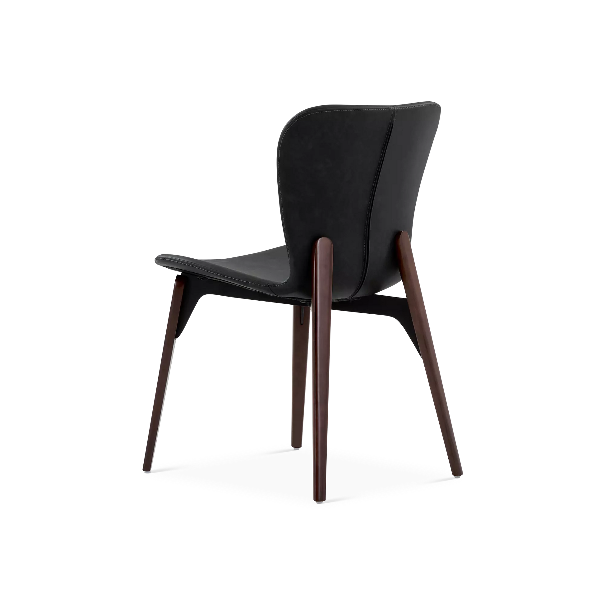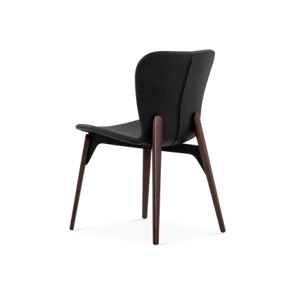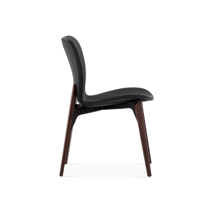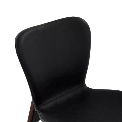 Designed by Ebbe Gehl, the Paragon chair pairs a slim, black faux-leather seat and a walnut wood base. A slight gap between the frame and seat creates a subtle floating effect, while the extended back posts add a distinctive, refined touch.