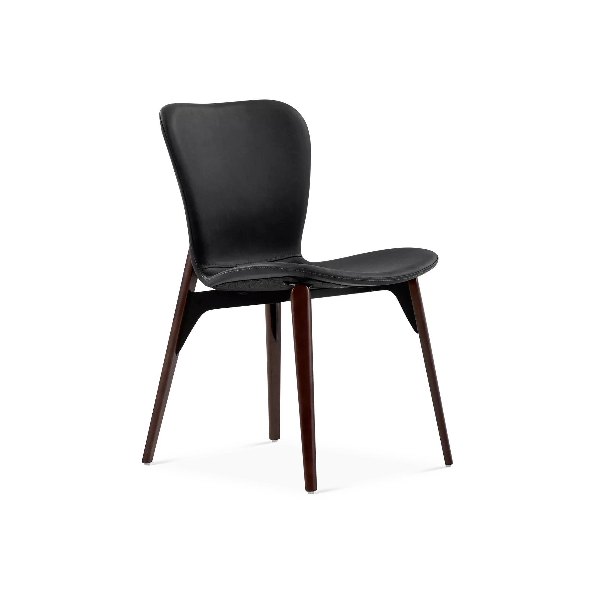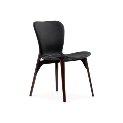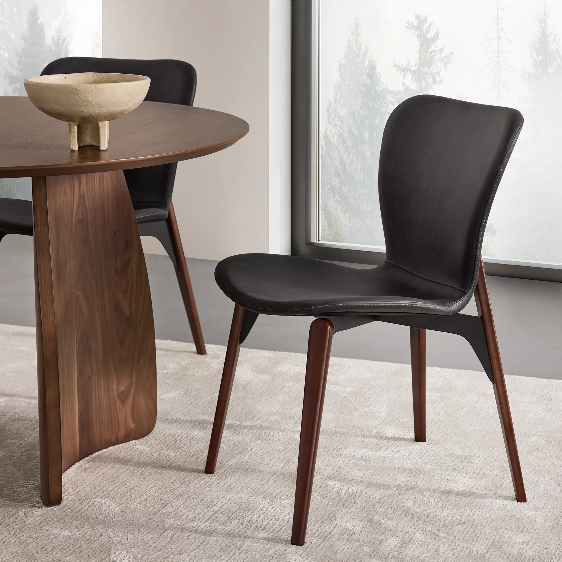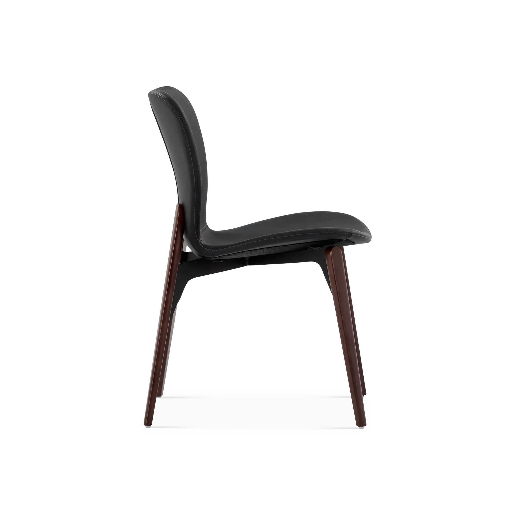 Designed by Ebbe Gehl, the Paragon chair pairs a slim, black faux-leather seat and a walnut wood base. A slight gap between the frame and seat creates a subtle floating effect, while the extended back posts add a distinctive, refined touch.