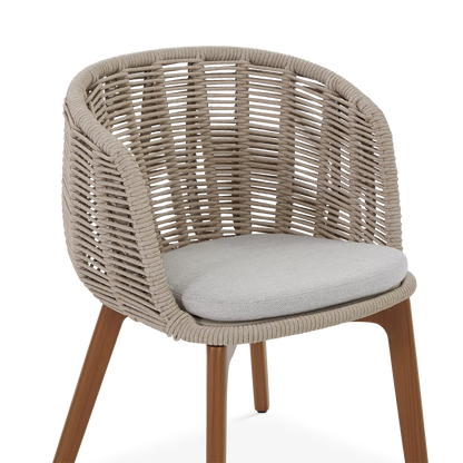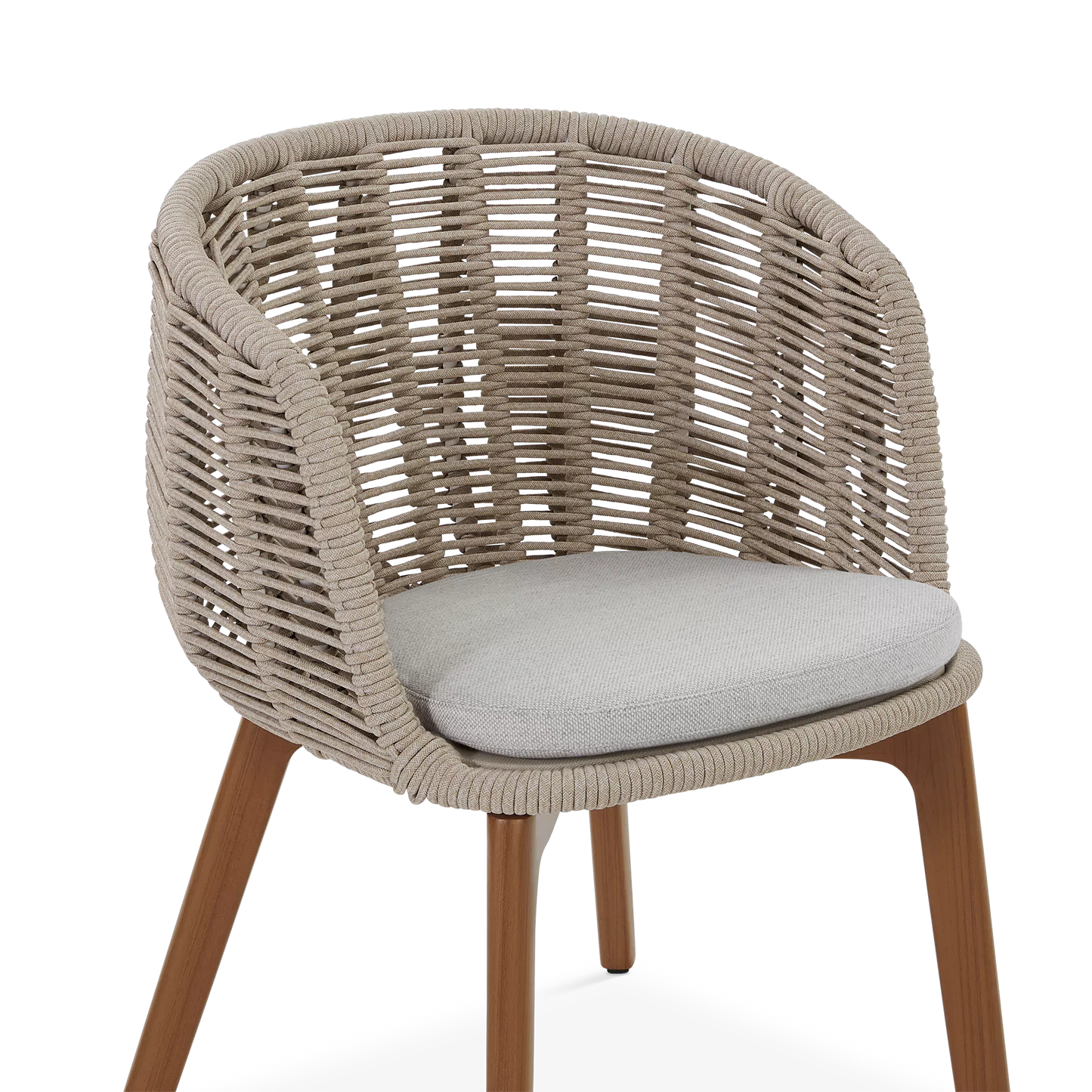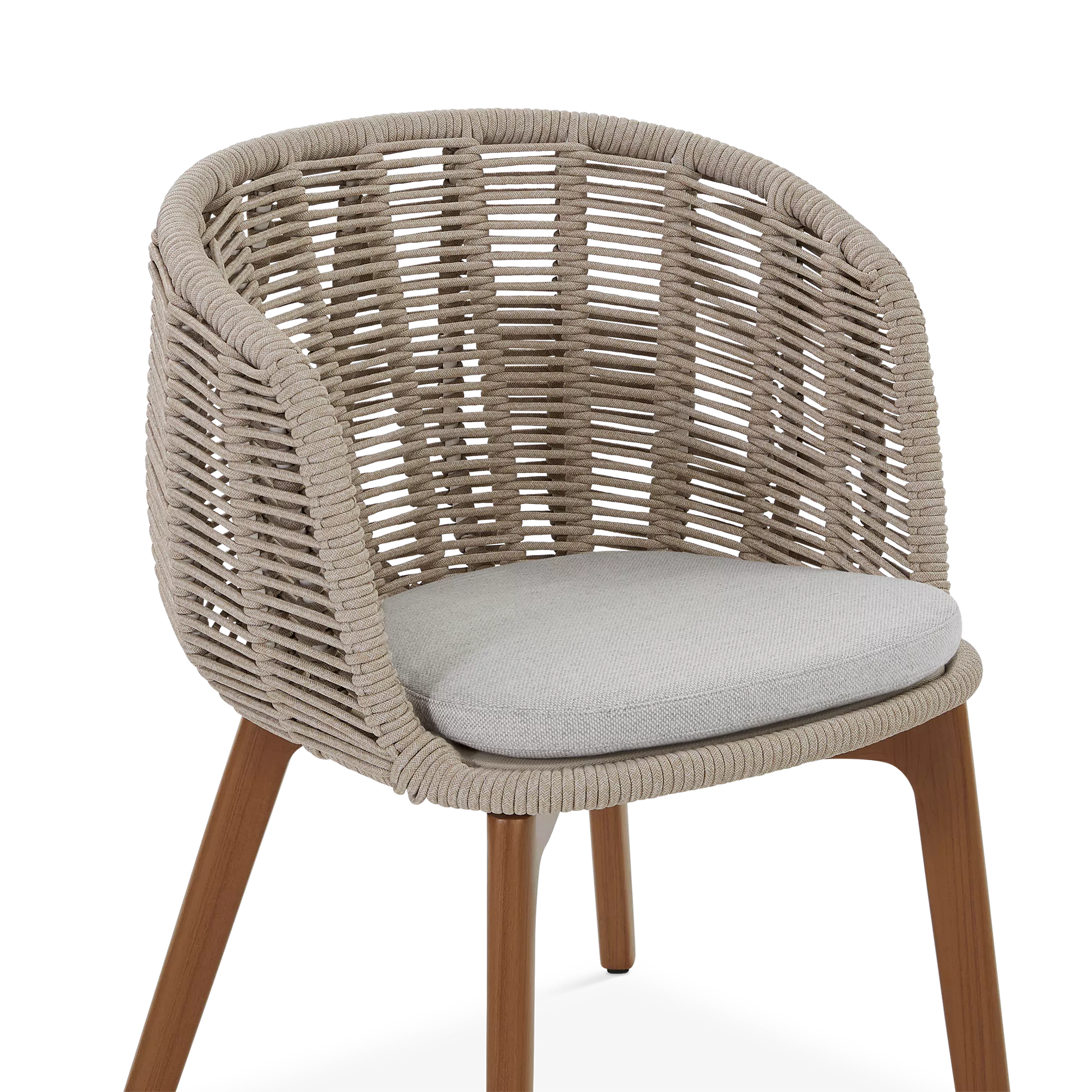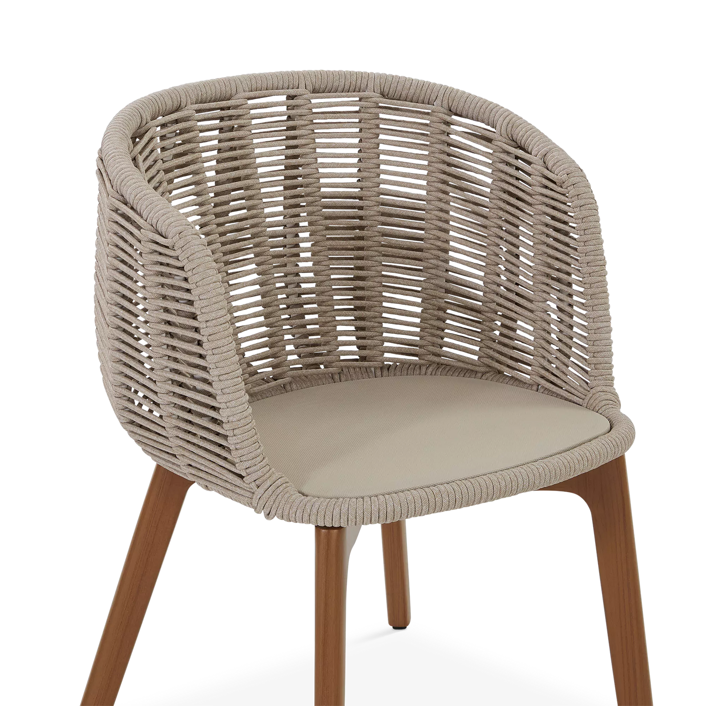 The Paris Brest collection exudes contemporary elegance and Scandinavian charm. With its hand-woven rope back and a seat topped with a soft cushion, this dining chair comfortably envelops its guests while complementing the organic curves of its surrounding natural environment. Available in two finishes: charcoal aluminium with black rope, and teak-effect aluminium with beige rope.