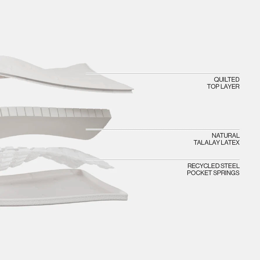 Designed for all types of sleepers, Peace relieves tension and provides optimal support with a recycled steel, pocket spring base that offers dynamic support and adjusts to pressure areas to ensure a peaceful and restorative night’s rest.
