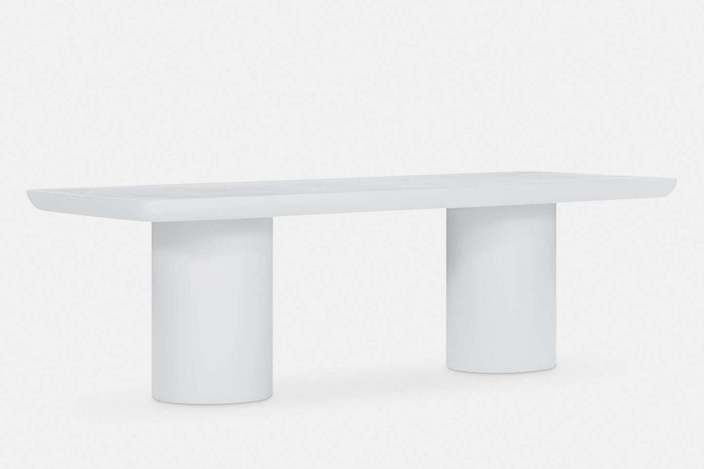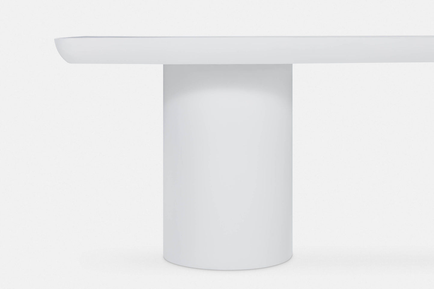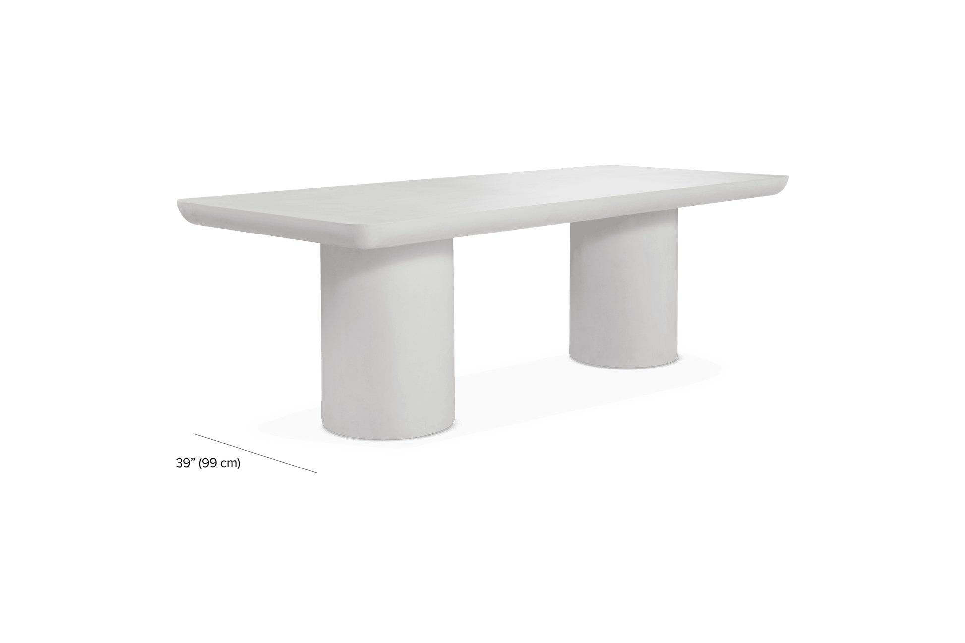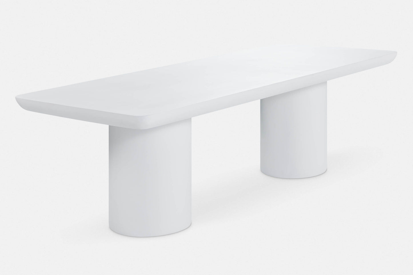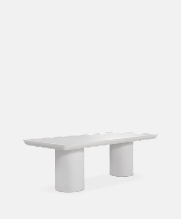 Although it appears modern and airy with its concrete-effect fiberglass finish and sleeks curves, the Pillar dining table hides a sturdy construction featuring two massive cylindrical legs. Accommodates up to 10 people.