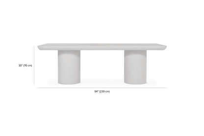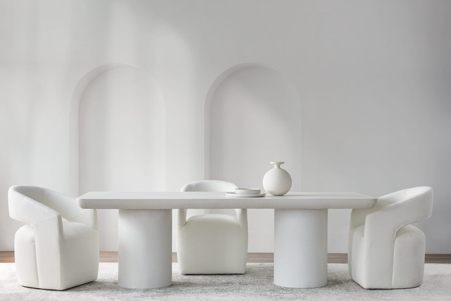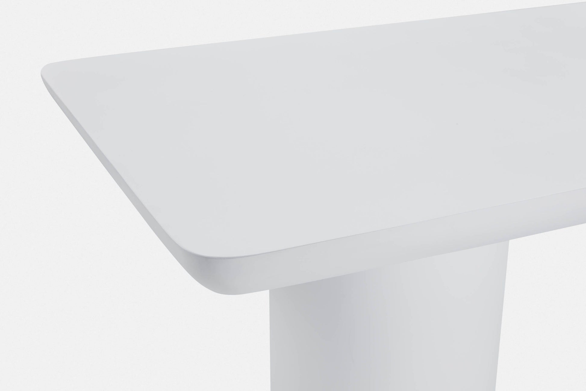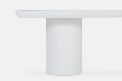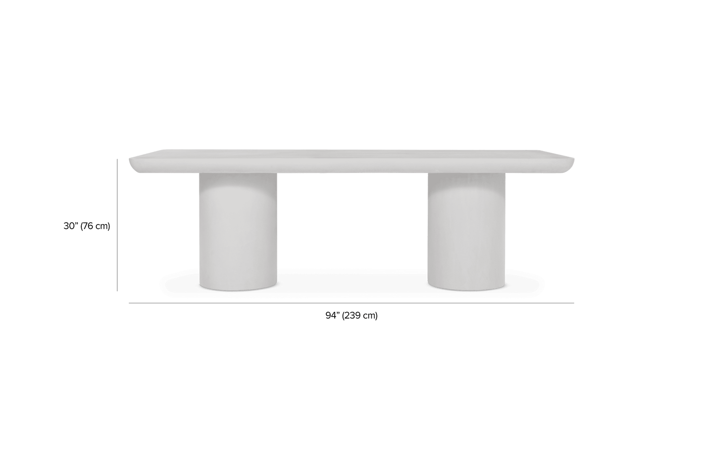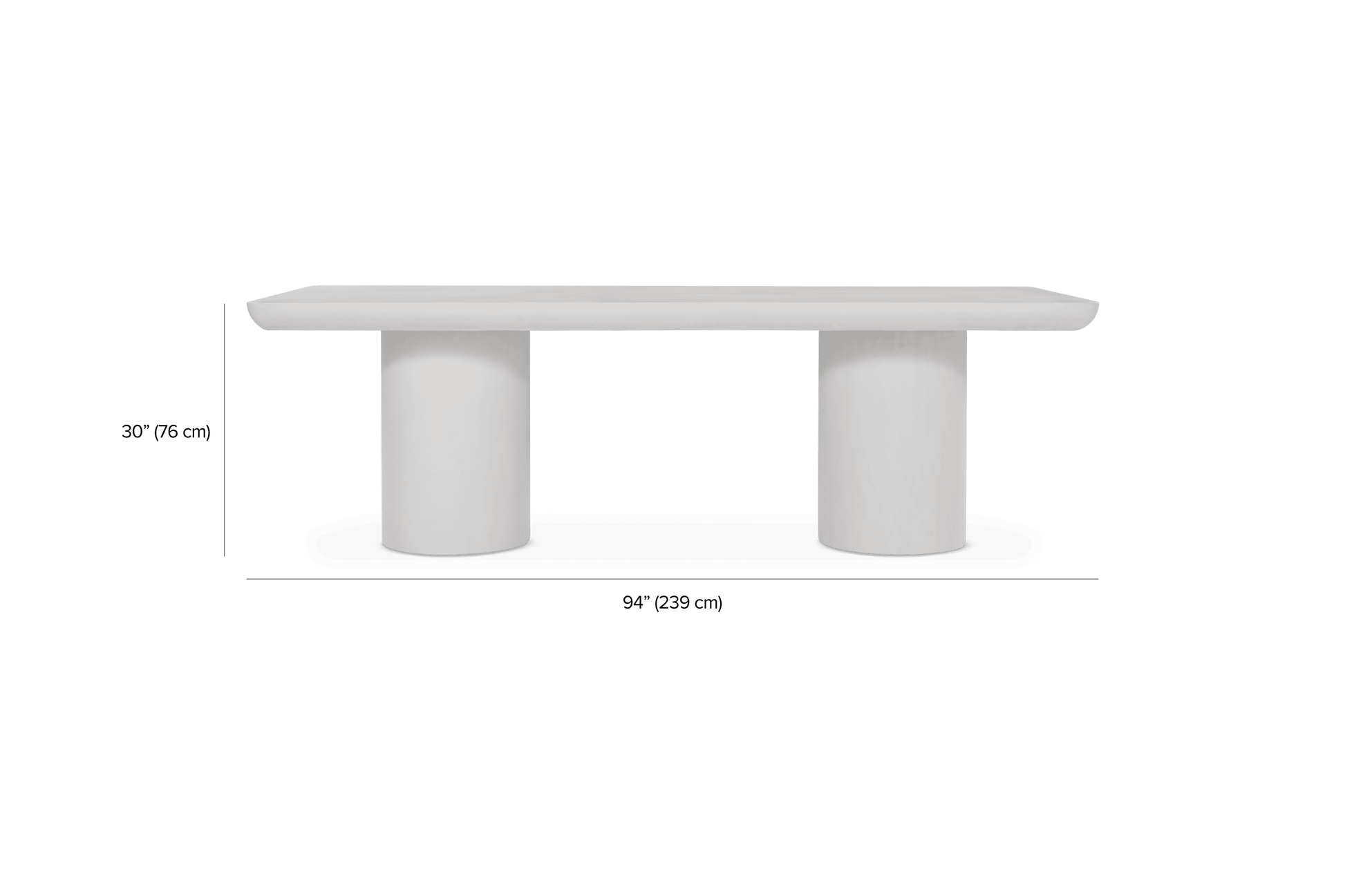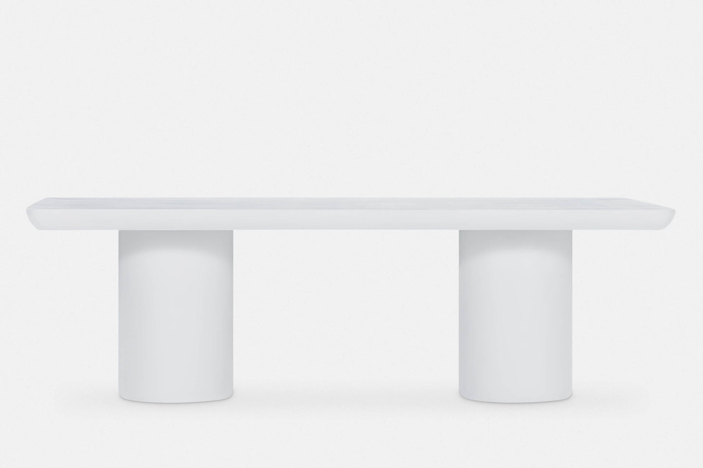 Although it appears modern and airy with its concrete-effect fiberglass finish and sleeks curves, the Pillar dining table hides a sturdy construction featuring two massive cylindrical legs. Accommodates up to 10 people.