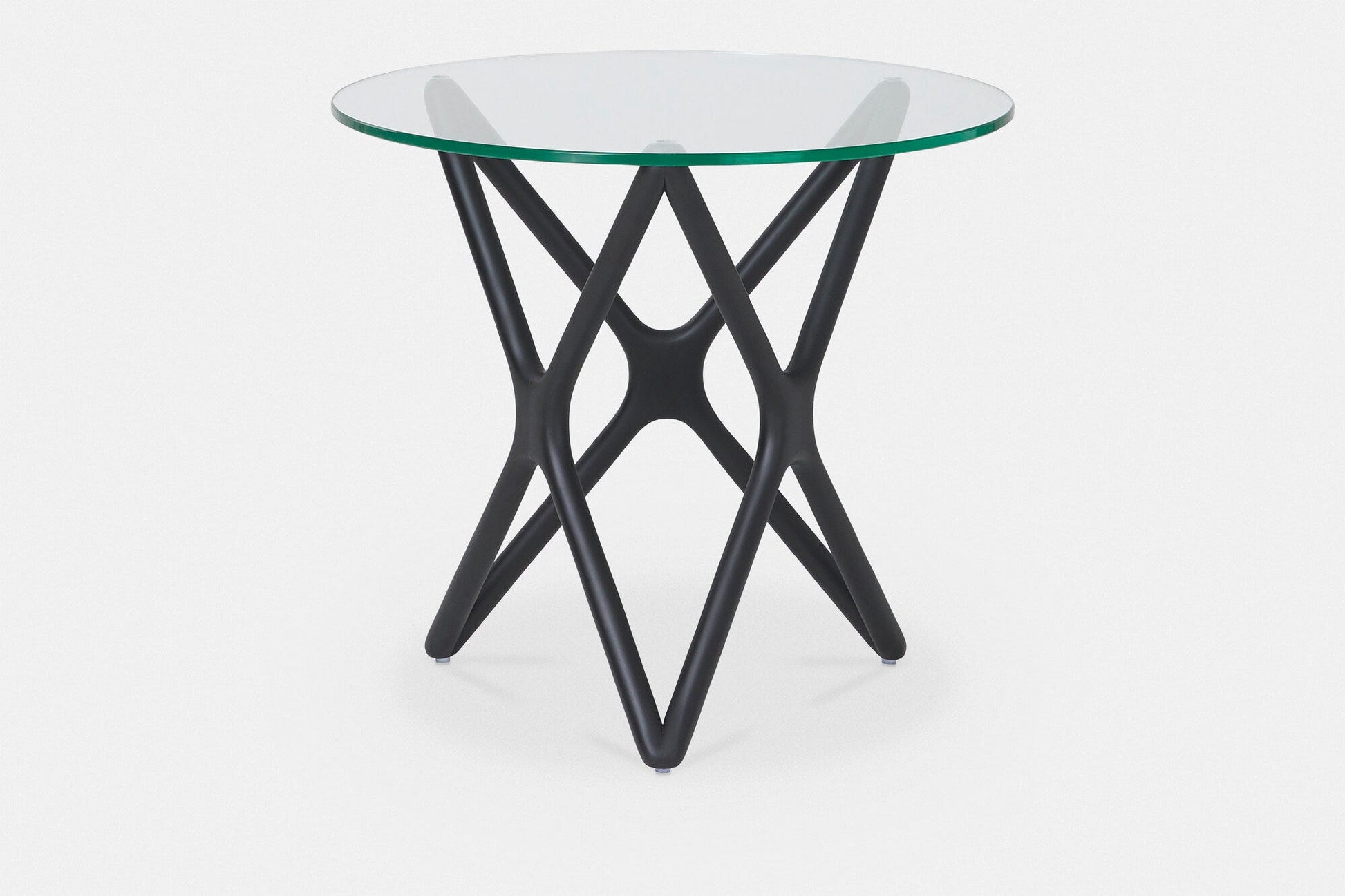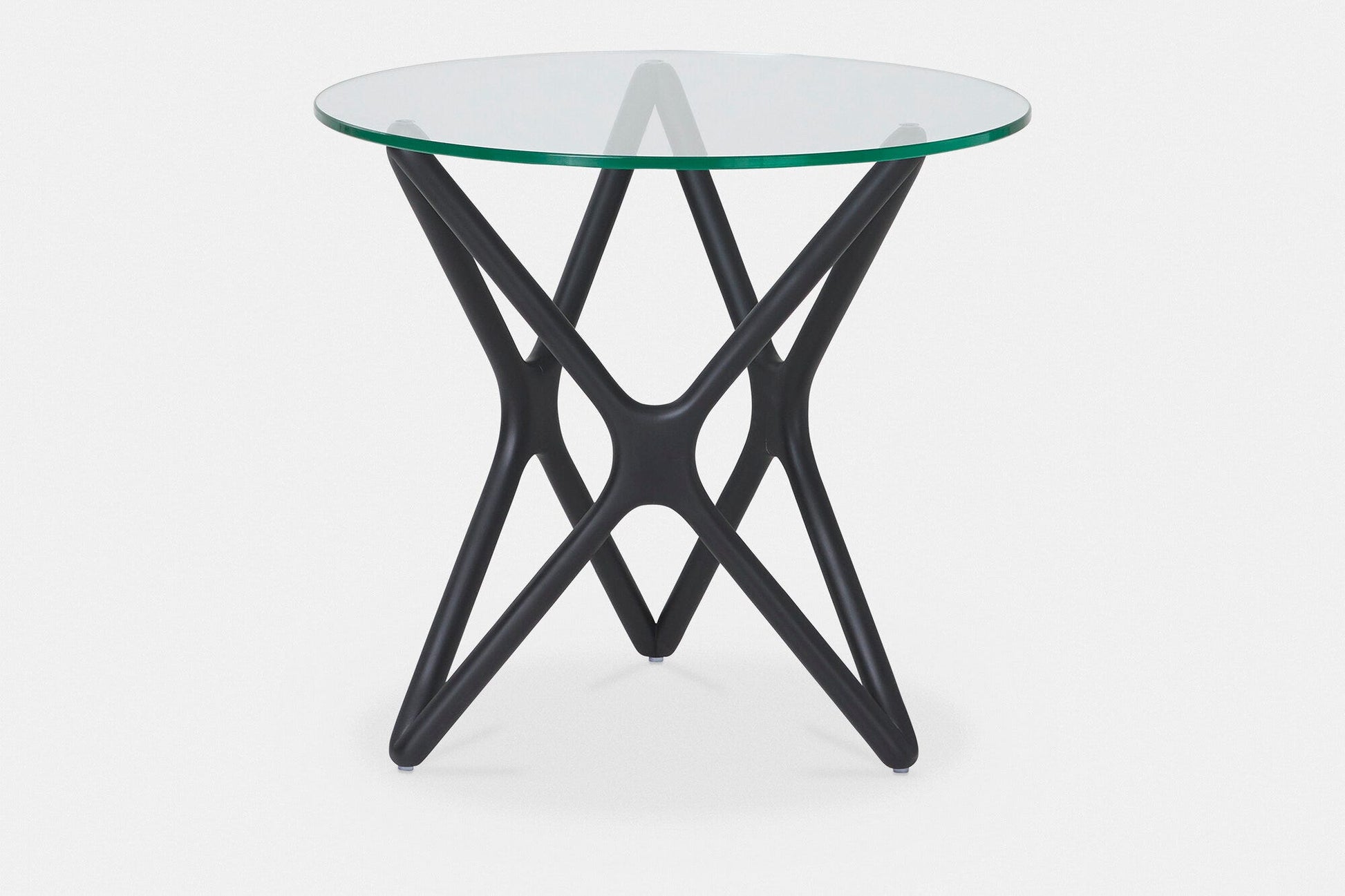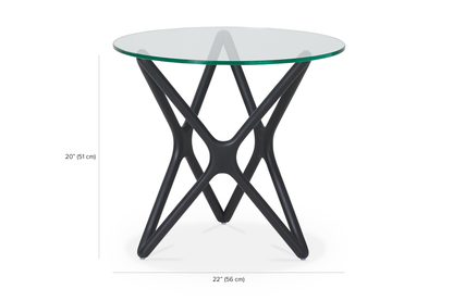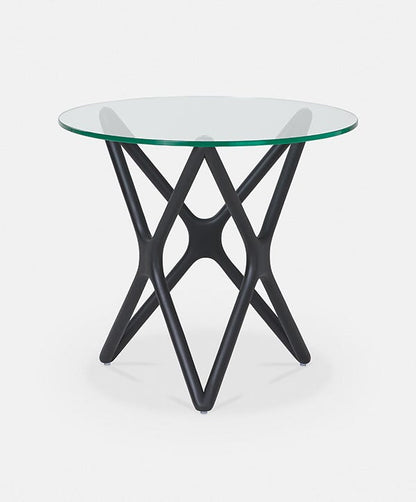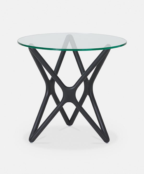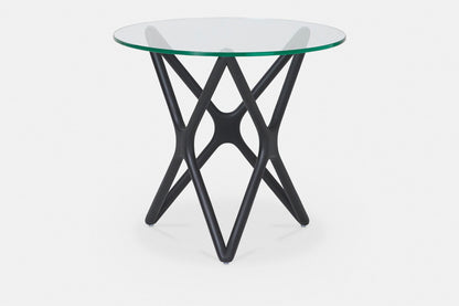 The Quasar side table comprises three wood Xs that unite to form an eloquent base. Its understated style is complemented by a solid glass top that harmonizes the entire piece.