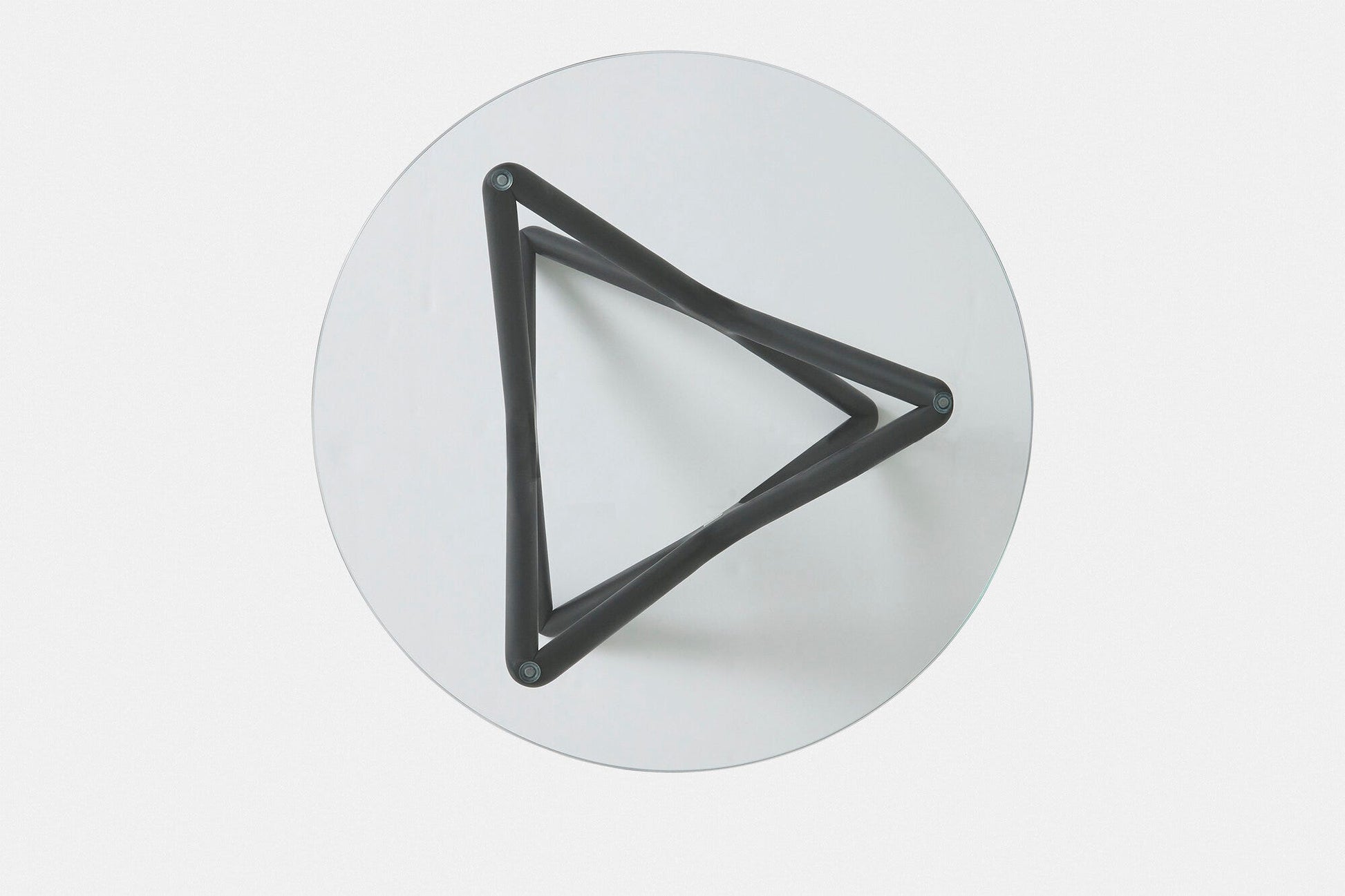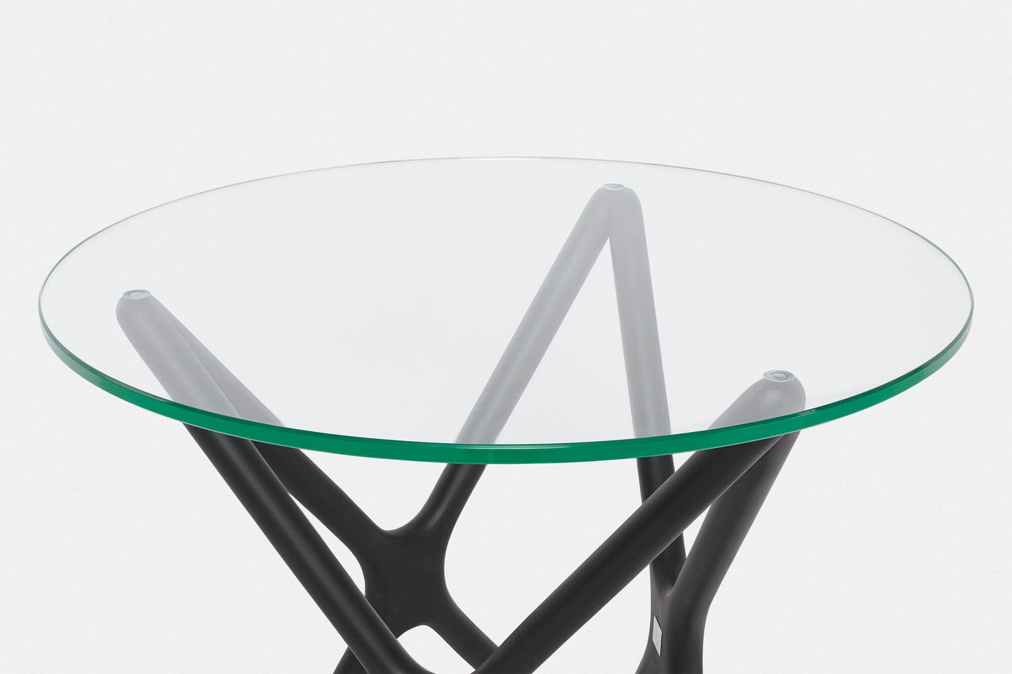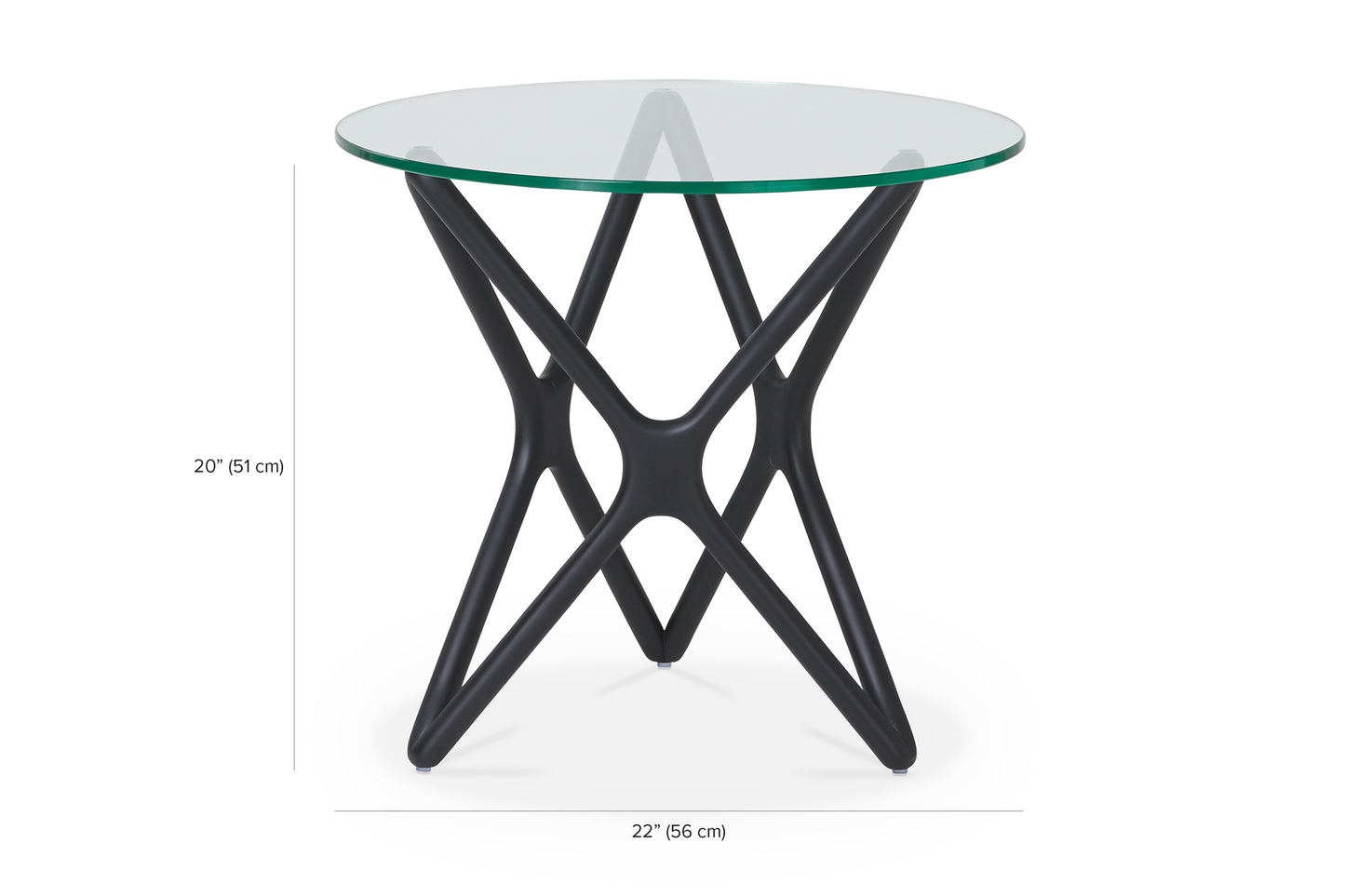 The Quasar side table comprises three wood Xs that unite to form an eloquent base. Its understated style is complemented by a solid glass top that harmonizes the entire piece.