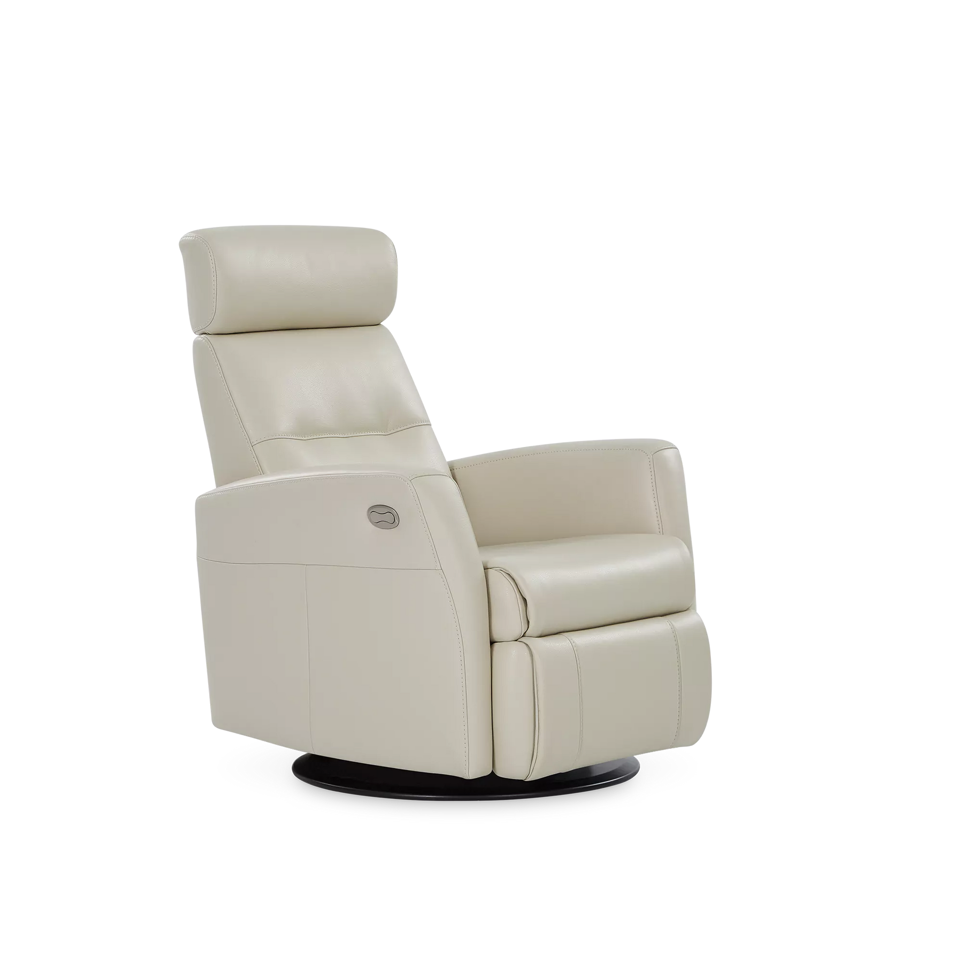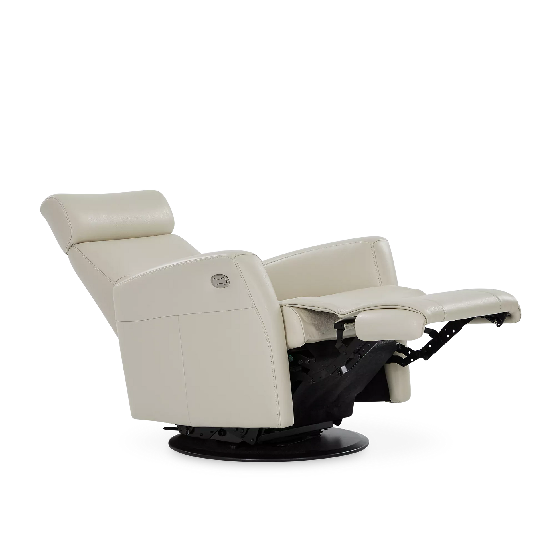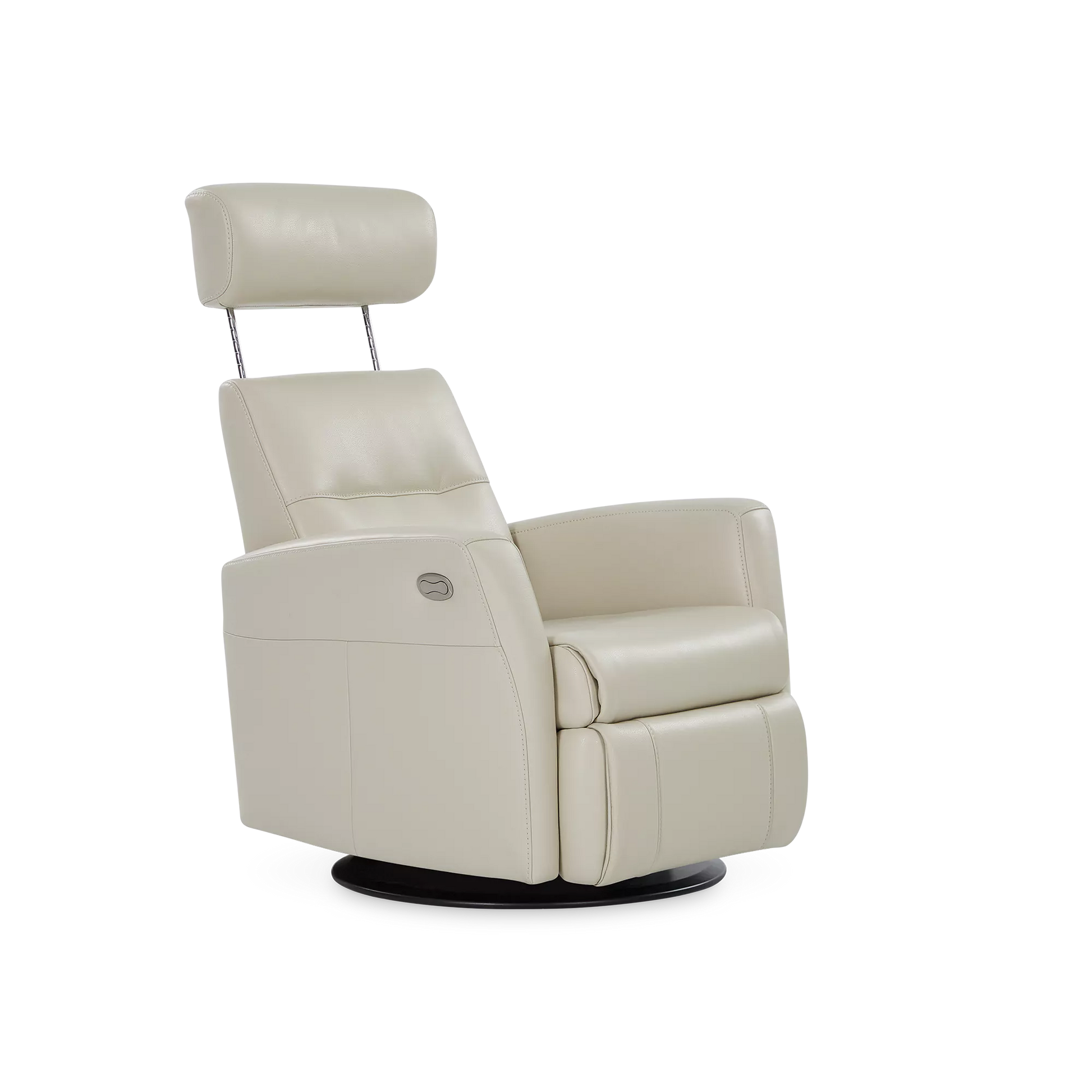 Regent II Oval is a power recliner in leather that swivels and reclines at the touch of a button. It provides unparalleled comfort in any support position thanks to its adjustable headrest and integrated footrest.