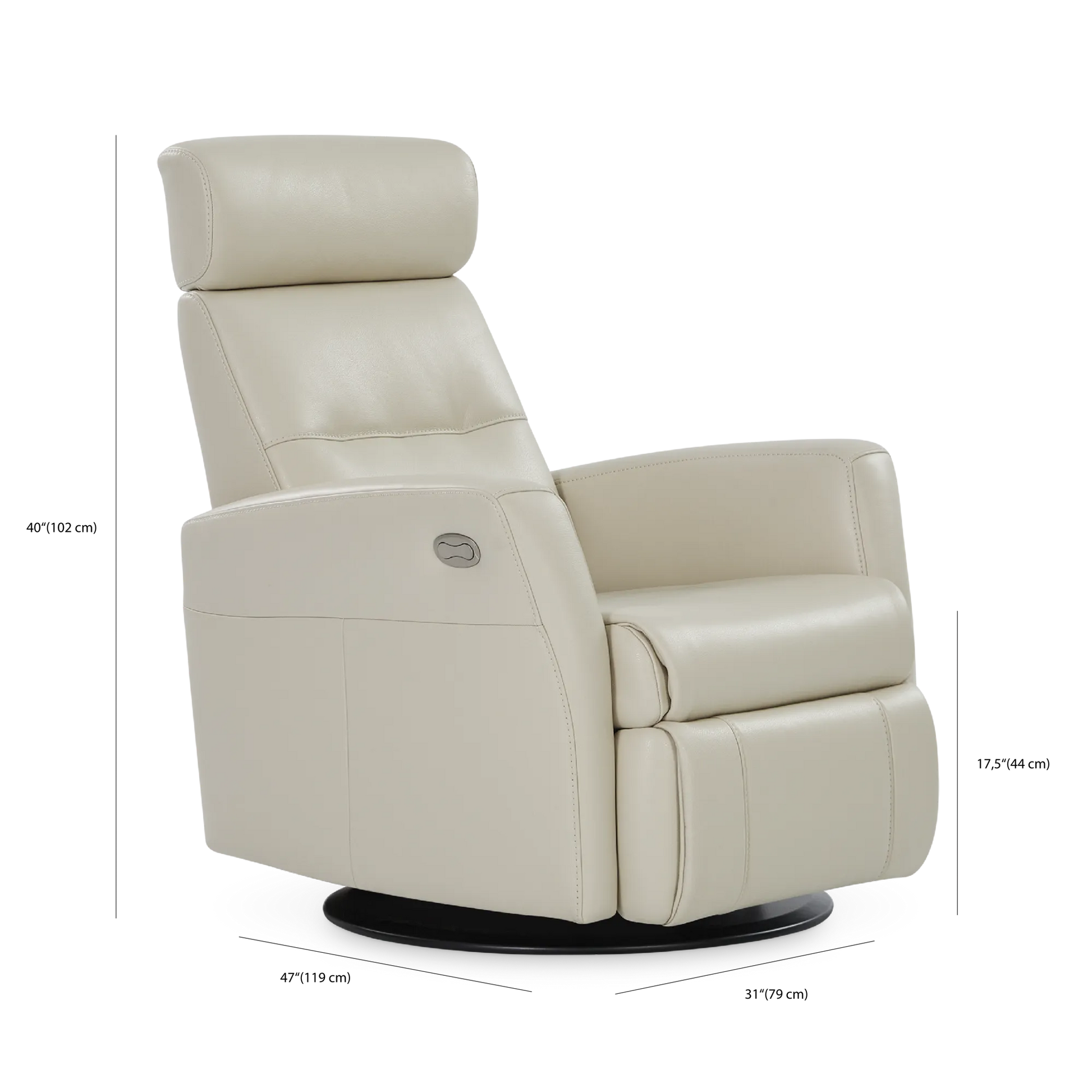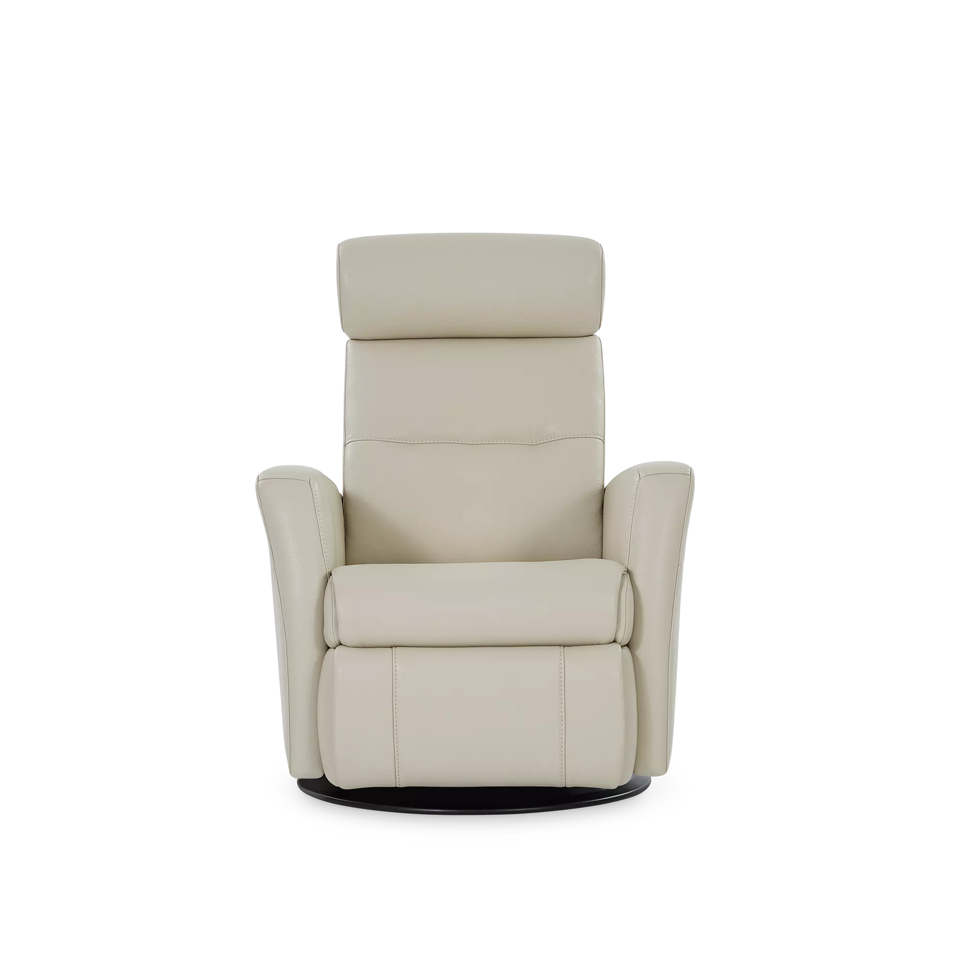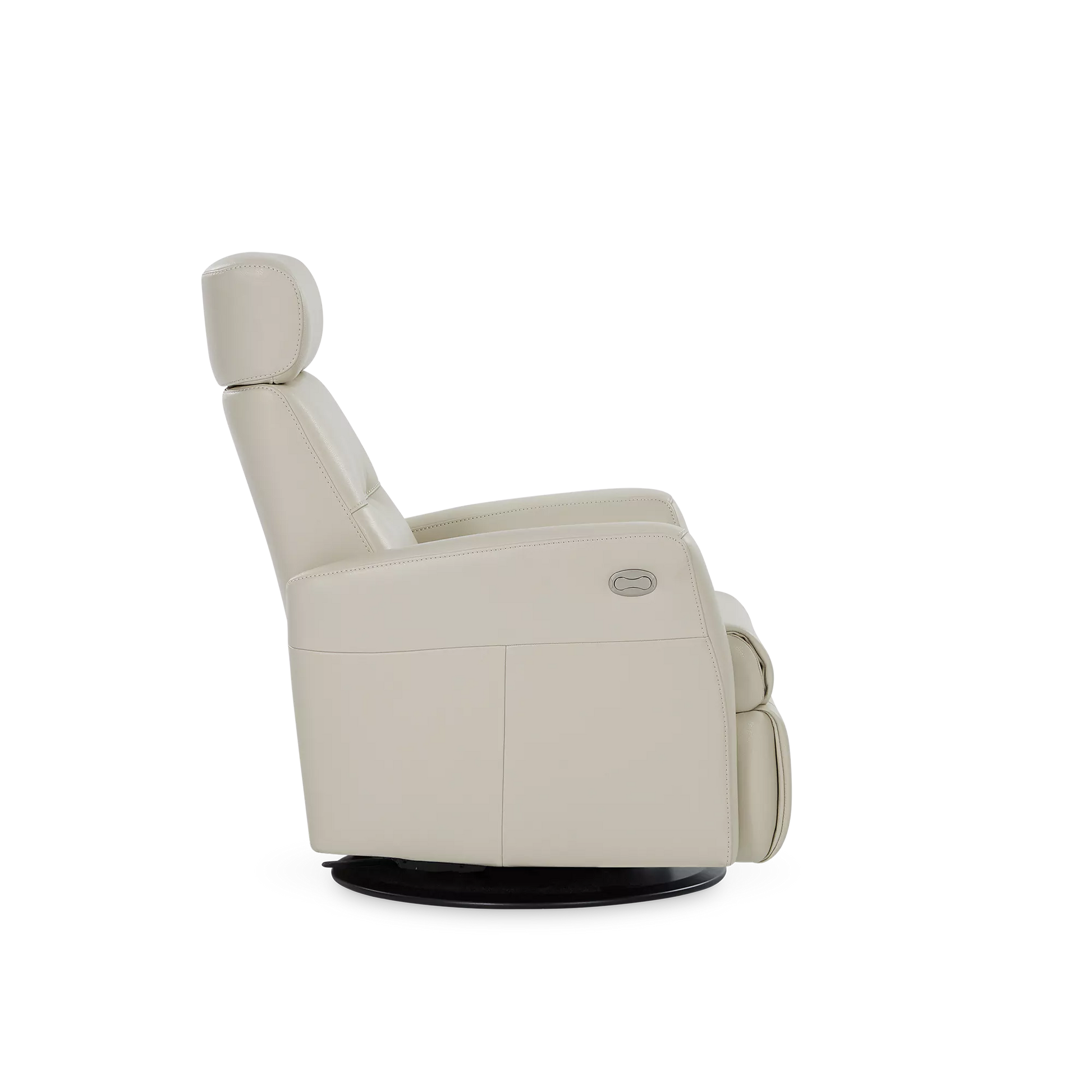 Regent II Oval is a power recliner in leather that swivels and reclines at the touch of a button. It provides unparalleled comfort in any support position thanks to its adjustable headrest and integrated footrest.