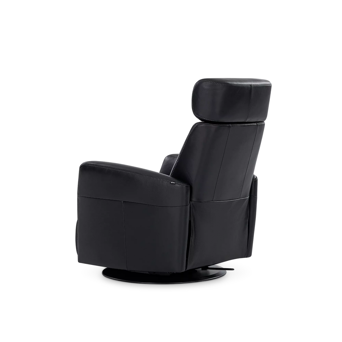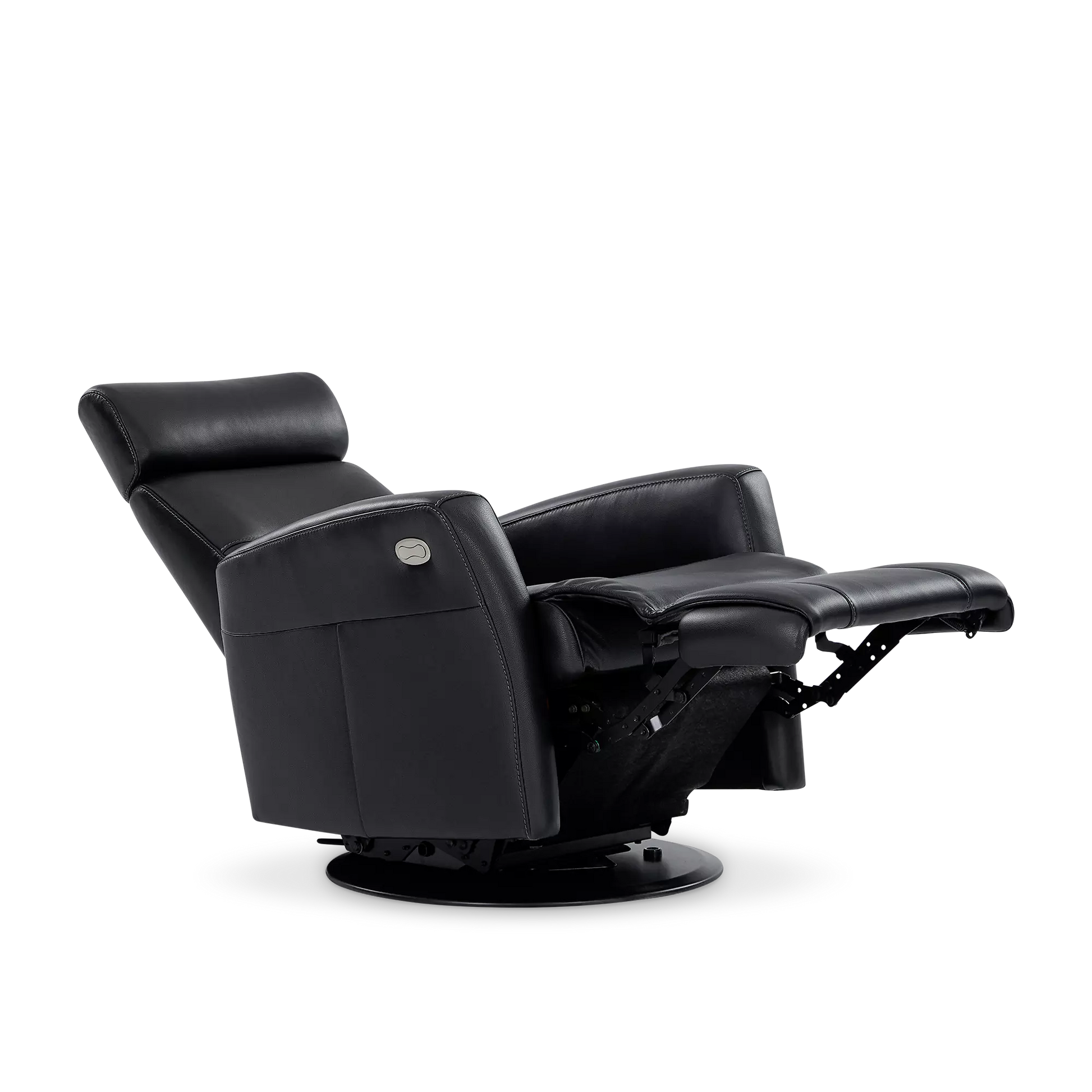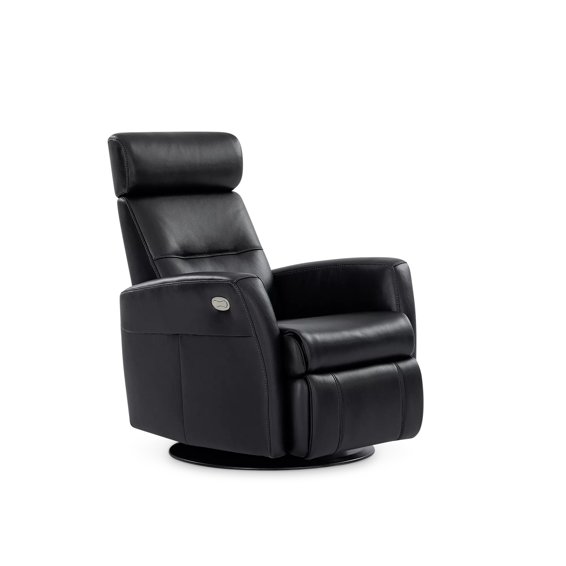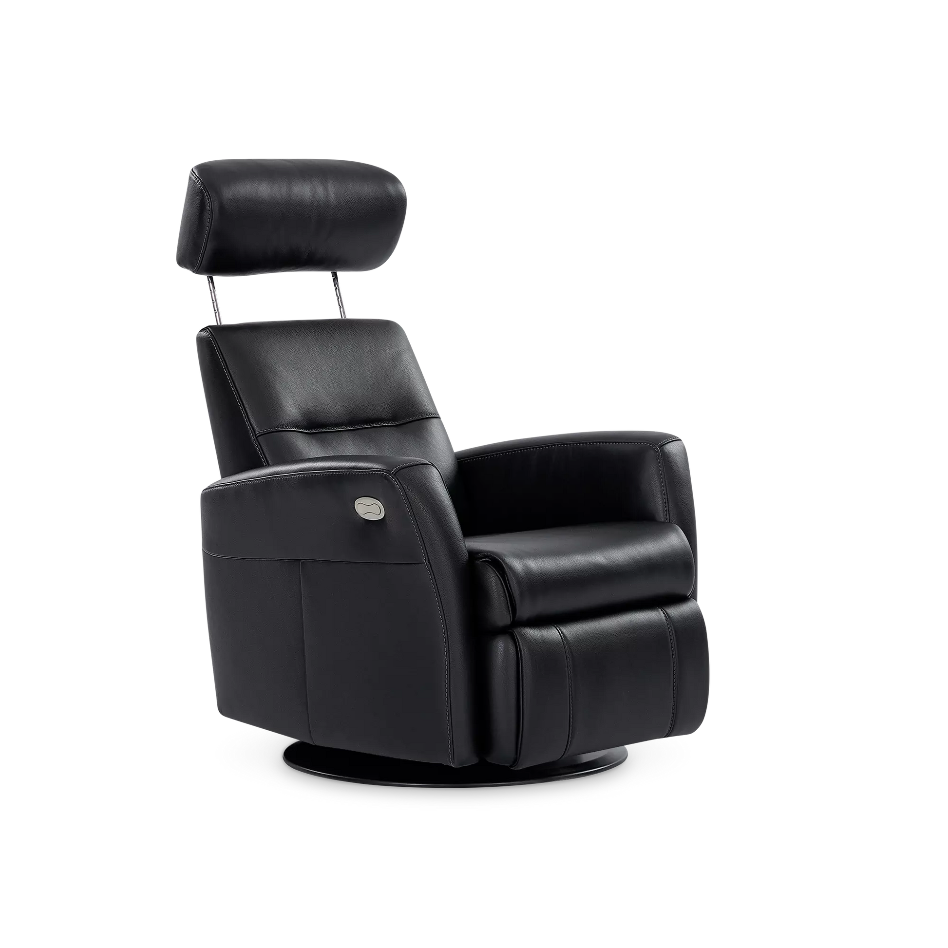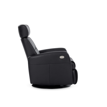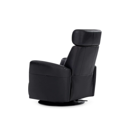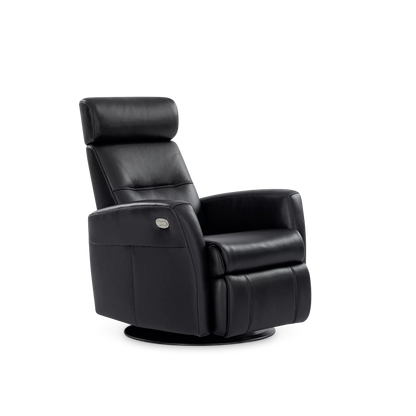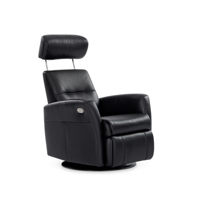 Regent II Oval is a power recliner in leather that swivels and reclines at the touch of a button. It provides unparalleled comfort in any support position thanks to its adjustable headrest and integrated footrest.