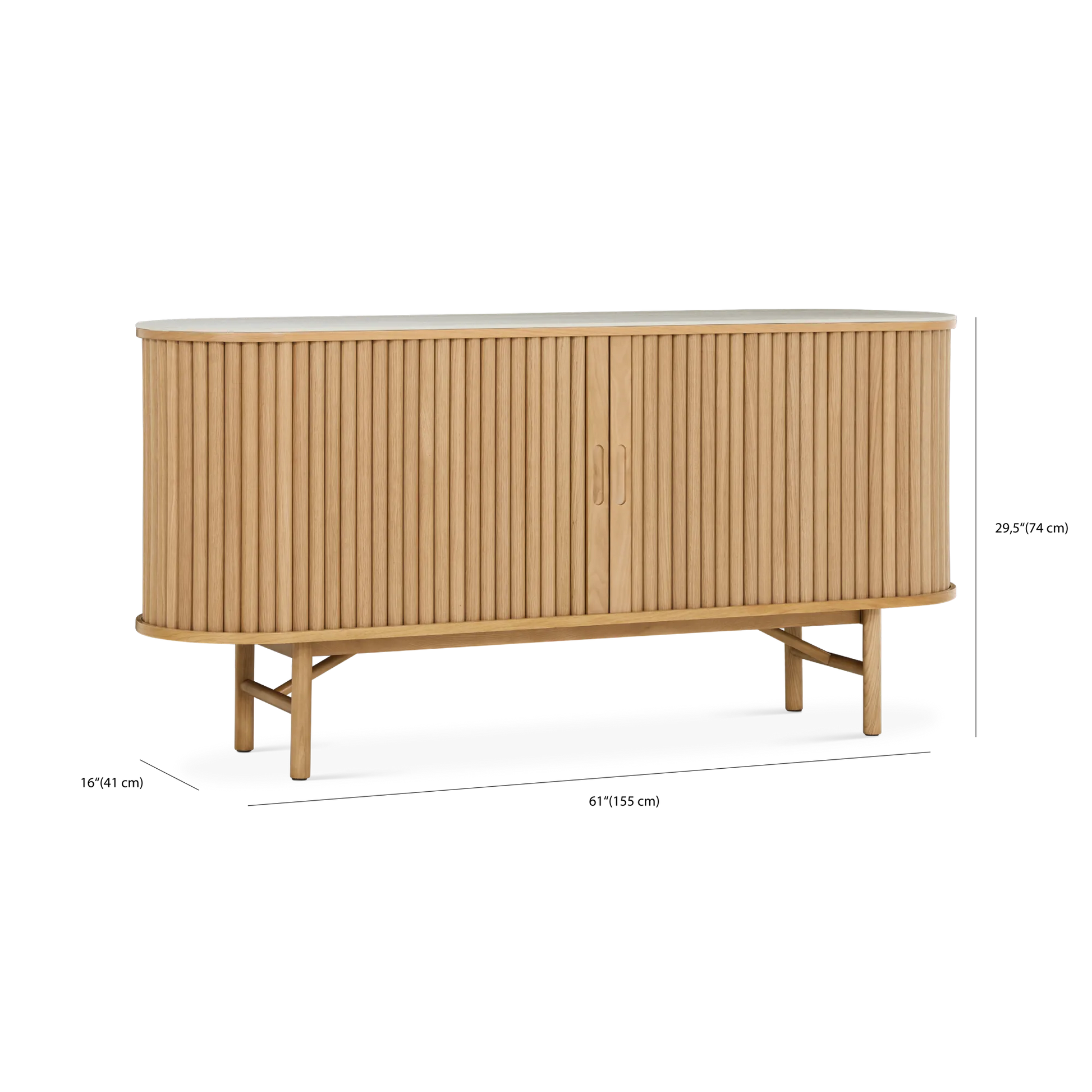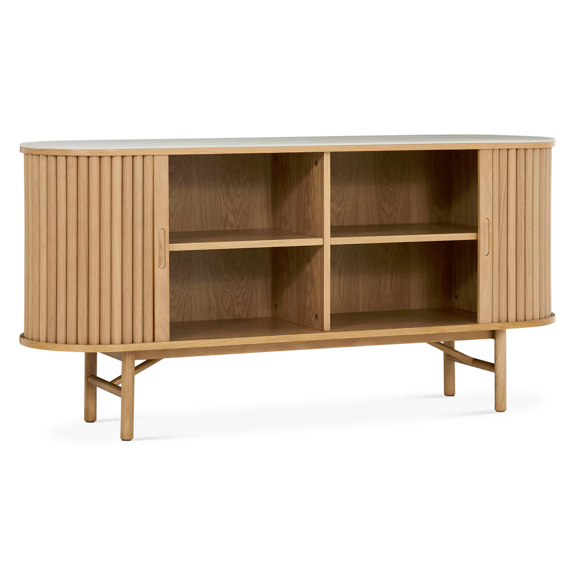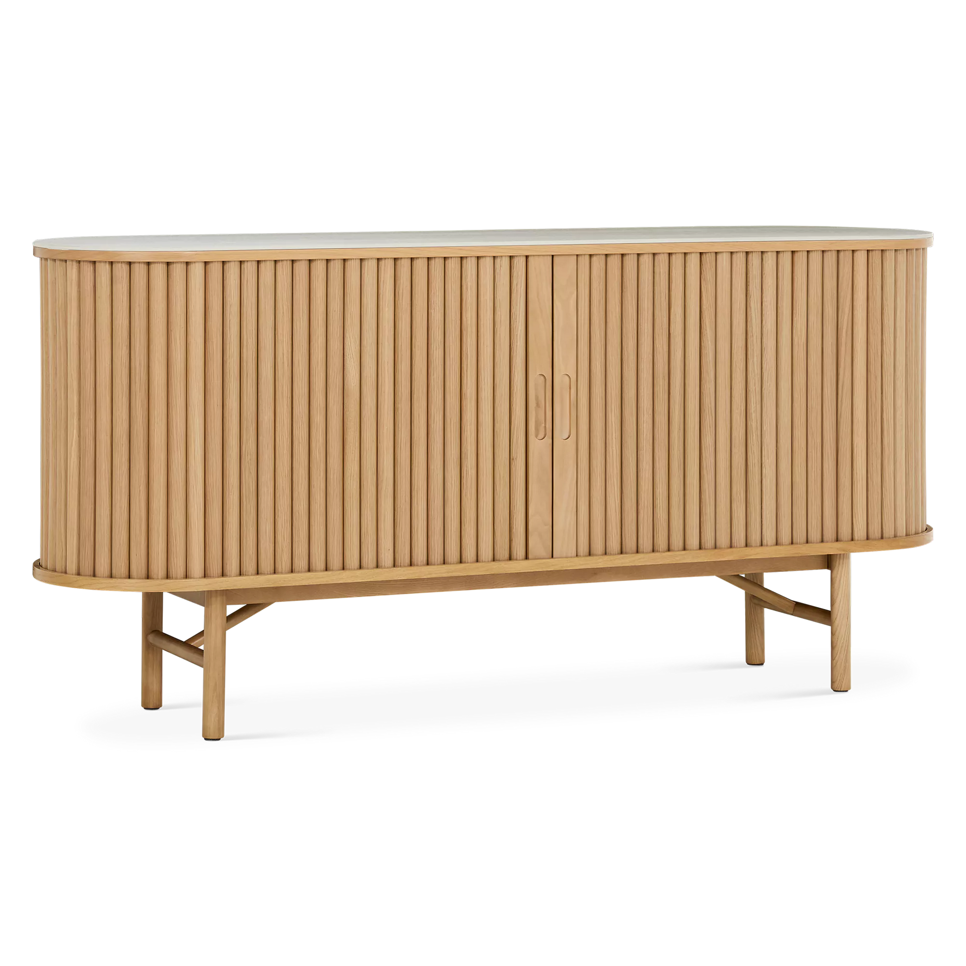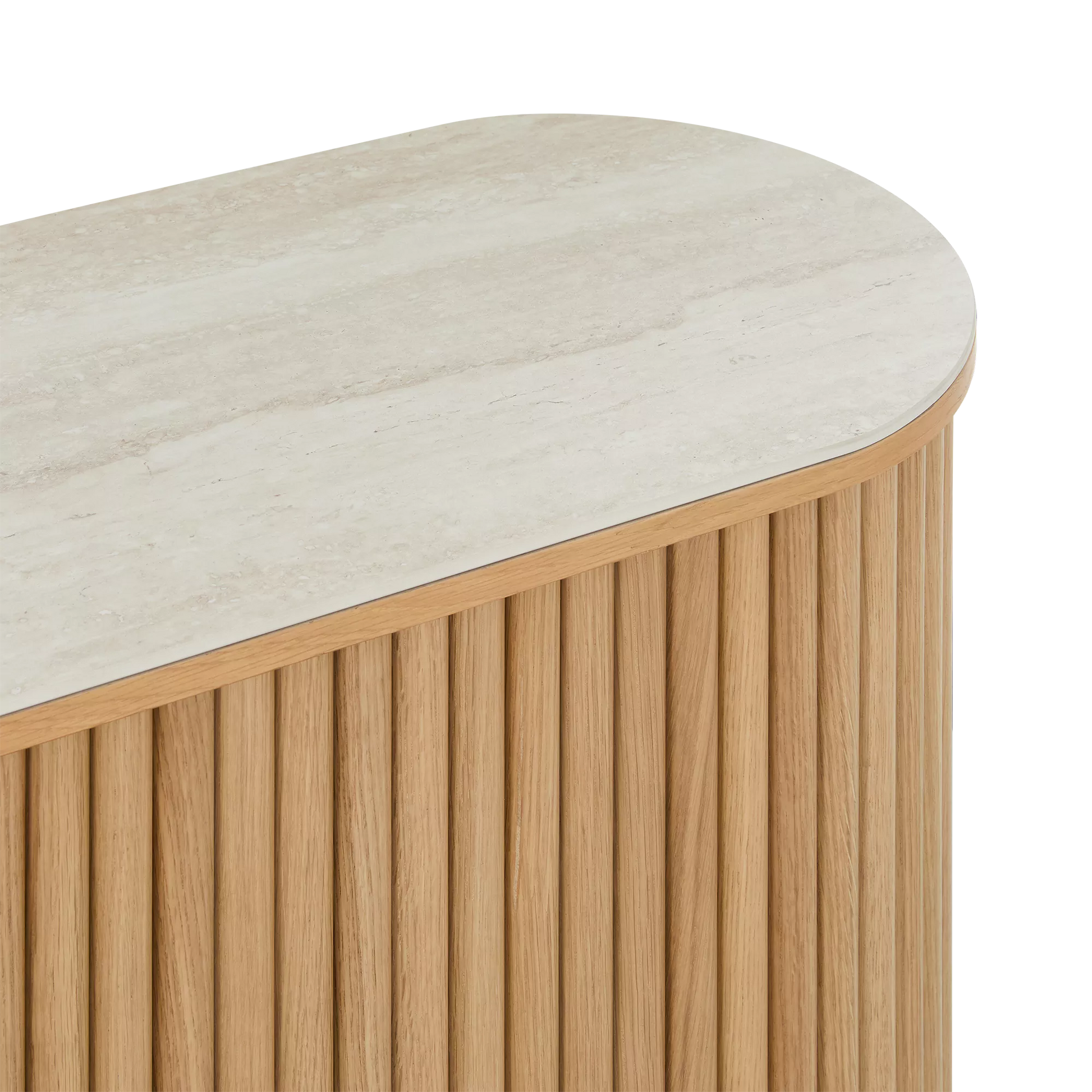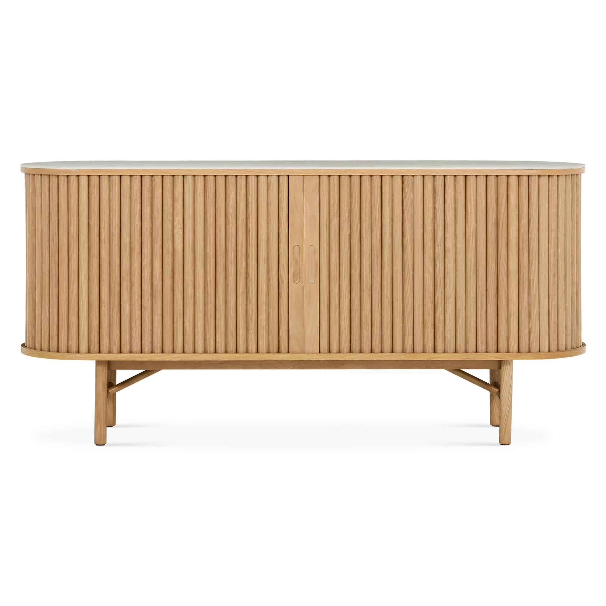 A sideboard with style. Elevated by matching wooden legs, the Rhode sideboard will add a charming and airy touch to any space. Its rounded design and tambour doors offer easy access to its four compartments for a seamless blend of subtle and functional style. With its natural oak veneer body and travertine-effect ceramic top, it will add natural warmth to any modern or Scandinavian–inspired décor.