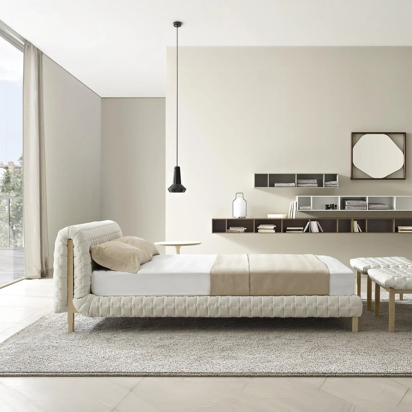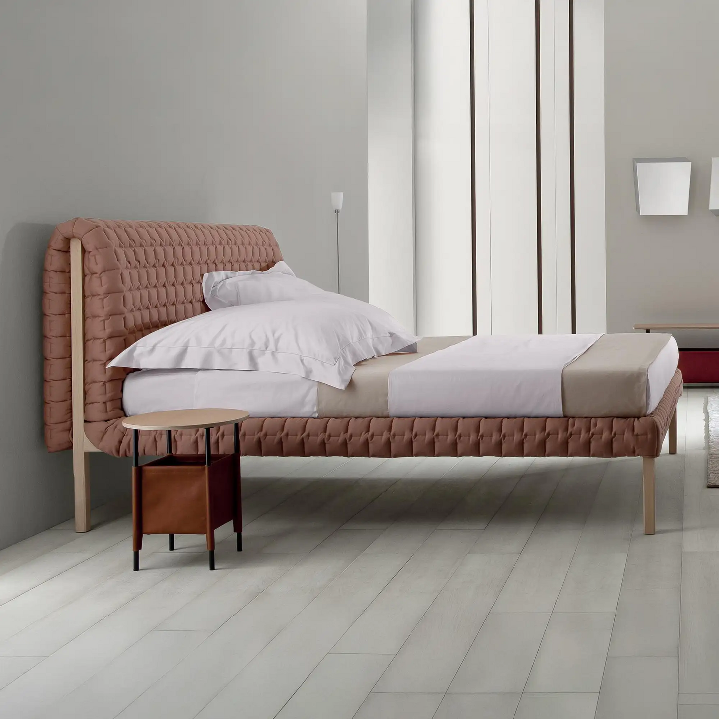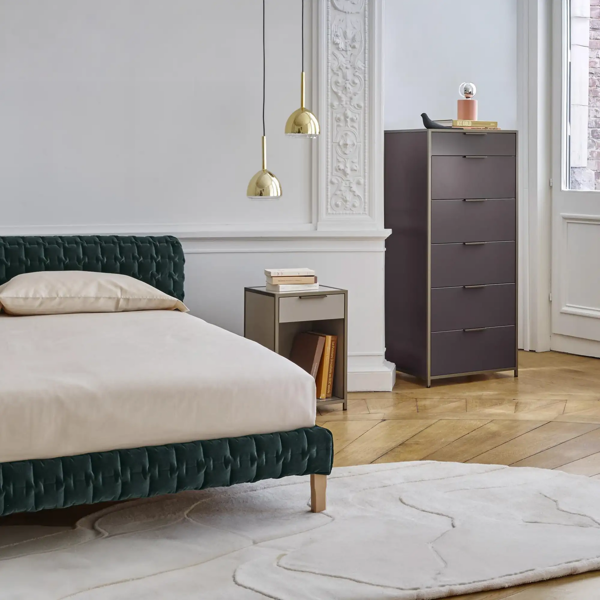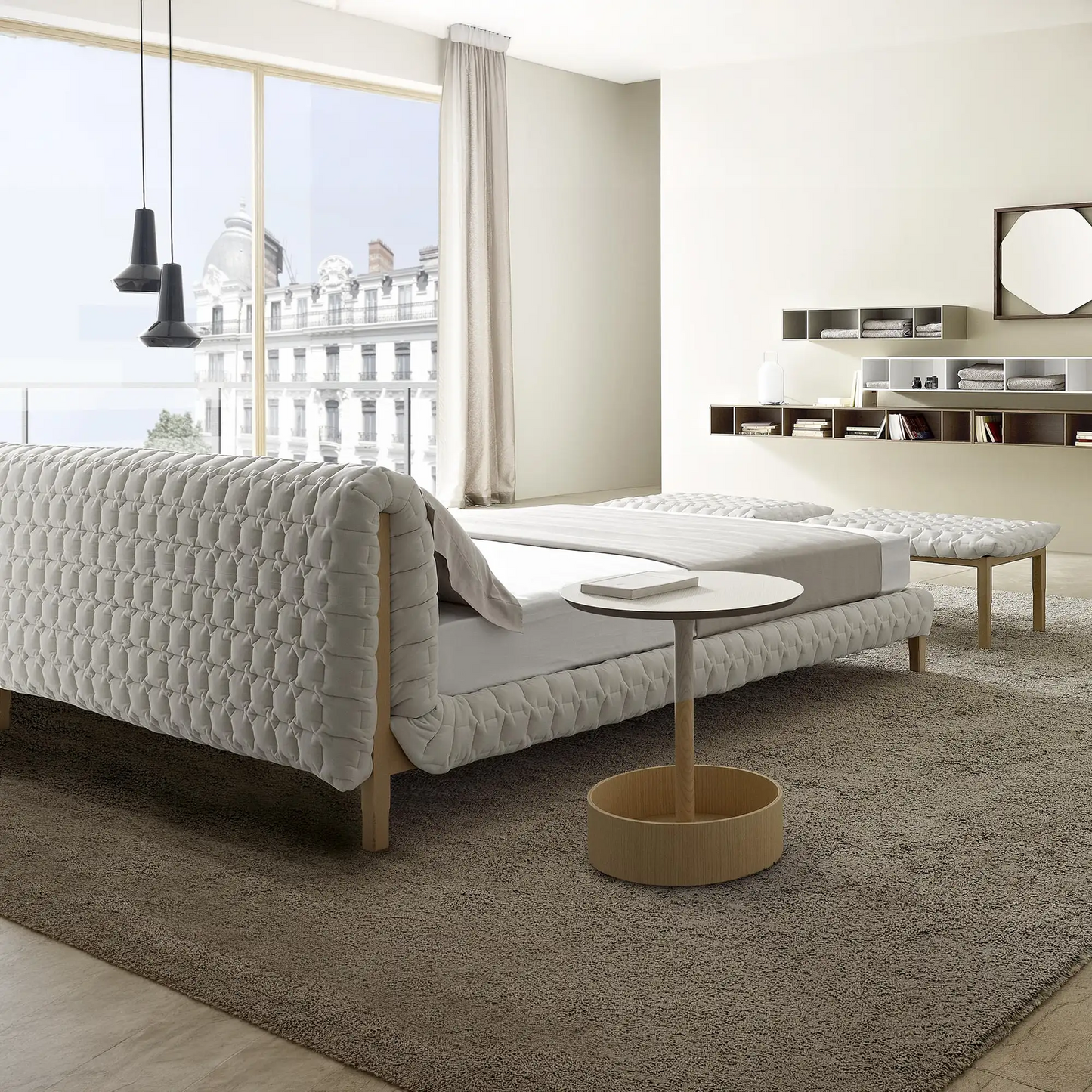To create the Ruché bed, Ligne Roset opted for the unusual combination of a classic solid beech structure and bold quilting, a signature of the brand’s expertise. The undulations of its duvet, affixed to its wooden frame, create a striking contrast between straight lines and soft, welcoming curves.